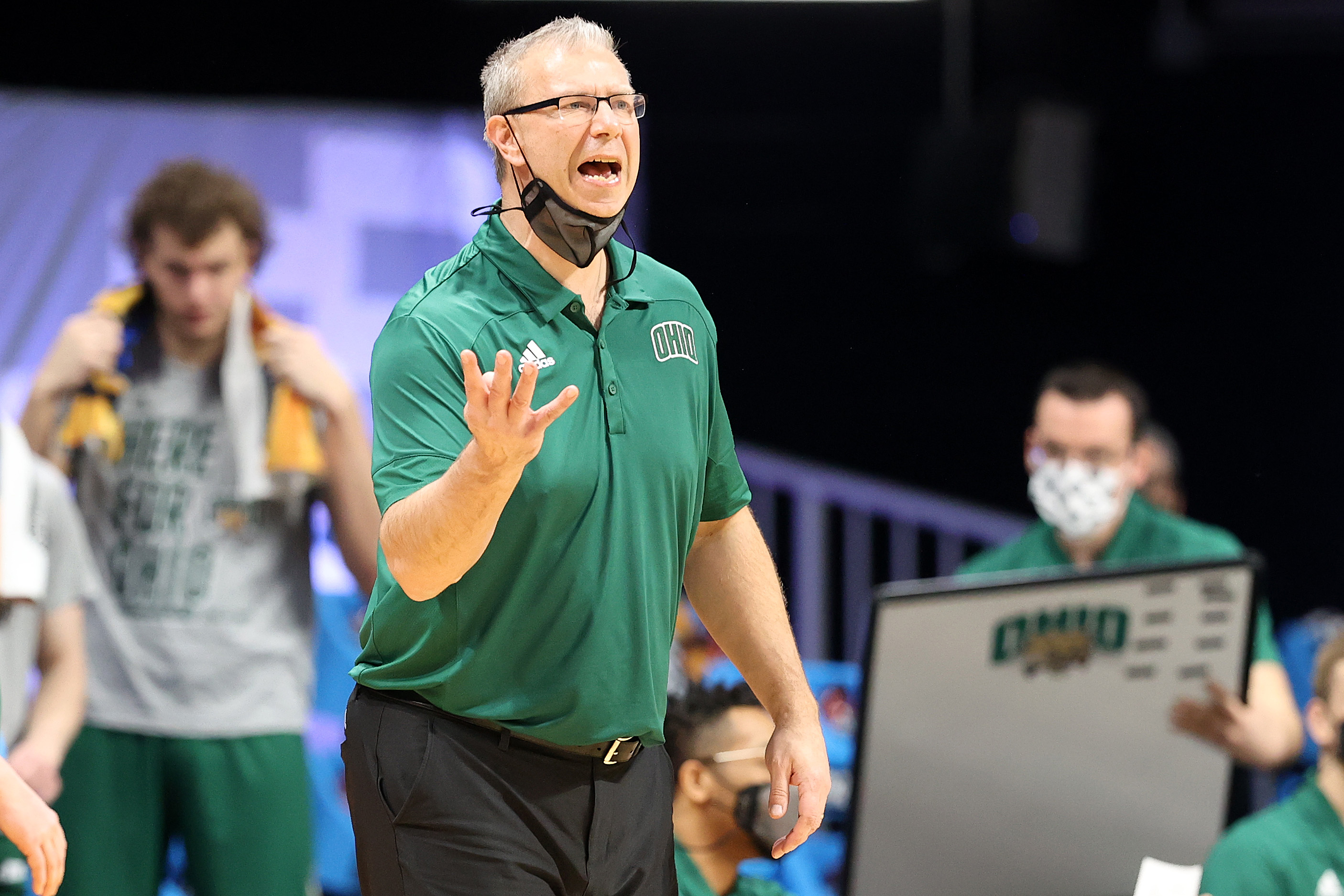 INDIANAPOLIS, INDIANA – MARCH 22: Head coach Jeff Boals of the Ohio Bobcats reacts in the first half of their second round game against the Creighton Bluejays in the 2021 NCAA Men’s Basketball Tournament at Hinkle Fieldhouse on March 22, 2021 in Indianapolis, Indiana. (Photo by Andy Lyons/Getty Images)