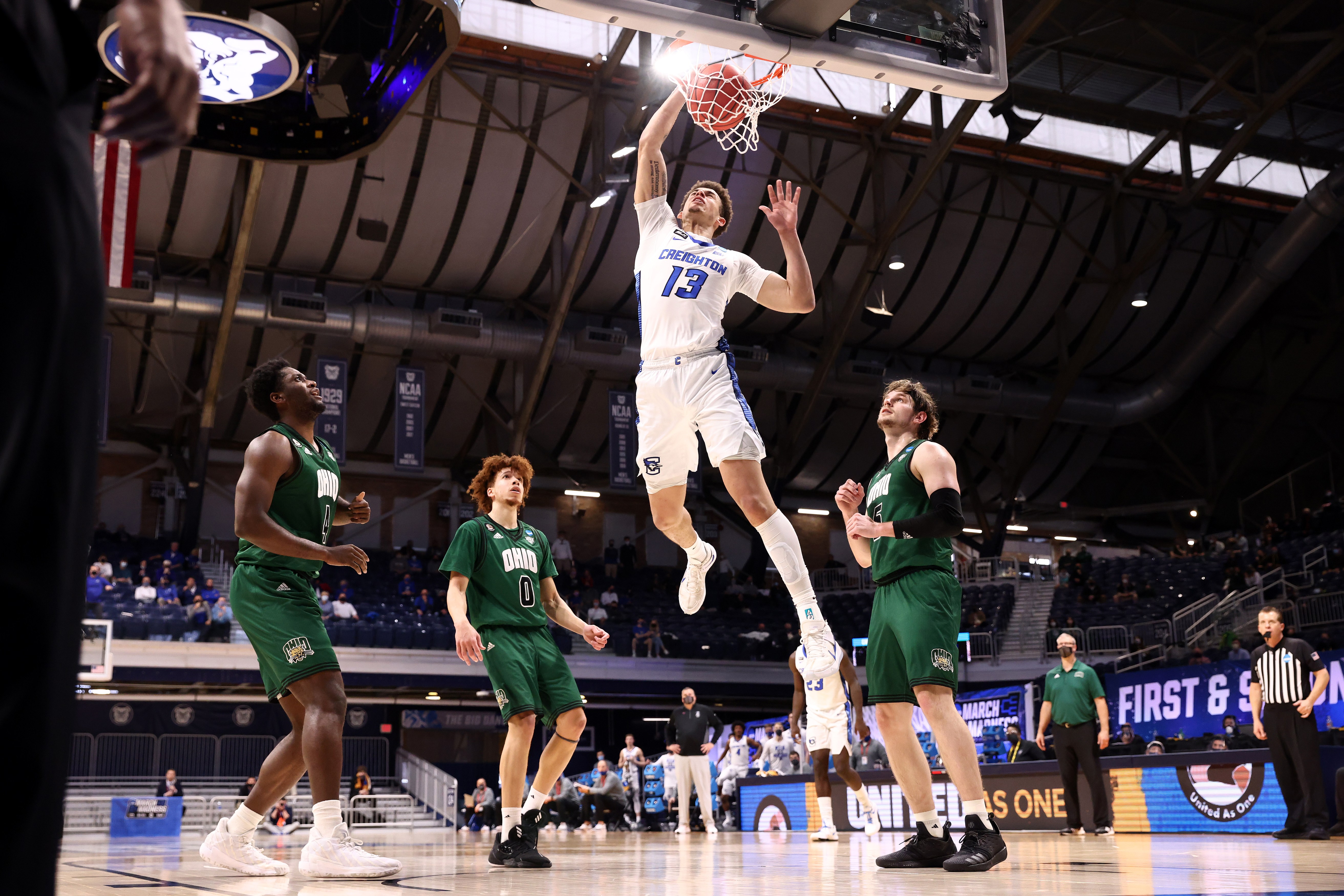 INDIANAPOLIS, INDIANA – MARCH 22: Christian Bishop #13 of the Creighton Bluejays dunks the ball against the Ohio Bobcats in the first half of their second round game of the 2021 NCAA Men’s Basketball Tournament at Hinkle Fieldhouse on March 22, 2021 in Indianapolis, Indiana. (Photo by Gregory Shamus/Getty Images)