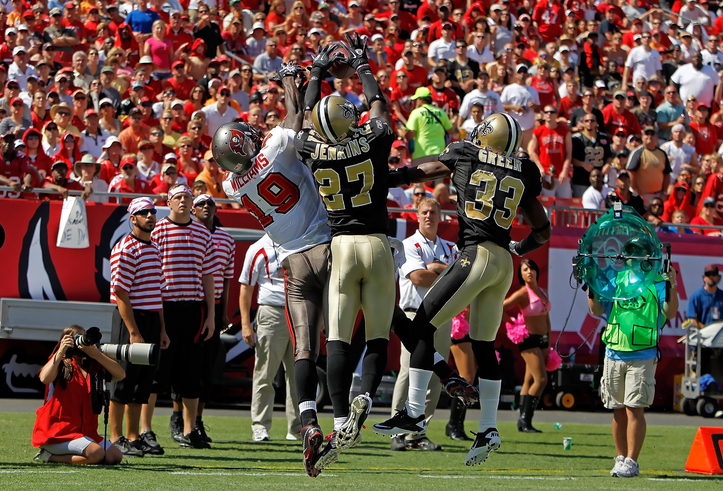 TAMPA, FL – OCTOBER 17: Defenders Malcolm Jenkins #27 and Jabari Greer #33 of the New Orleans Saints break up a pass intended for Mike Williams #19 of the Tampa Bay Buccaneers during the game at Raymond James Stadium on October 17, 2010 in Tampa, Florida. (Photo by J. Meric/Getty Images)