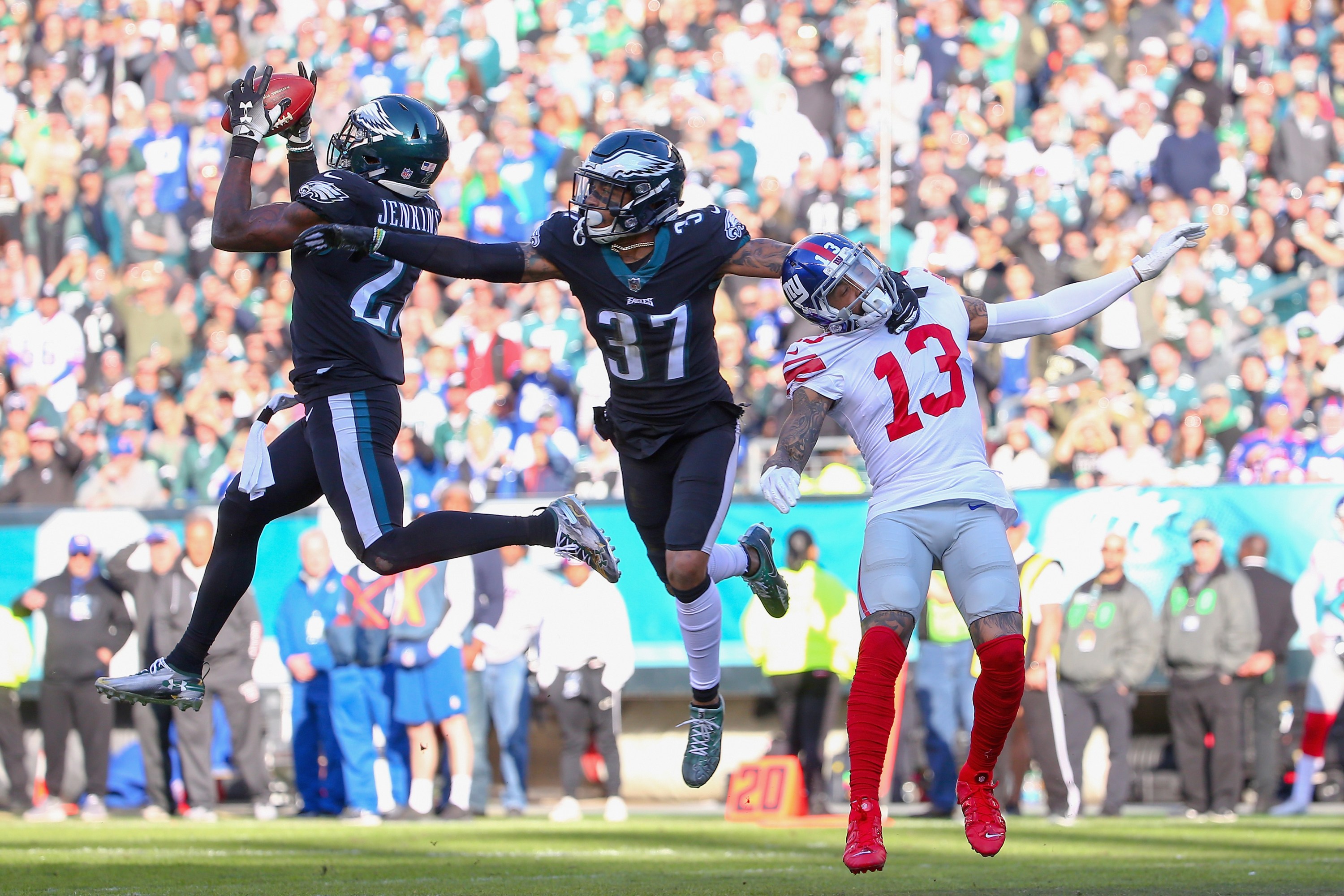 PHILADELPHIA, PA – NOVEMBER 25: Strong safety Malcolm Jenkins #27 of the Philadelphia Eagles intercepts a pass intended for wide receiver Odell Beckham #13 of the New York Giants during the second quarter at Lincoln Financial Field on November 25, 2018 in Philadelphia, Pennsylvania. (Photo by Mitchell Leff/Getty Images)