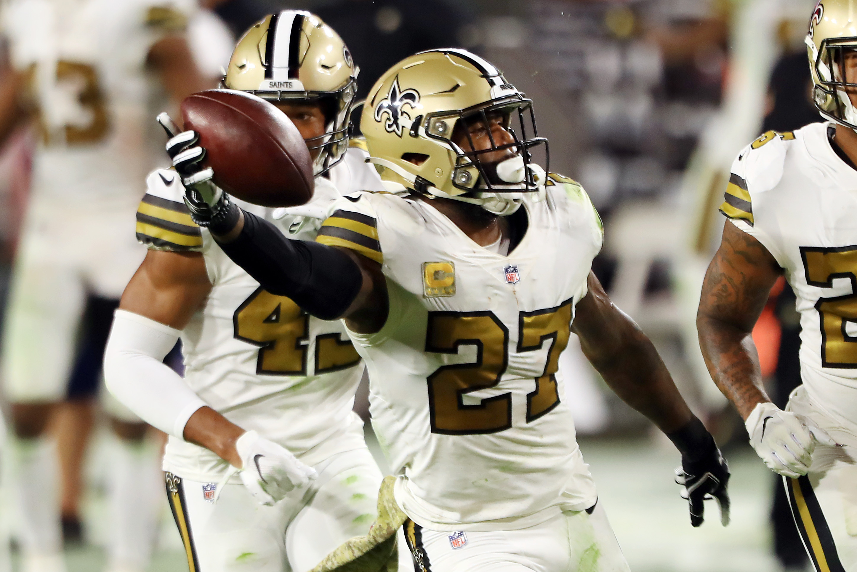 TAMPA, FLORIDA – NOVEMBER 08: Malcolm Jenkins #27 of the New Orleans Saints celebrates intercepting a pass during the third quarter against the Tampa Bay Buccaneers at Raymond James Stadium on November 08, 2020 in Tampa, Florida. (Photo by Mike Ehrmann/Getty Images)