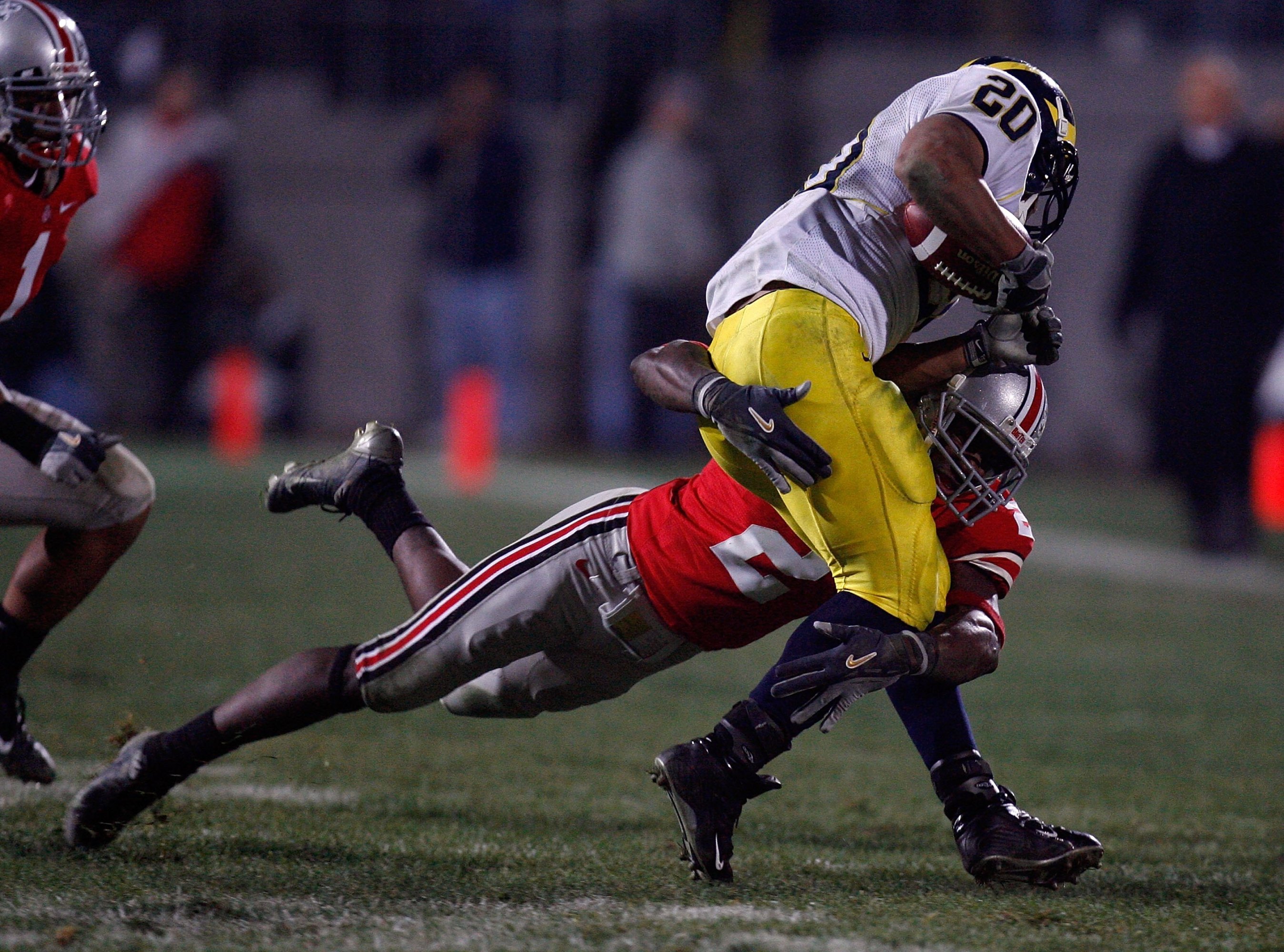 COLUMBUS, OH – NOVEMBER 18: Malcolm Jenkins #2 of the Ohio State Buckeyes tackles Mike Hart #20 of the Michigan Wolverines November 18, 2006 at Ohio Stadium in Columbus, Ohio. (Photo by Gregory Shamus/Getty Images)