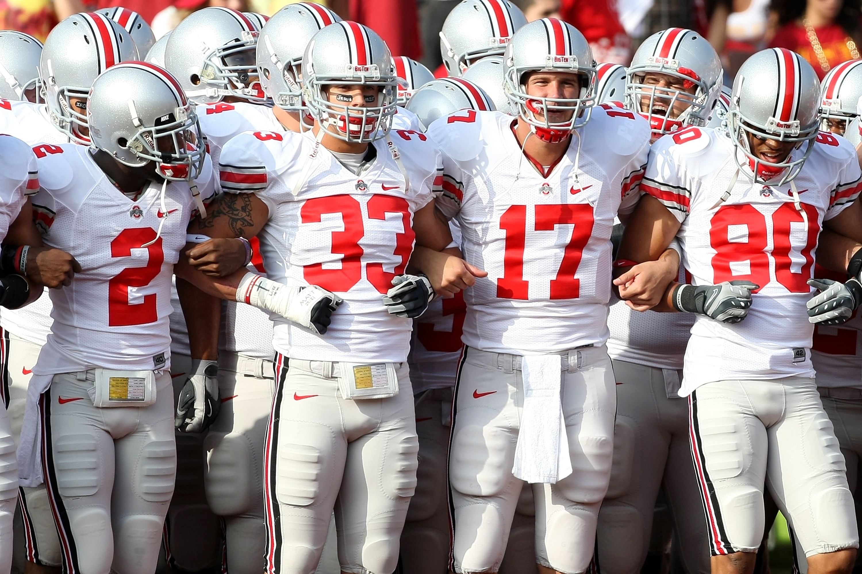 LOS ANGELES, CA – SEPTEMBER 13: Malcolm Jenkins #2, James Laurinaitis #33, Todd Boeckman #17 and Brian Robiskie #80 of the Ohio State Buckeyes gather before taking on the USC Trojans during the college football game at the Los Angeles Memorial Coliseum on September 13, 2008 in Los Angeles, California. (Photo by Harry How/Getty Images)