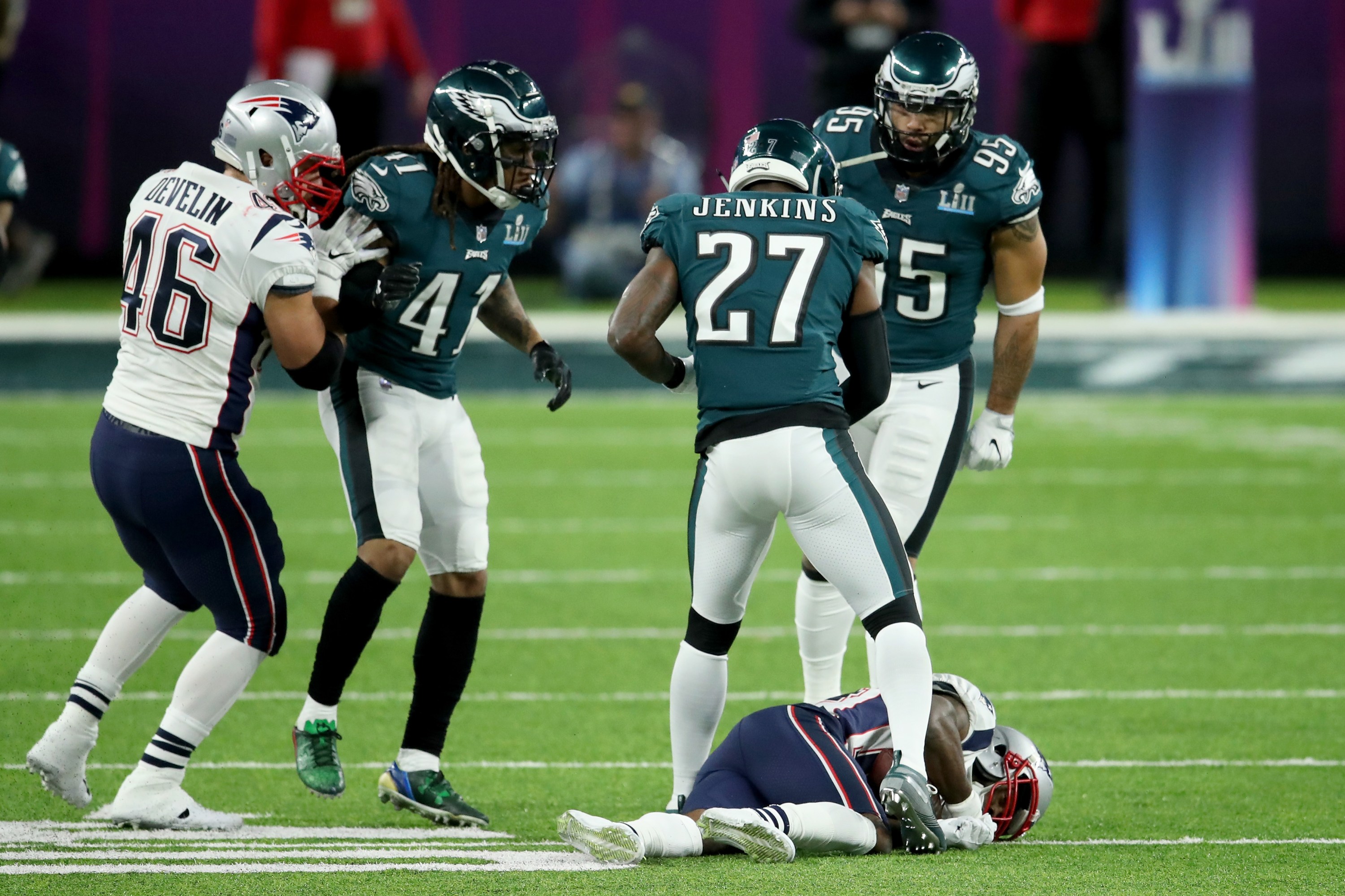 MINNEAPOLIS, MN – FEBRUARY 04: Malcolm Jenkins #27 of the Philadelphia Eagles stands over Brandin Cooks #14 of the New England Patriots after a tackle during the second quarter in Super Bowl LII at U.S. Bank Stadium on February 4, 2018 in Minneapolis, Minnesota. (Photo by Andy Lyons/Getty Images)
