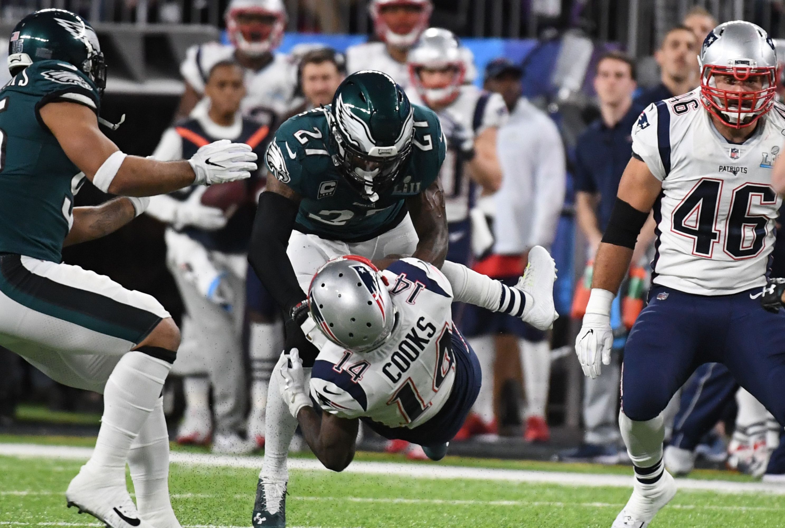 Brandin Cooks (14) of the Patriots is tackled by Malcolm Jenkins of the Eagles during Super Bowl LII between the New England Patriots and the Philadelphia Eagles at US Bank Stadium in Minneapolis, Minnesota, on February 4, 2018. / AFP PHOTO / TIMOTHY A. CLARY (Photo credit should read TIMOTHY A. CLARY/AFP via Getty Images)