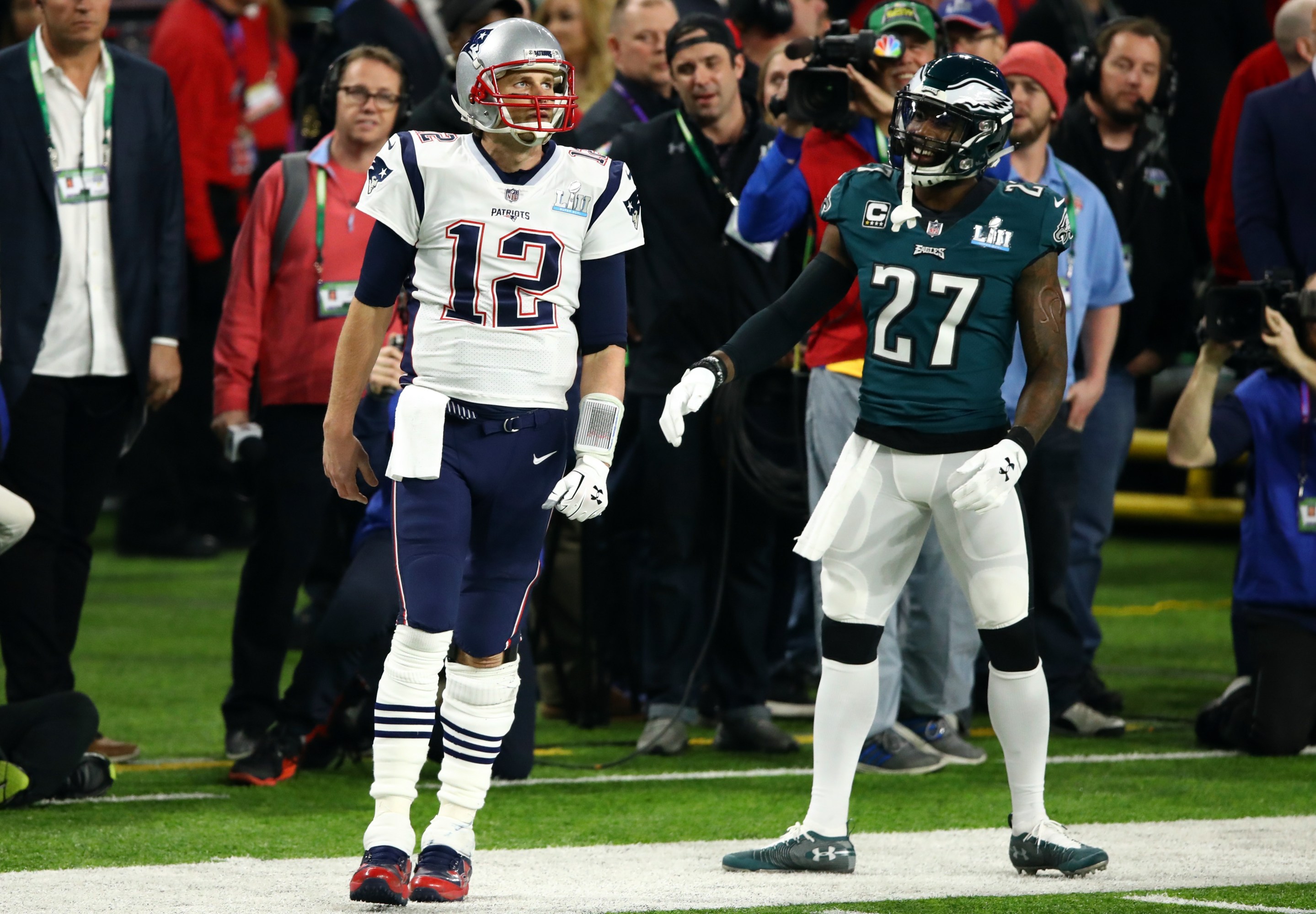 MINNEAPOLIS, MN – FEBRUARY 04: Tom Brady #12 of the New England Patriots and Malcolm Jenkins #27 of the Philadelphia Eagles react during the second quarter in Super Bowl LII at U.S. Bank Stadium on February 4, 2018 in Minneapolis, Minnesota. (Photo by Gregory Shamus/Getty Images)