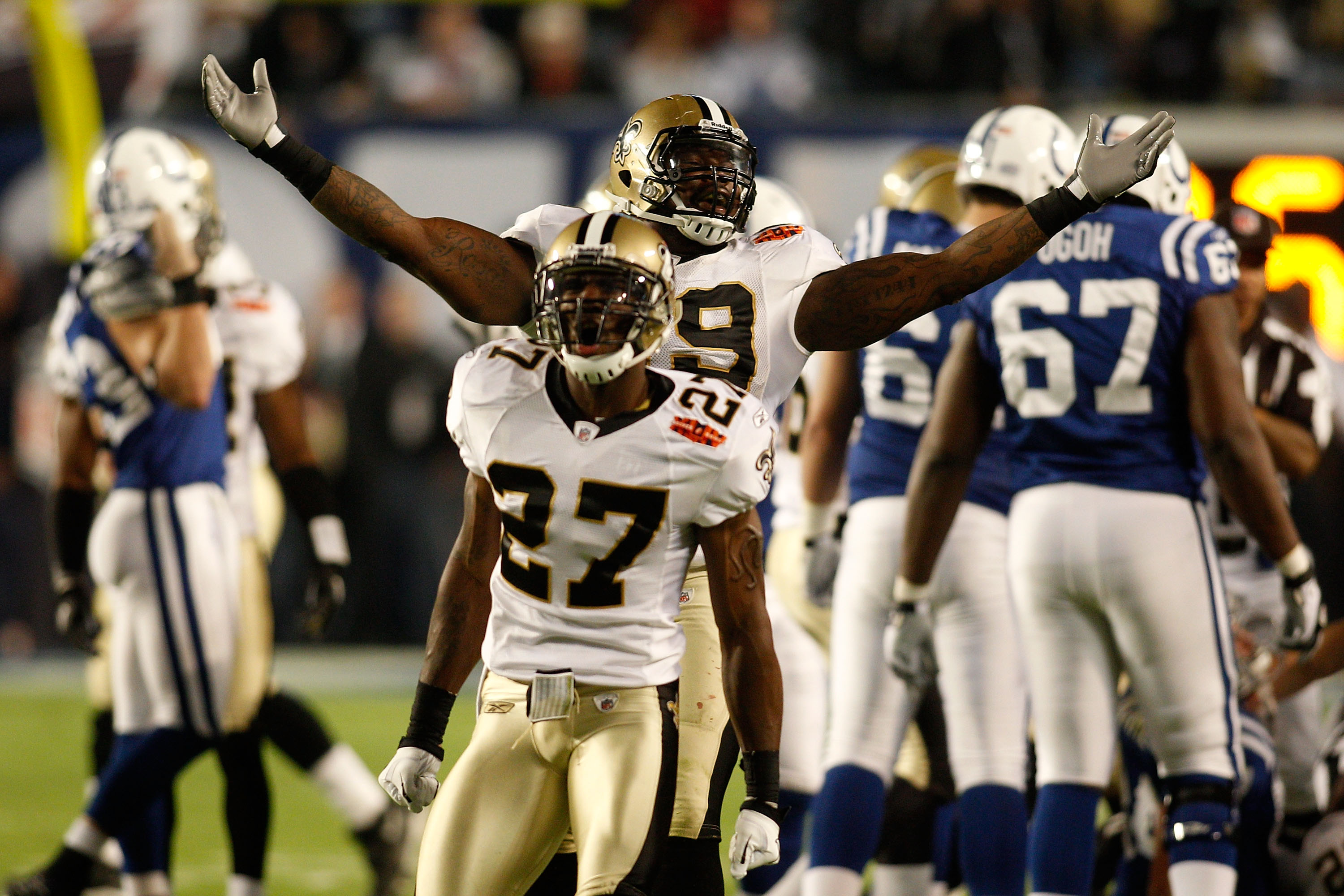 MIAMI GARDENS, FL – FEBRUARY 07: Malcolm Jenkins #27 and Anthony Hargrove #69 of the New Orleans Saints reacts after a onside kick to start the second half against the Indianapolis Colts during Super Bowl XLIV on February 7, 2010 at Sun Life Stadium in Miami Gardens, Florida. (Photo by Chris Graythen/Getty Images)