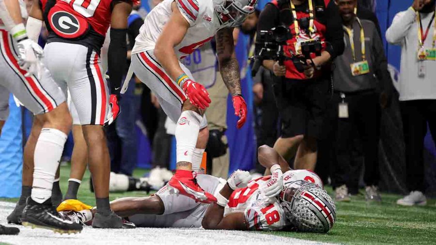 Before the injury, Harrison was having a monster game with five catches for 106 yards and two touchdowns. After his injury, the Buckeyes were outscored 18-3 in their heartbreaking 42-41 loss to the Bulldogs.