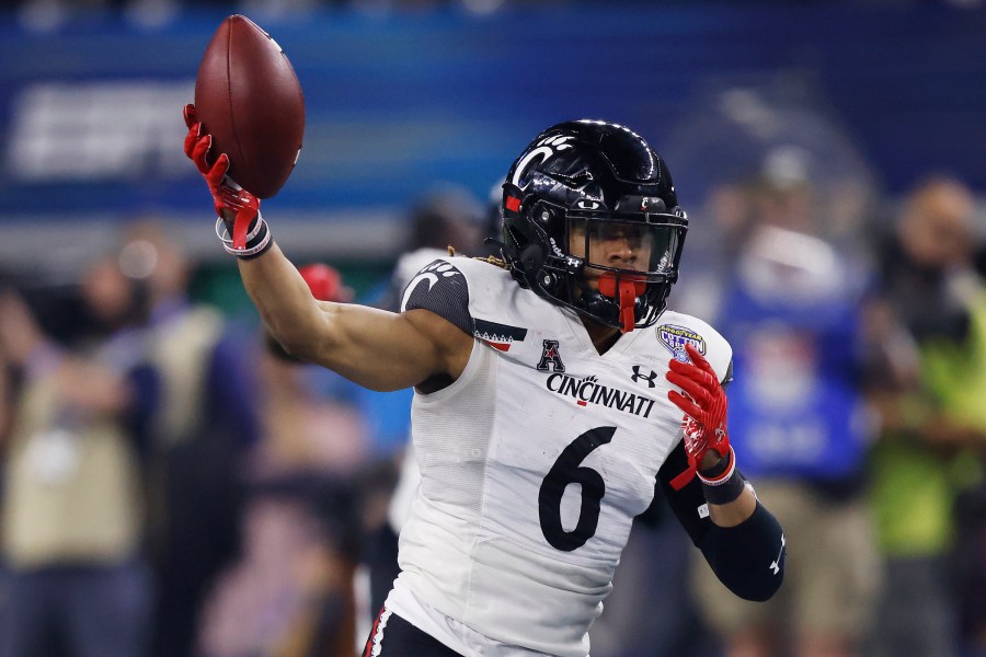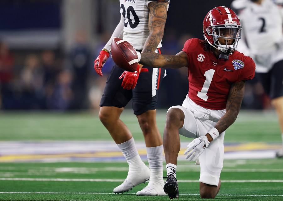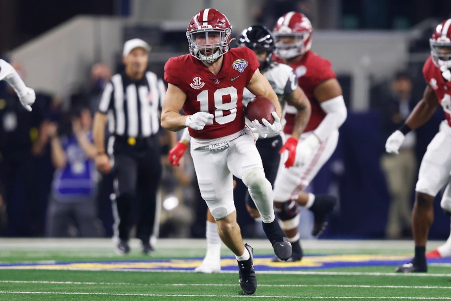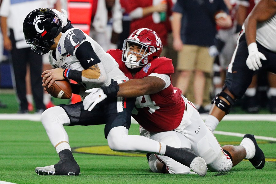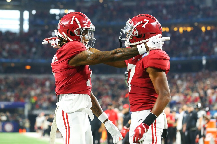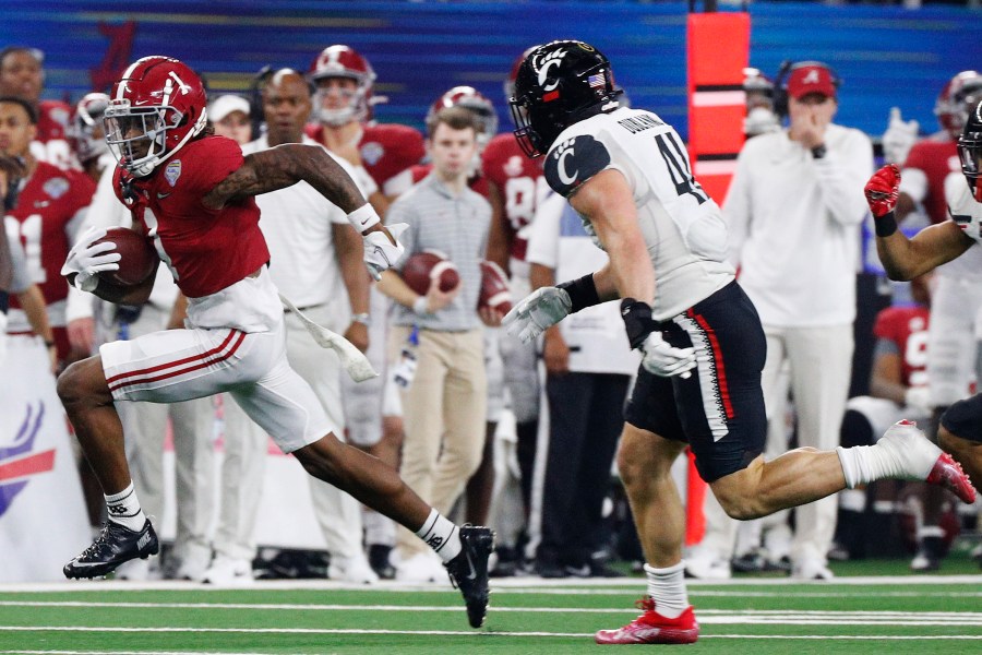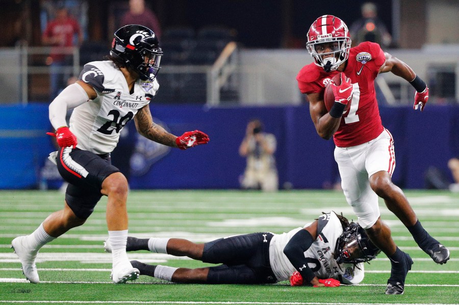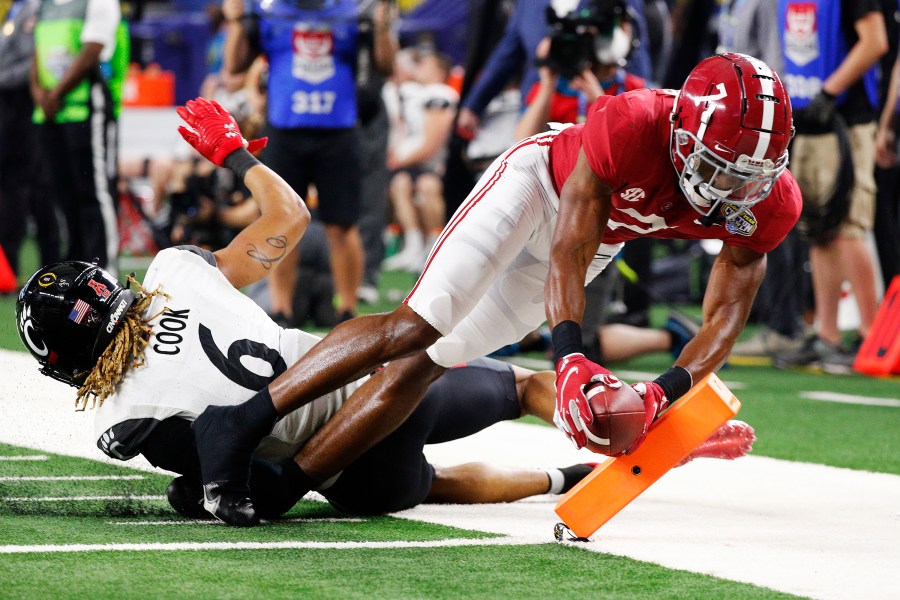 ARLINGTON, TEXAS – DECEMBER 31: Head coach Luke Fickell of the Cincinnati Bearcats looks on against the Alabama Crimson Tide during the first half in the Goodyear Cotton Bowl Classic for the College Football Playoff semifinal game at AT&T Stadium on December 31, 2021 in Arlington, Texas. (Photo by Richard Rodriguez/Getty Images) ARLINGTON, TEXAS – DECEMBER 31: Bryce Young #9 of the Alabama Crimson Tide throws a pass as Deshawn Pace #20 of the Cincinnati Bearcats pressures him during the second quarter in the Goodyear Cotton Bowl Classic for the College Football Playoff semifinal game at AT&T Stadium on December 31, 2021 in Arlington, Texas. (Photo by Ron Jenkins/Getty Images) ARLINGTON, TEXAS – DECEMBER 31: Christian Harris #8 of the Alabama Crimson Tide sacks Desmond Ridder #9 of the Cincinnati Bearcats during the third quarter in the Goodyear Cotton Bowl Classic for the College Football Playoff semifinal game at AT&T Stadium on December 31, 2021 in Arlington, Texas. (Photo by Carmen Mandato/Getty Images) ARLINGTON, TEXAS – DECEMBER 31: Christian Harris #8 of the Alabama Crimson Tide sacks Desmond Ridder #9 of the Cincinnati Bearcats during the third quarter in the Goodyear Cotton Bowl Classic for the College Football Playoff semifinal game at AT&T Stadium on December 31, 2021 in Arlington, Texas. (Photo by Richard Rodriguez/Getty Images) ARLINGTON, TEXAS – DECEMBER 31: Bryan Cook #6 of the Cincinnati Bearcats catches the ball for an interception against the Alabama Crimson Tide during the third quarter in the Goodyear Cotton Bowl Classic for the College Football Playoff semifinal game at AT&T Stadium on December 31, 2021 in Arlington, Texas. (Photo by Ron Jenkins/Getty Images) ARLINGTON, TEXAS – DECEMBER 31: Ja’Corey Brooks #7 of the Alabama Crimson Tide scores a touchdown against the Cincinnati Bearcats during the second quarter in the Goodyear Cotton Bowl Classic for the College Football Playoff semifinal game at AT&T Stadium on December 31, 2021 in Arlington, Texas. (Photo by Richard Rodriguez/Getty Images) ARLINGTON, TEXAS – DECEMBER 31: Ja’Corey Brooks #7 of the Alabama Crimson Tide celebrates his touchdown against the Cincinnati Bearcats during the second quarter in the Goodyear Cotton Bowl Classic for the College Football Playoff semifinal game at AT&T Stadium on December 31, 2021 in Arlington, Texas. (Photo by Richard Rodriguez/Getty Images) ARLINGTON, TEXAS – DECEMBER 31: Ja’Corey Brooks #7 of the Alabama Crimson Tide celebrates his touchdown with Jameson Williams #1 of the Alabama Crimson Tide during the second quarter against the Cincinnati Bearcats in the Goodyear Cotton Bowl Classic for the College Football Playoff semifinal game at AT&T Stadium on December 31, 2021 in Arlington, Texas. (Photo by Richard Rodriguez/Getty Images) ARLINGTON, TEXAS – DECEMBER 31: Brian Robinson Jr. #4 of the Alabama Crimson Tide stiff arms Arquon Bush #9 of the Cincinnati Bearcats during the second quarter in the Goodyear Cotton Bowl Classic for the College Football Playoff semifinal game at AT&T Stadium on December 31, 2021 in Arlington, Texas. (Photo by Carmen Mandato/Getty Images) ARLINGTON, TEXAS – DECEMBER 31: Ja’Corey Brooks #7 of the Alabama Crimson Tide carries the ball against the Cincinnati Bearcats during the second quarter in the Goodyear Cotton Bowl Classic for the College Football Playoff semifinal game at AT&T Stadium on December 31, 2021 in Arlington, Texas. (Photo by Richard Rodriguez/Getty Images) ARLINGTON, TEXAS – DECEMBER 31: Jameson Williams #1 of the Alabama Crimson Tide carries the ball against the Cincinnati Bearcats during the second quarter in the Goodyear Cotton Bowl Classic for the College Football Playoff semifinal game at AT&T Stadium on December 31, 2021 in Arlington, Texas. (Photo by Richard Rodriguez/Getty Images) ARLINGTON, TEXAS – DECEMBER 31: DJ Dale #94 of the Alabama Crimson Tide sacks Desmond Ridder #9 of the Cincinnati Bearcats during the second quarter in the Goodyear Cotton Bowl Classic for the College Football Playoff semifinal game at AT&T Stadium on December 31, 2021 in Arlington, Texas. (Photo by Richard Rodriguez/Getty Images) ARLINGTON, TEXAS – DECEMBER 31: Jameson Williams #1 of the Alabama Crimson Tide reacts after a reception against the Cincinnati Bearcats during the first half in the Goodyear Cotton Bowl Classic for the College Football Playoff semifinal game at AT&T Stadium on December 31, 2021 in Arlington, Texas. (Photo by Ron Jenkins/Getty Images) ARLINGTON, TEXAS – DECEMBER 31: Slade Bolden #18 of the Alabama Crimson Tide carries the ball after a reception against the Cincinnati Bearcats during the first half in the Goodyear Cotton Bowl Classic for the College Football Playoff semifinal game at AT&T Stadium on December 31, 2021 in Arlington, Texas. (Photo by Ron Jenkins/Getty Images)