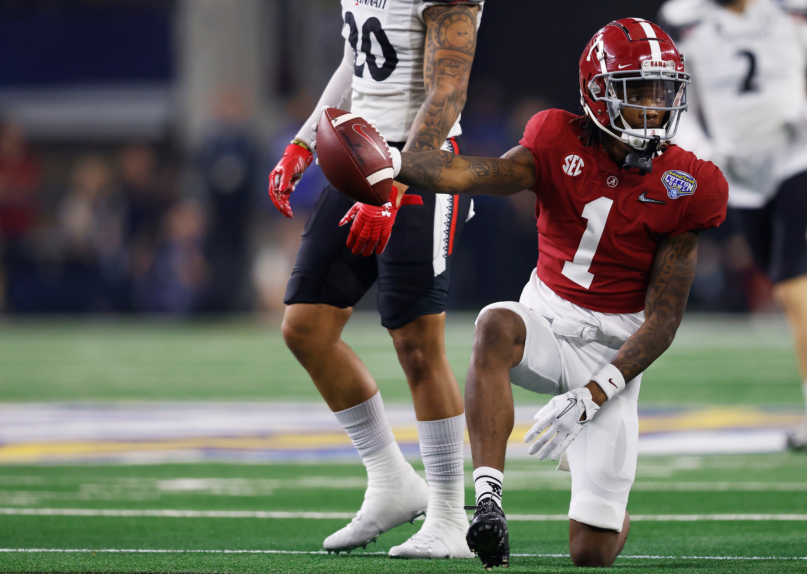 ARLINGTON, TEXAS – DECEMBER 31: Slade Bolden #18 of the Alabama Crimson Tide carries the ball after a reception against the Cincinnati Bearcats during the first half in the Goodyear Cotton Bowl Classic for the College Football Playoff semifinal game at AT&T Stadium on December 31, 2021 in Arlington, Texas. (Photo by Ron Jenkins/Getty Images)
