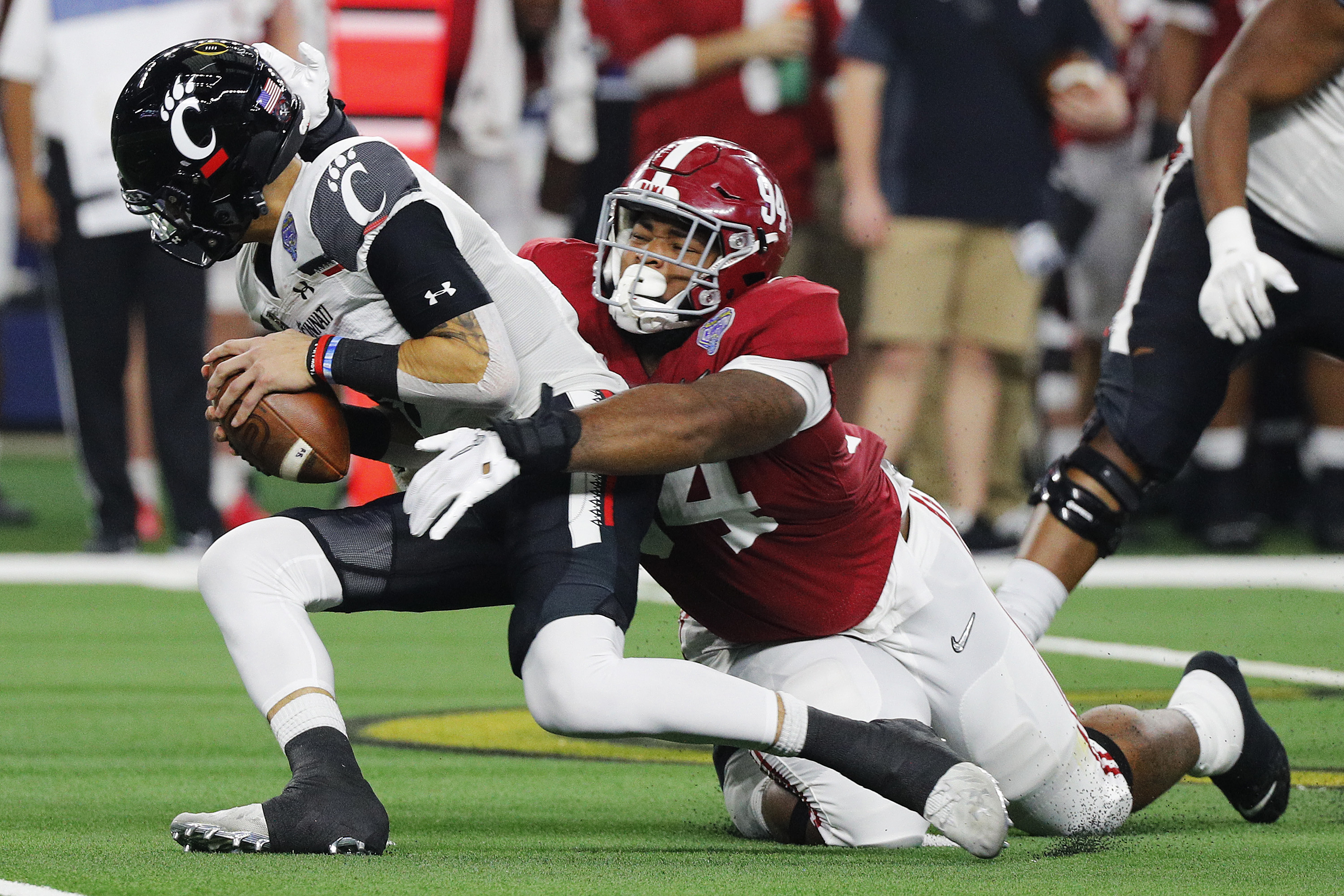 ARLINGTON, TEXAS – DECEMBER 31: DJ Dale #94 of the Alabama Crimson Tide sacks Desmond Ridder #9 of the Cincinnati Bearcats during the second quarter in the Goodyear Cotton Bowl Classic for the College Football Playoff semifinal game at AT&T Stadium on December 31, 2021 in Arlington, Texas. (Photo by Richard Rodriguez/Getty Images)