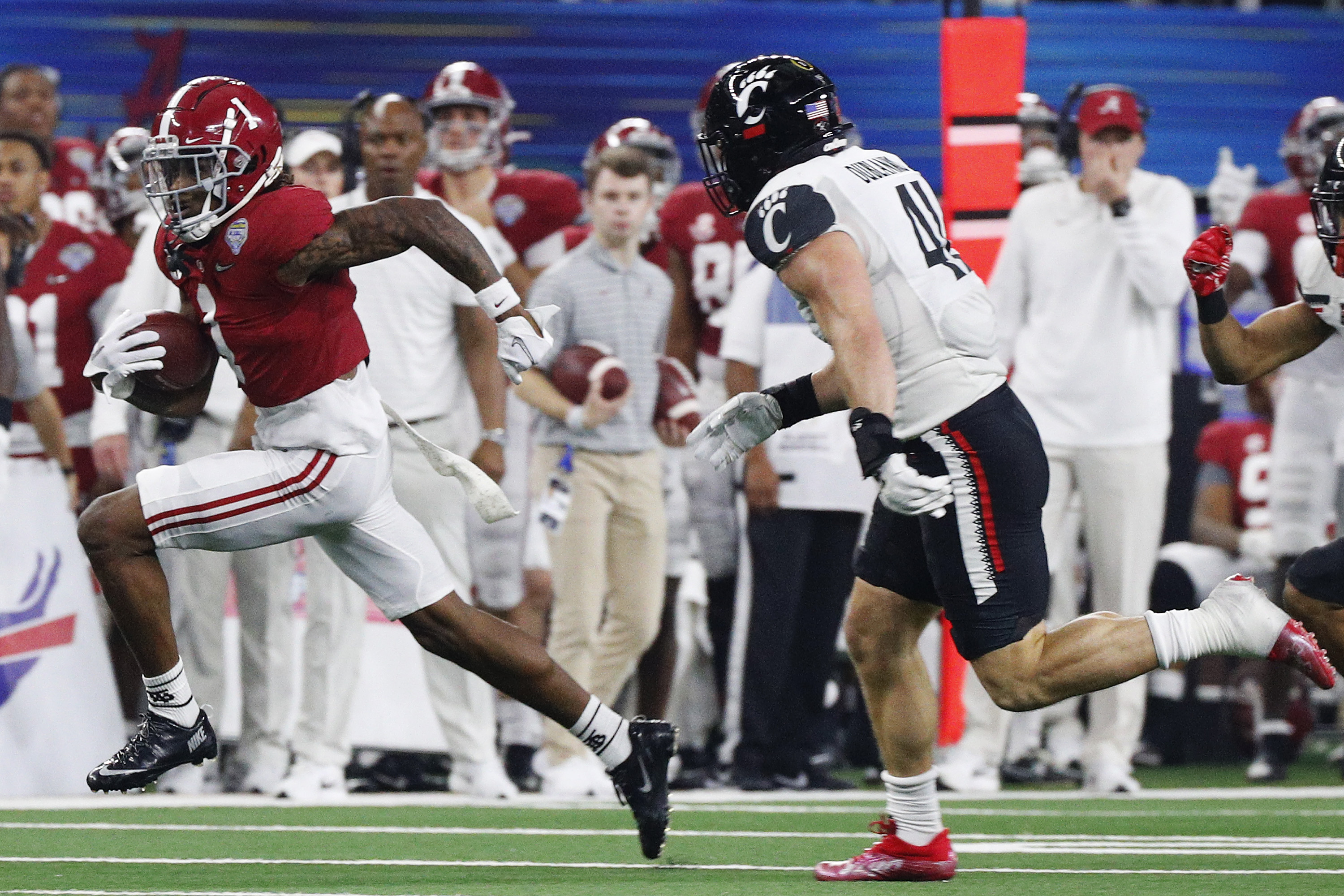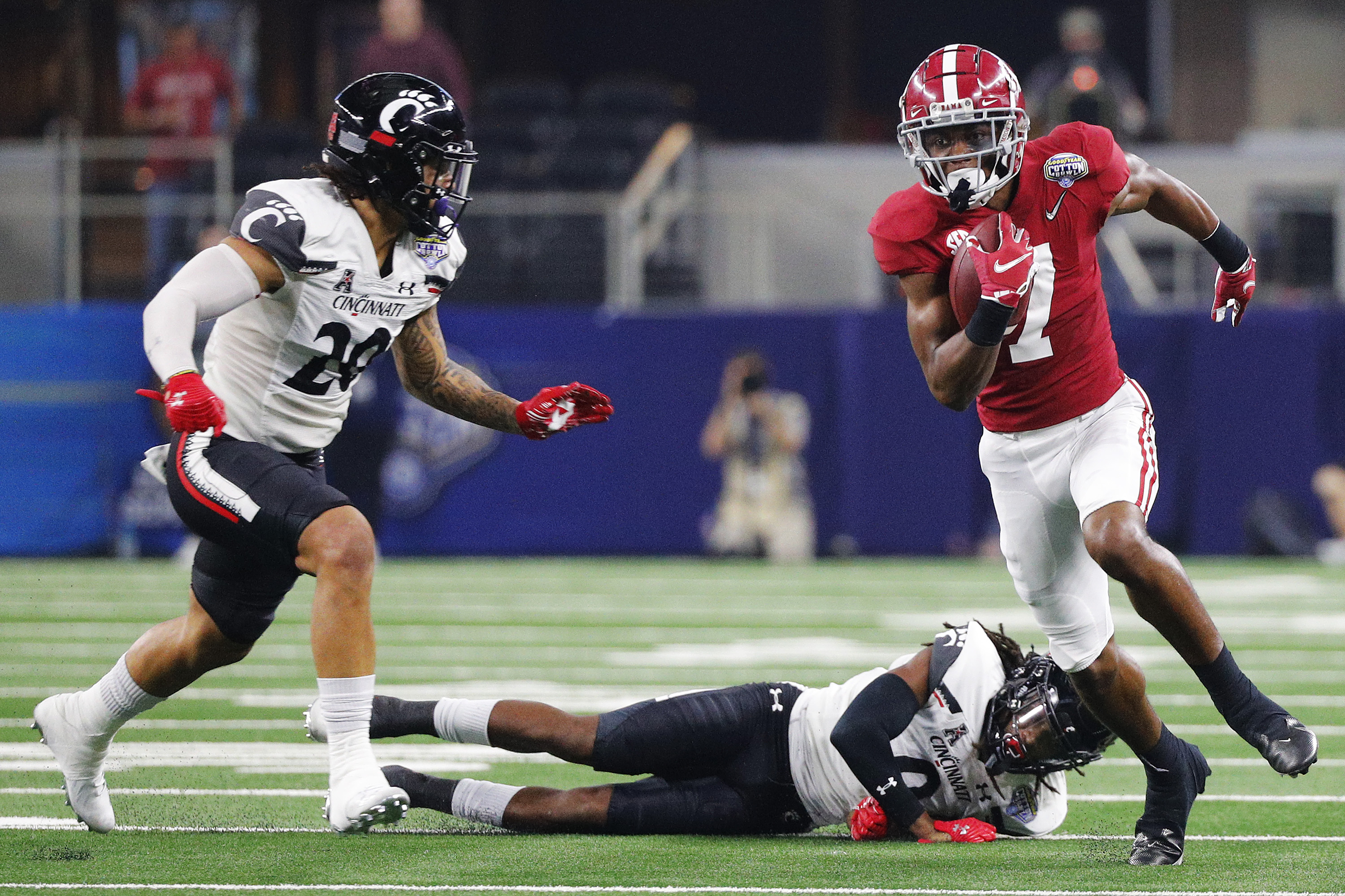 ARLINGTON, TEXAS – DECEMBER 31: Jameson Williams #1 of the Alabama Crimson Tide carries the ball against the Cincinnati Bearcats during the second quarter in the Goodyear Cotton Bowl Classic for the College Football Playoff semifinal game at AT&T Stadium on December 31, 2021 in Arlington, Texas. (Photo by Richard Rodriguez/Getty Images)