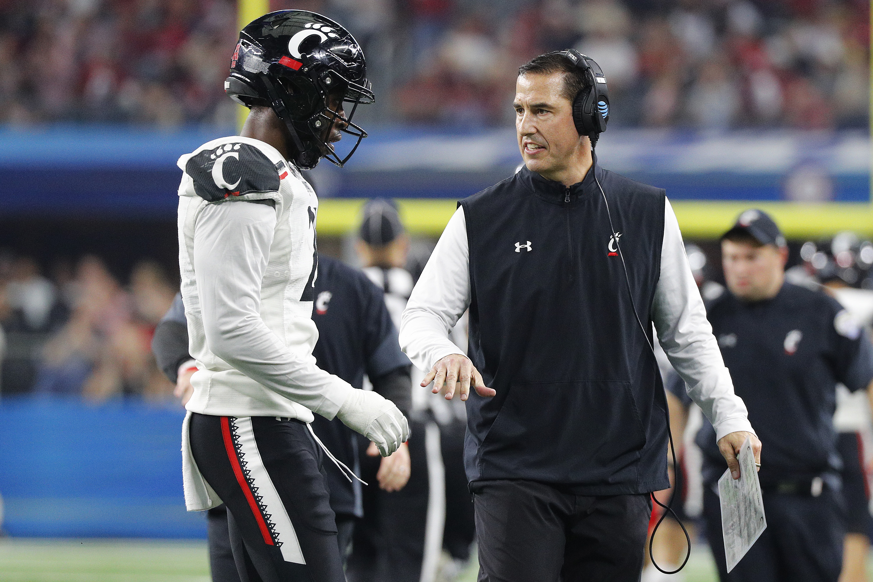 ARLINGTON, TEXAS – DECEMBER 31: Head coach Luke Fickell of the Cincinnati Bearcats looks on against the Alabama Crimson Tide during the first half in the Goodyear Cotton Bowl Classic for the College Football Playoff semifinal game at AT&T Stadium on December 31, 2021 in Arlington, Texas. (Photo by Richard Rodriguez/Getty Images)