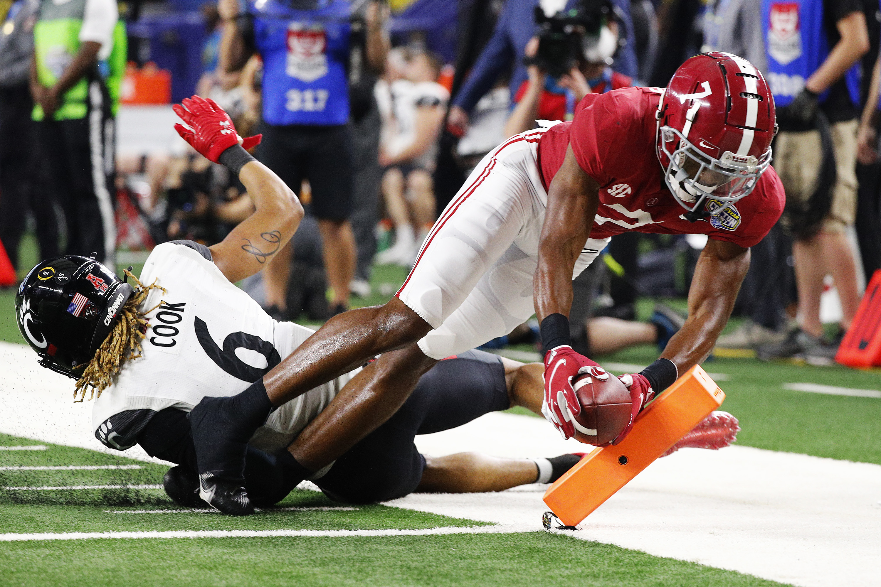ARLINGTON, TEXAS – DECEMBER 31: Ja’Corey Brooks #7 of the Alabama Crimson Tide scores a touchdown against the Cincinnati Bearcats during the second quarter in the Goodyear Cotton Bowl Classic for the College Football Playoff semifinal game at AT&T Stadium on December 31, 2021 in Arlington, Texas. (Photo by Richard Rodriguez/Getty Images)