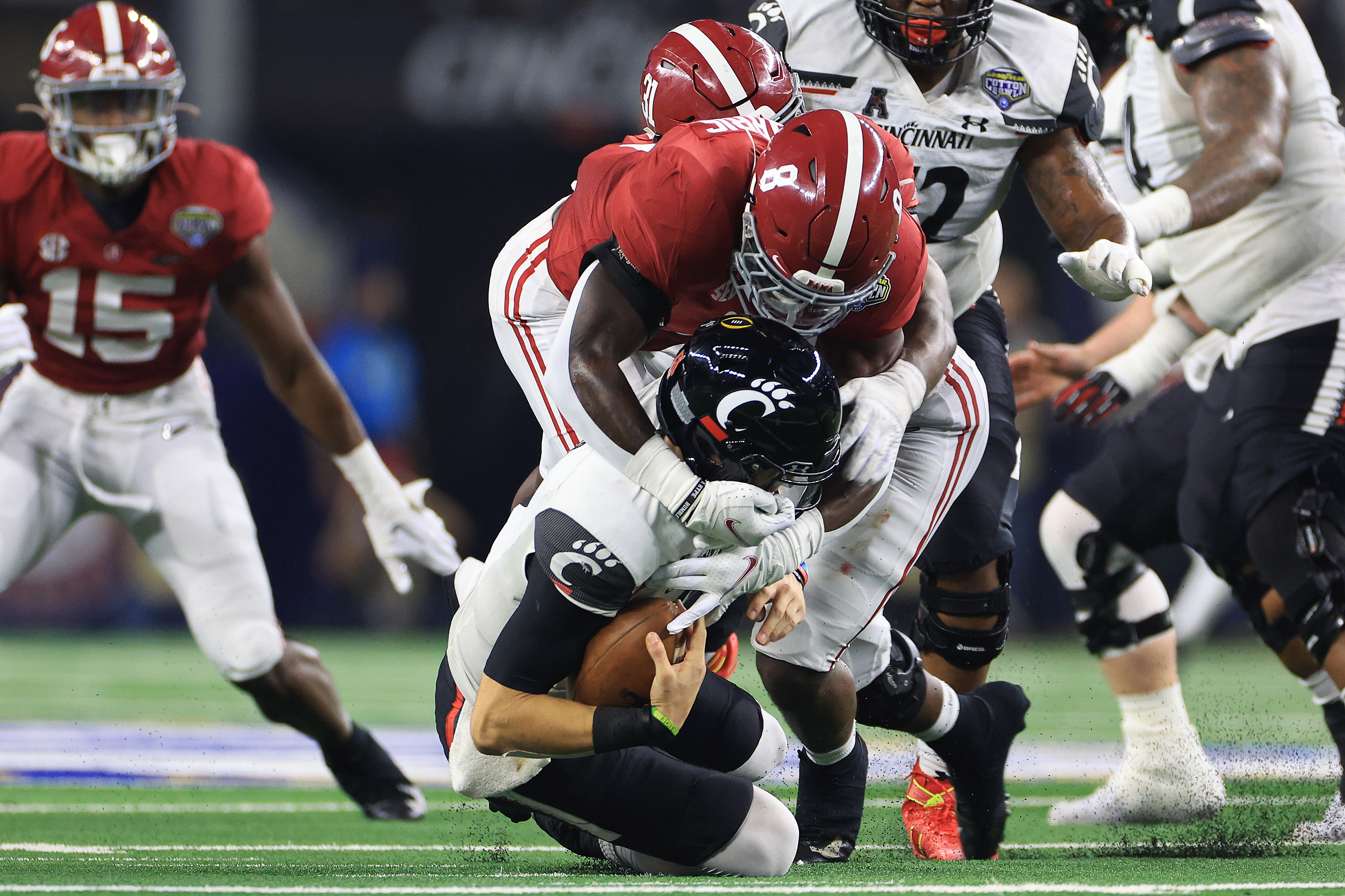 ARLINGTON, TEXAS – DECEMBER 31: Christian Harris #8 of the Alabama Crimson Tide sacks Desmond Ridder #9 of the Cincinnati Bearcats during the third quarter in the Goodyear Cotton Bowl Classic for the College Football Playoff semifinal game at AT&T Stadium on December 31, 2021 in Arlington, Texas. (Photo by Carmen Mandato/Getty Images)