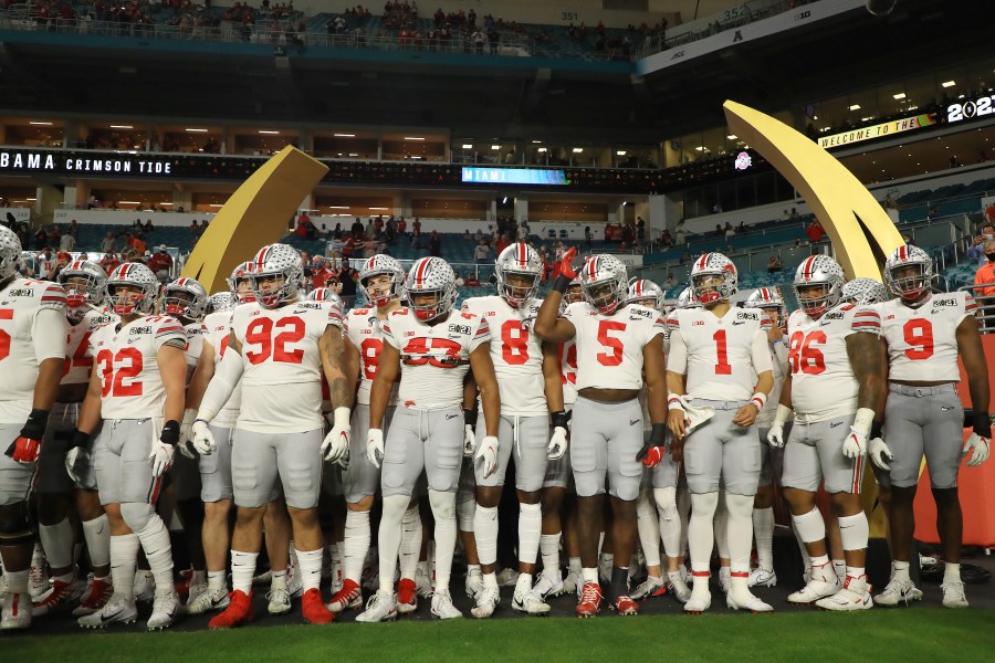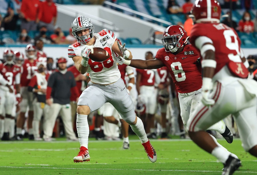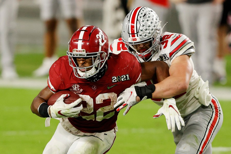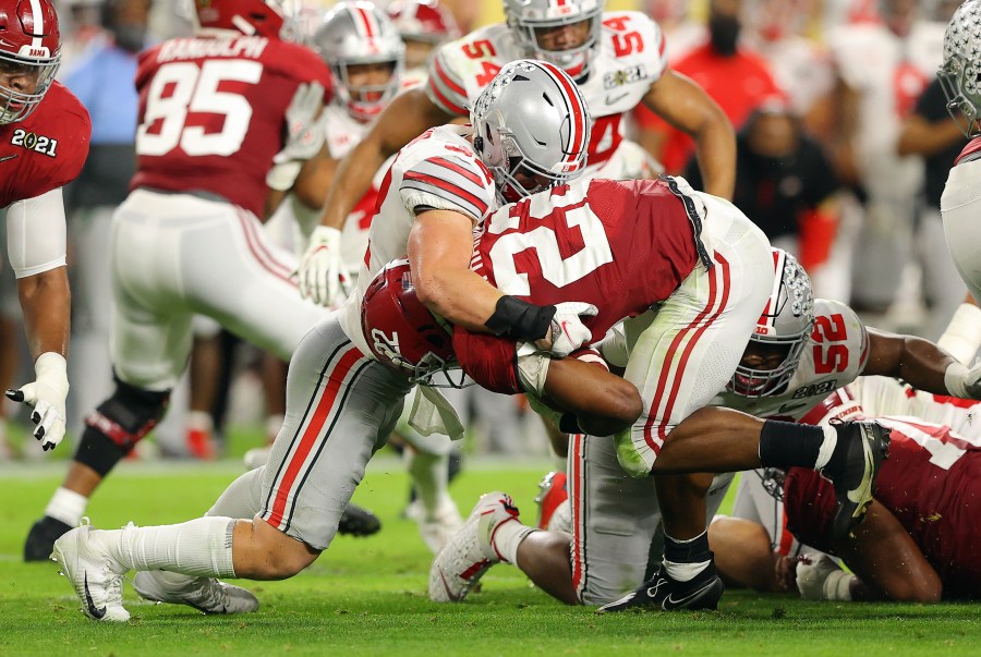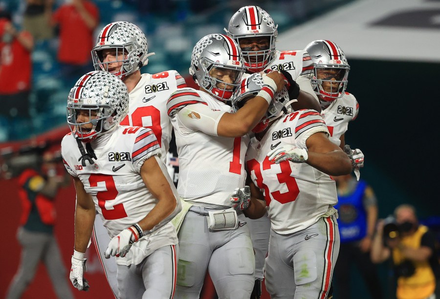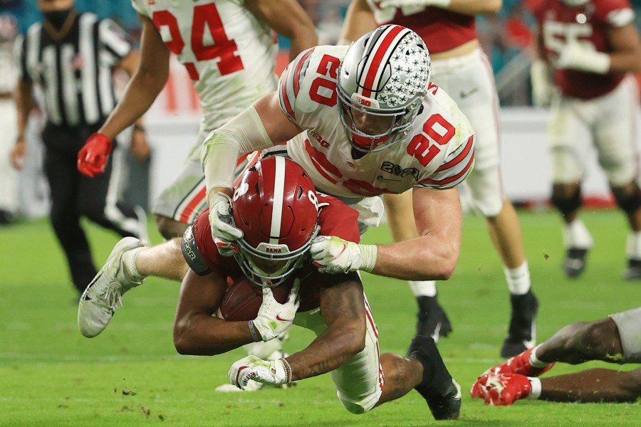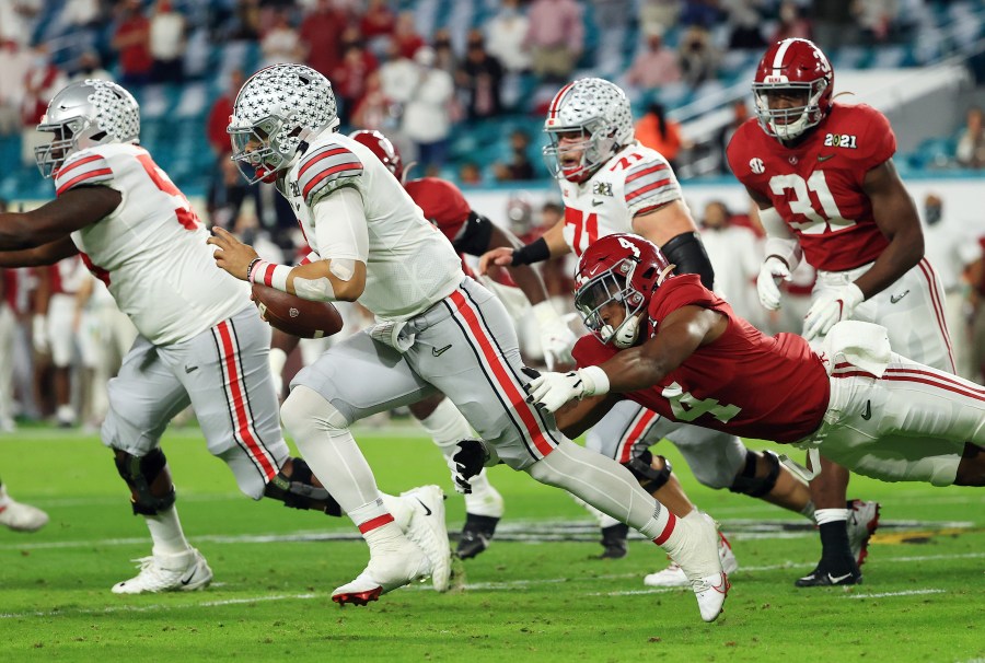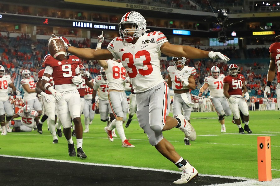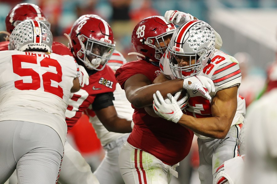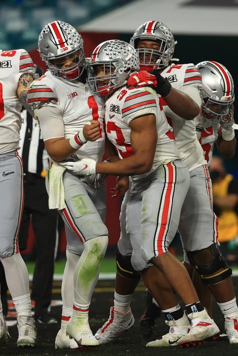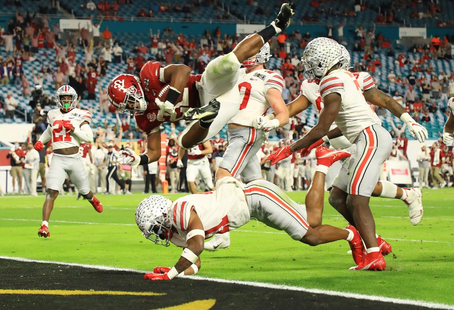 MIAMI GARDENS, FLORIDA – JANUARY 11: DeVonta Smith #6 of the Alabama Crimson Tide rushes for a five yard touchdown during the second quarter of the College Football Playoff National Championship game against the Ohio State Buckeyes at Hard Rock Stadium on January 11, 2021 in Miami Gardens, Florida. (Photo by Mike Ehrmann/Getty Images) MIAMI GARDENS, FLORIDA – JANUARY 11: Master Teague III #33 of the Ohio State Buckeyes rushes for an eight yard touchdown during the first quarter of the College Football Playoff National Championship game against the Alabama Crimson Tide at Hard Rock Stadium on January 11, 2021 in Miami Gardens, Florida. (Photo by Mike Ehrmann/Getty Images) MIAMI GARDENS, FLORIDA – JANUARY 11: The Ohio State Buckeyes take the field prior to the College Football Playoff National Championship game against the Alabama Crimson Tide at Hard Rock Stadium on January 11, 2021 in Miami Gardens, Florida. (Photo by Mike Ehrmann/Getty Images) MIAMI GARDENS, FLORIDA – JANUARY 11: Justin Hilliard #47 of the Ohio State Buckeyes reacts to a tackle during the first quarter of the College Football Playoff National Championship game against the Alabama Crimson Tide at Hard Rock Stadium on January 11, 2021 in Miami Gardens, Florida. (Photo by Sam Greenwood/Getty Images) MIAMI GARDENS, FLORIDA – JANUARY 11: Justin Hilliard #47 of the Ohio State Buckeyes reacts to a tackle during the first quarter of the College Football Playoff National Championship game against the Alabama Crimson Tide at Hard Rock Stadium on January 11, 2021 in Miami Gardens, Florida. (Photo by Michael Reaves/Getty Images) MIAMI GARDENS, FLORIDA – JANUARY 11: Justin Hilliard #47 of the Ohio State Buckeyes tackles Najee Harris #22 of the Alabama Crimson Tide during the first quarter of the College Football Playoff National Championship game at Hard Rock Stadium on January 11, 2021 in Miami Gardens, Florida. (Photo by Michael Reaves/Getty Images) MIAMI GARDENS, FLORIDA – JANUARY 11: Justin Hilliard #47 of the Ohio State Buckeyes tackles Najee Harris #22 of the Alabama Crimson Tide during the first quarter of the College Football Playoff National Championship game at Hard Rock Stadium on January 11, 2021 in Miami Gardens, Florida. (Photo by Mike Ehrmann/Getty Images) MIAMI GARDENS, FLORIDA – JANUARY 11: John Metchie III #8 of the Alabama Crimson Tide rushes during the first quarter of the College Football Playoff National Championship game against the Ohio State Buckeyes at Hard Rock Stadium on January 11, 2021 in Miami Gardens, Florida. (Photo by Mike Ehrmann/Getty Images) MIAMI GARDENS, FLORIDA – JANUARY 11: DeVonta Smith #6 of the Alabama Crimson Tide is wrapped up by Marcus Williamson #21 of the Ohio State Buckeyesduring the first quarter of the College Football Playoff National Championship game at Hard Rock Stadium on January 11, 2021 in Miami Gardens, Florida. (Photo by Sam Greenwood/Getty Images) MIAMI GARDENS, FLORIDA – JANUARY 11: Master Teague III #33 of the Ohio State Buckeyes rushes for an eight yard touchdown during the first quarter of the College Football Playoff National Championship game against the Alabama Crimson Tide at Hard Rock Stadium on January 11, 2021 in Miami Gardens, Florida. (Photo by Sam Greenwood/Getty Images) MIAMI GARDENS, FLORIDA – JANUARY 11: Master Teague III #33 of the Ohio State Buckeyes rushes for an eight yard touchdown during the first quarter of the College Football Playoff National Championship game against the Alabama Crimson Tide at Hard Rock Stadium on January 11, 2021 in Miami Gardens, Florida. (Photo by Sam Greenwood/Getty Images) MIAMI GARDENS, FLORIDA – JANUARY 11: Head coach Ryan Day of the Ohio State Buckeyes reacts with Justin Fields #1 during the first quarter of the College Football Playoff National Championship game against the Alabama Crimson Tide at Hard Rock Stadium on January 11, 2021 in Miami Gardens, Florida. (Photo by Michael Reaves/Getty Images) MIAMI GARDENS, FLORIDA – JANUARY 11: Justin Fields #1 of the Ohio State Buckeyes celebrates a touchdown during the first quarter of the College Football Playoff National Championship game against the Alabama Crimson Tide at Hard Rock Stadium on January 11, 2021 in Miami Gardens, Florida. (Photo by Kevin C. Cox/Getty Images) MIAMI GARDENS, FLORIDA – JANUARY 11: Jeremy Ruckert #88 of the Ohio State Buckeyes reacts during the first quarter of the College Football Playoff National Championship game against the Alabama Crimson Tide at Hard Rock Stadium on January 11, 2021 in Miami Gardens, Florida. (Photo by Sam Greenwood/Getty Images) MIAMI GARDENS, FLORIDA – JANUARY 11: Jeremy Ruckert #88 of the Ohio State Buckeyes reaches for a catch ahead of Christian Harris #8 of the Alabama Crimson Tide during the first quarter of the College Football Playoff National Championship game at Hard Rock Stadium on January 11, 2021 in Miami Gardens, Florida. (Photo by Michael Reaves/Getty Images) MIAMI GARDENS, FLORIDA – JANUARY 11: Jeremy Ruckert #88 of the Ohio State Buckeyes reaches for a catch ahead of Christian Harris #8 of the Alabama Crimson Tide during the first quarter of the College Football Playoff National Championship game at Hard Rock Stadium on January 11, 2021 in Miami Gardens, Florida. (Photo by Michael Reaves/Getty Images) MIAMI GARDENS, FLORIDA – JANUARY 11: Master Teague III #33 of the Ohio State Buckeyes rushes for an eight yard touchdown during the first quarter of the College Football Playoff National Championship game against the Alabama Crimson Tide at Hard Rock Stadium on January 11, 2021 in Miami Gardens, Florida. (Photo by Mike Ehrmann/Getty Images) MIAMI GARDENS, FLORIDA – JANUARY 11: Jeremy Ruckert #88 of the Ohio State Buckeyes reacts during the first quarter of the College Football Playoff National Championship game against the Alabama Crimson Tide at Hard Rock Stadium on January 11, 2021 in Miami Gardens, Florida. (Photo by Mike Ehrmann/Getty Images) MIAMI GARDENS, FLORIDA – 