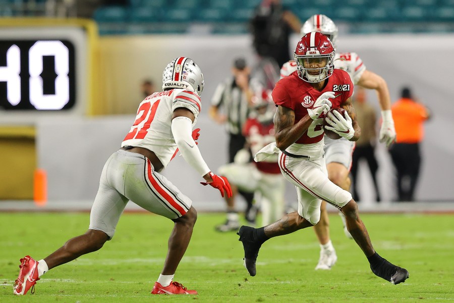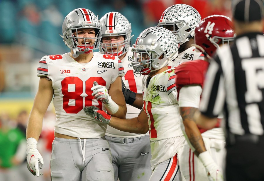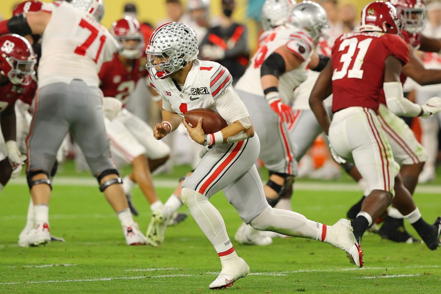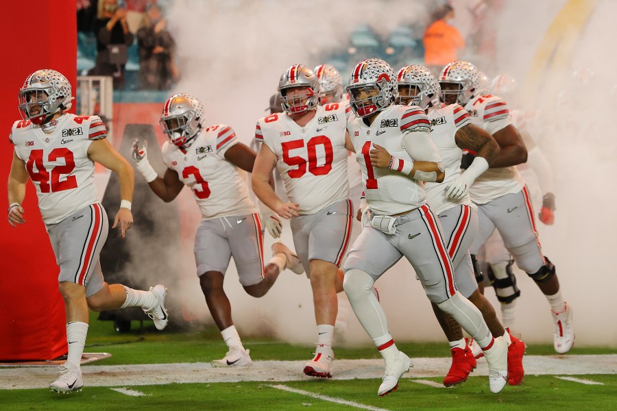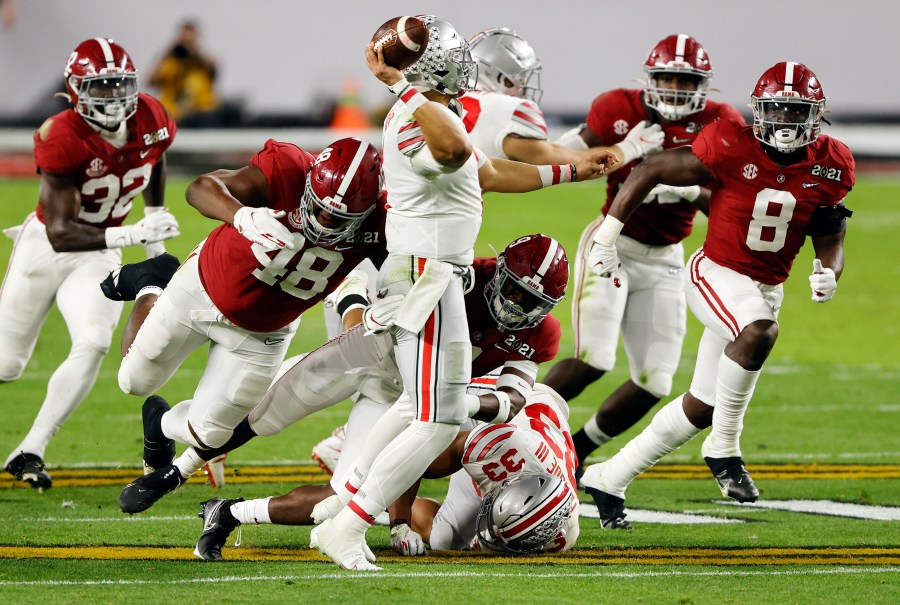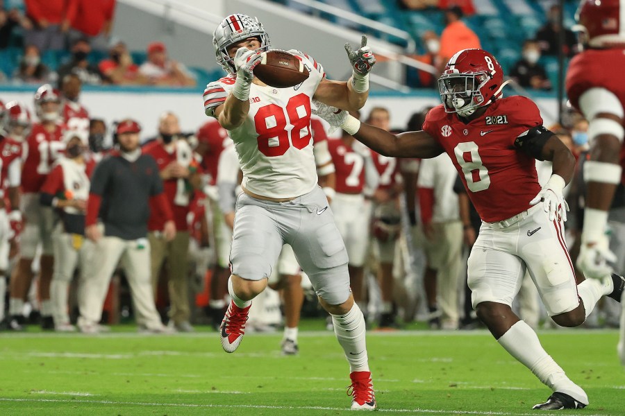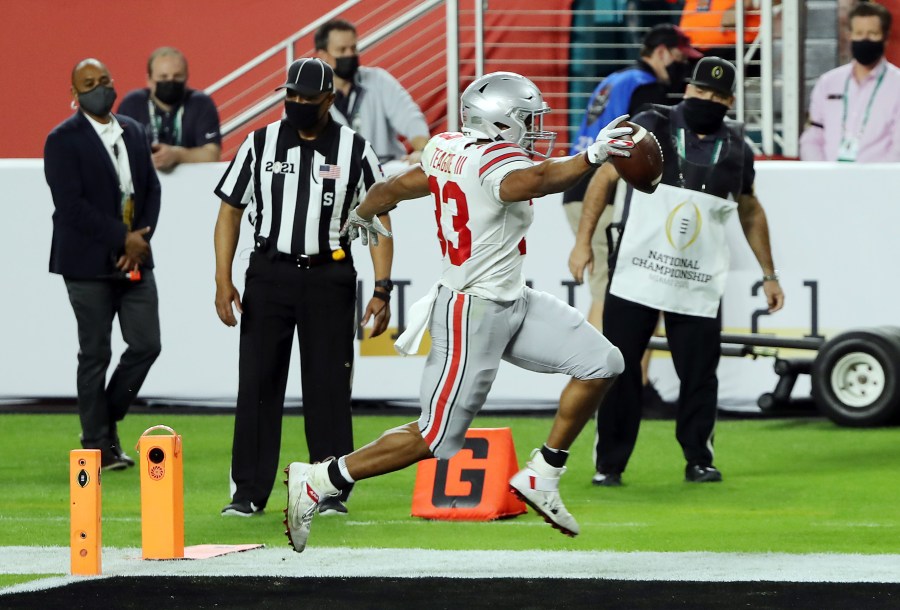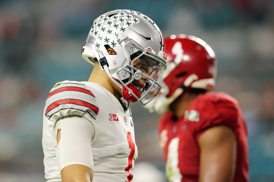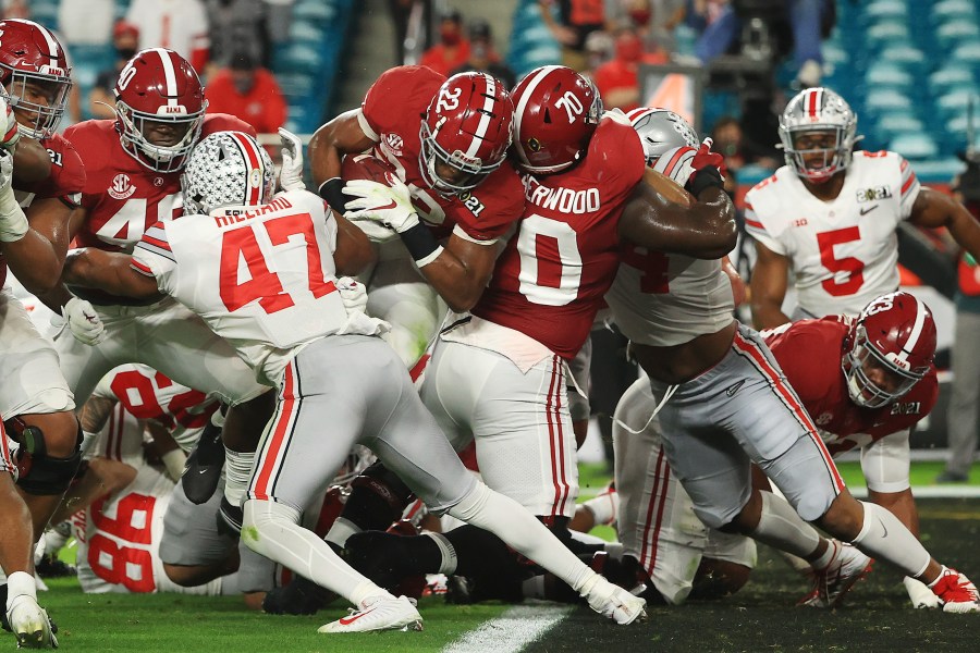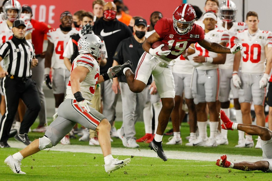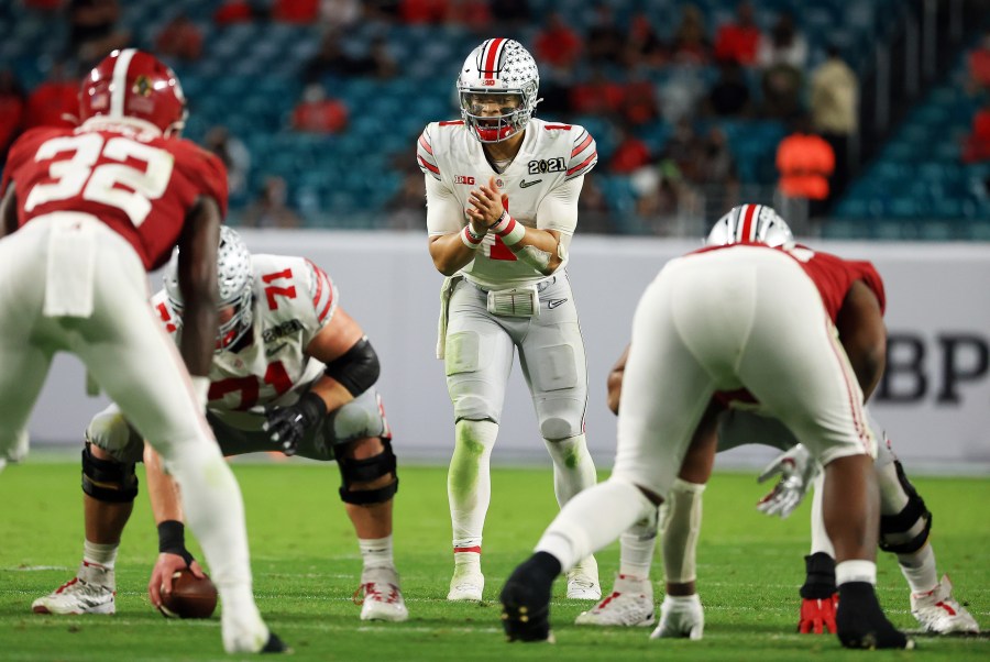 MIAMI GARDENS, FLORIDA – JANUARY 11: DeVonta Smith #6 of the Alabama Crimson Tide rushes for a five yard touchdown during the second quarter of the College Football Playoff National Championship game against the Ohio State Buckeyes at Hard Rock Stadium on January 11, 2021 in Miami Gardens, Florida. (Photo by Mike Ehrmann/Getty Images) MIAMI GARDENS, FLORIDA – JANUARY 11: Master Teague III #33 of the Ohio State Buckeyes rushes for an eight yard touchdown during the first quarter of the College Football Playoff National Championship game against the Alabama Crimson Tide at Hard Rock Stadium on January 11, 2021 in Miami Gardens, Florida. (Photo by Mike Ehrmann/Getty Images) MIAMI GARDENS, FLORIDA – JANUARY 11: The Ohio State Buckeyes take the field prior to the College Football Playoff National Championship game against the Alabama Crimson Tide at Hard Rock Stadium on January 11, 2021 in Miami Gardens, Florida. (Photo by Mike Ehrmann/Getty Images) MIAMI GARDENS, FLORIDA – JANUARY 11: Justin Hilliard #47 of the Ohio State Buckeyes reacts to a tackle during the first quarter of the College Football Playoff National Championship game against the Alabama Crimson Tide at Hard Rock Stadium on January 11, 2021 in Miami Gardens, Florida. (Photo by Sam Greenwood/Getty Images) MIAMI GARDENS, FLORIDA – JANUARY 11: Justin Hilliard #47 of the Ohio State Buckeyes reacts to a tackle during the first quarter of the College Football Playoff National Championship game against the Alabama Crimson Tide at Hard Rock Stadium on January 11, 2021 in Miami Gardens, Florida. (Photo by Michael Reaves/Getty Images) MIAMI GARDENS, FLORIDA – JANUARY 11: Justin Hilliard #47 of the Ohio State Buckeyes tackles Najee Harris #22 of the Alabama Crimson Tide during the first quarter of the College Football Playoff National Championship game at Hard Rock Stadium on January 11, 2021 in Miami Gardens, Florida. (Photo by Michael Reaves/Getty Images) MIAMI GARDENS, FLORIDA – JANUARY 11: Justin Hilliard #47 of the Ohio State Buckeyes tackles Najee Harris #22 of the Alabama Crimson Tide during the first quarter of the College Football Playoff National Championship game at Hard Rock Stadium on January 11, 2021 in Miami Gardens, Florida. (Photo by Mike Ehrmann/Getty Images) MIAMI GARDENS, FLORIDA – JANUARY 11: John Metchie III #8 of the Alabama Crimson Tide rushes during the first quarter of the College Football Playoff National Championship game against the Ohio State Buckeyes at Hard Rock Stadium on January 11, 2021 in Miami Gardens, Florida. (Photo by Mike Ehrmann/Getty Images) MIAMI GARDENS, FLORIDA – JANUARY 11: DeVonta Smith #6 of the Alabama Crimson Tide is wrapped up by Marcus Williamson #21 of the Ohio State Buckeyesduring the first quarter of the College Football Playoff National Championship game at Hard Rock Stadium on January 11, 2021 in Miami Gardens, Florida. (Photo by Sam Greenwood/Getty Images) MIAMI GARDENS, FLORIDA – JANUARY 11: Master Teague III #33 of the Ohio State Buckeyes rushes for an eight yard touchdown during the first quarter of the College Football Playoff National Championship game against the Alabama Crimson Tide at Hard Rock Stadium on January 11, 2021 in Miami Gardens, Florida. (Photo by Sam Greenwood/Getty Images) MIAMI GARDENS, FLORIDA – JANUARY 11: Master Teague III #33 of the Ohio State Buckeyes rushes for an eight yard touchdown during the first quarter of the College Football Playoff National Championship game against the Alabama Crimson Tide at Hard Rock Stadium on January 11, 2021 in Miami Gardens, Florida. (Photo by Sam Greenwood/Getty Images) MIAMI GARDENS, FLORIDA – JANUARY 11: Head coach Ryan Day of the Ohio State Buckeyes reacts with Justin Fields #1 during the first quarter of the College Football Playoff National Championship game against the Alabama Crimson Tide at Hard Rock Stadium on January 11, 2021 in Miami Gardens, Florida. (Photo by Michael Reaves/Getty Images) MIAMI GARDENS, FLORIDA – JANUARY 11: Justin Fields #1 of the Ohio State Buckeyes celebrates a touchdown during the first quarter of the College Football Playoff National Championship game against the Alabama Crimson Tide at Hard Rock Stadium on January 11, 2021 in Miami Gardens, Florida. (Photo by Kevin C. Cox/Getty Images) MIAMI GARDENS, FLORIDA – JANUARY 11: Jeremy Ruckert #88 of the Ohio State Buckeyes reacts during the first quarter of the College Football Playoff National Championship game against the Alabama Crimson Tide at Hard Rock Stadium on January 11, 2021 in Miami Gardens, Florida. (Photo by Sam Greenwood/Getty Images) MIAMI GARDENS, FLORIDA – JANUARY 11: Jeremy Ruckert #88 of the Ohio State Buckeyes reaches for a catch ahead of Christian Harris #8 of the Alabama Crimson Tide during the first quarter of the College Football Playoff National Championship game at Hard Rock Stadium on January 11, 2021 in Miami Gardens, Florida. (Photo by Michael Reaves/Getty Images) MIAMI GARDENS, FLORIDA – JANUARY 11: Jeremy Ruckert #88 of the Ohio State Buckeyes reaches for a catch ahead of Christian Harris #8 of the Alabama Crimson Tide during the first quarter of the College Football Playoff National Championship game at Hard Rock Stadium on January 11, 2021 in Miami Gardens, Florida. (Photo by Michael Reaves/Getty Images) MIAMI GARDENS, FLORIDA – JANUARY 11: Master Teague III #33 of the Ohio State Buckeyes rushes for an eight yard touchdown during the first quarter of the College Football Playoff National Championship game against the Alabama Crimson Tide at Hard Rock Stadium on January 11, 2021 in Miami Gardens, Florida. (Photo by Mike Ehrmann/Getty Images) MIAMI GARDENS, FLORIDA – JANUARY 11: Jeremy Ruckert #88 of the Ohio State Buckeyes reacts during the first quarter of the College Football Playoff National Championship game against the Alabama Crimson Tide at Hard Rock Stadium on January 11, 2021 in Miami Gardens, Florida. (Photo by Mike Ehrmann/Getty Images) MIAMI GARDENS, FLORIDA – 