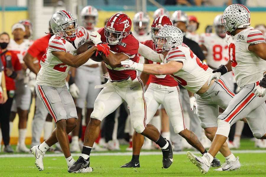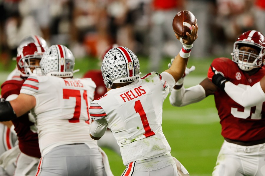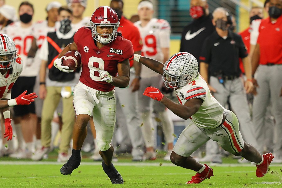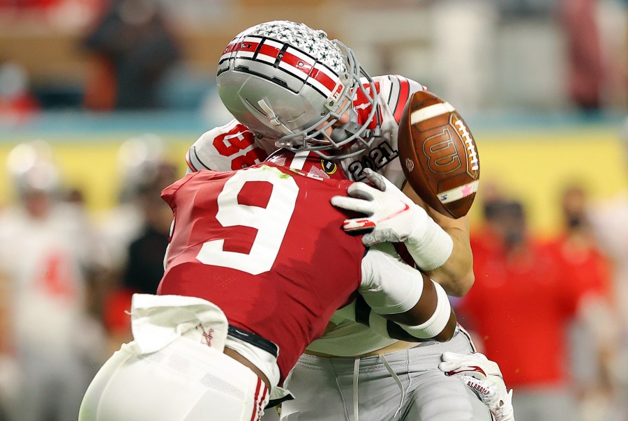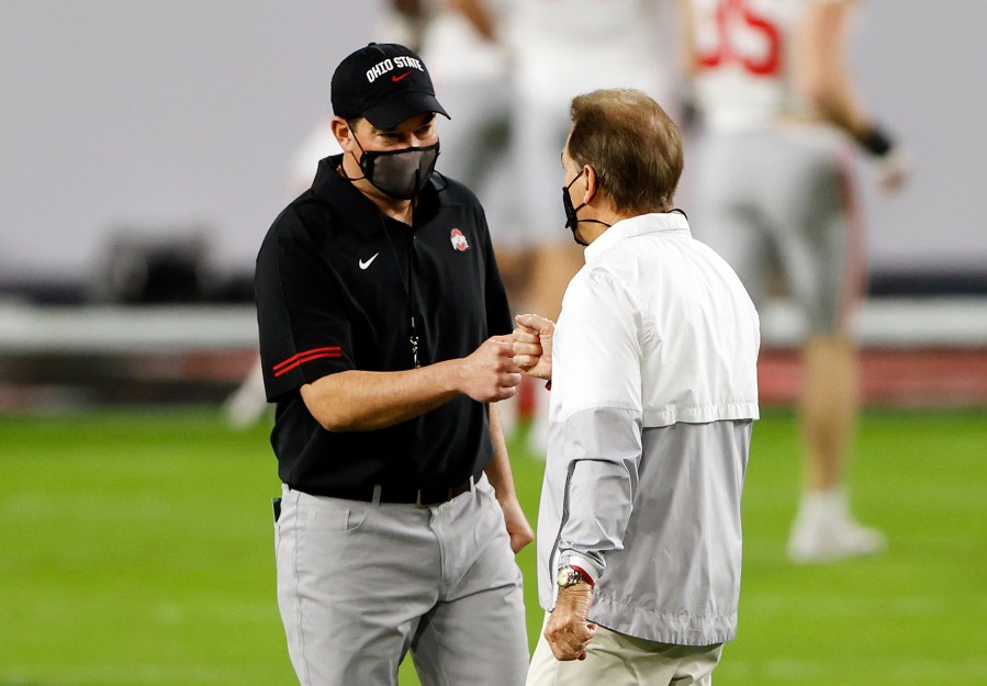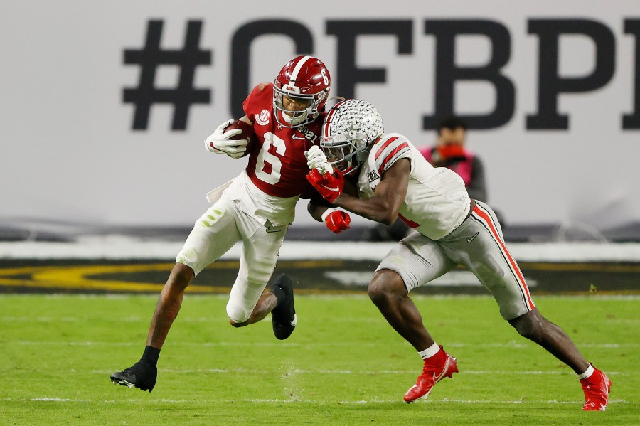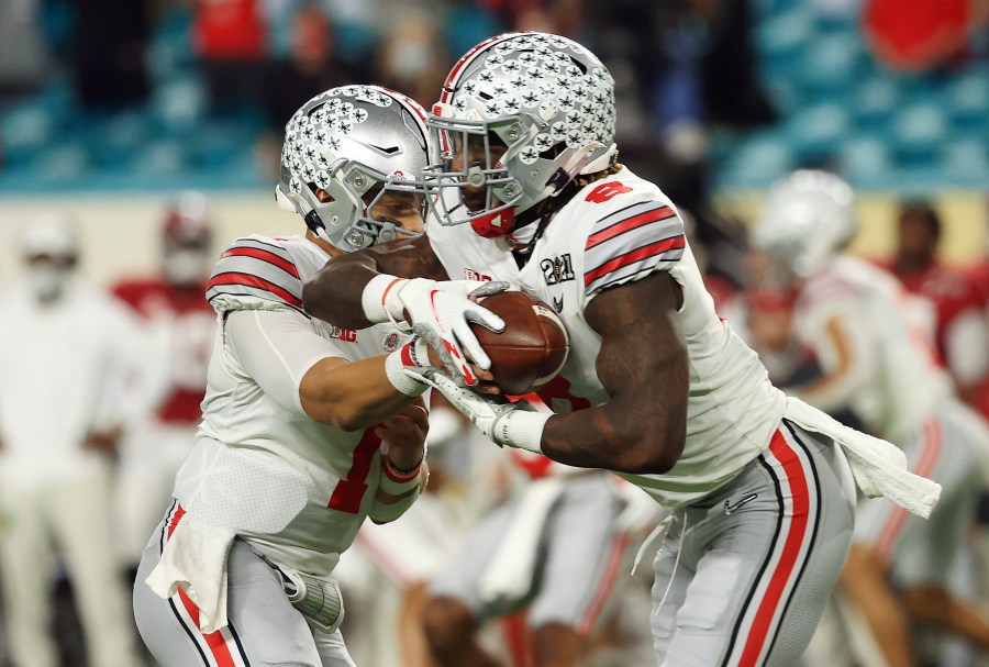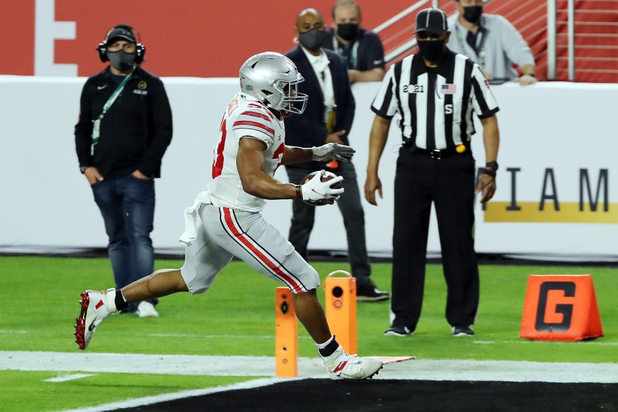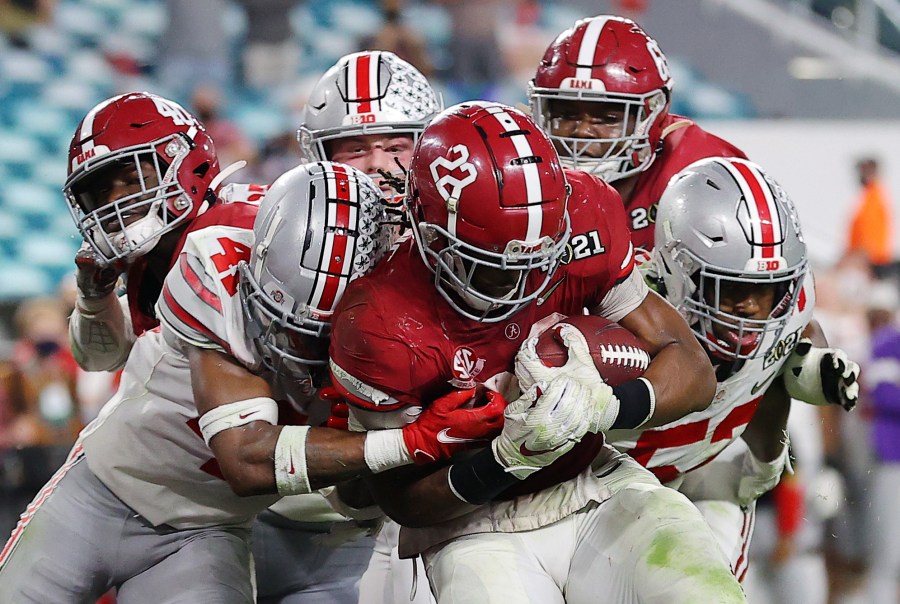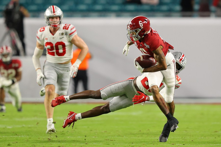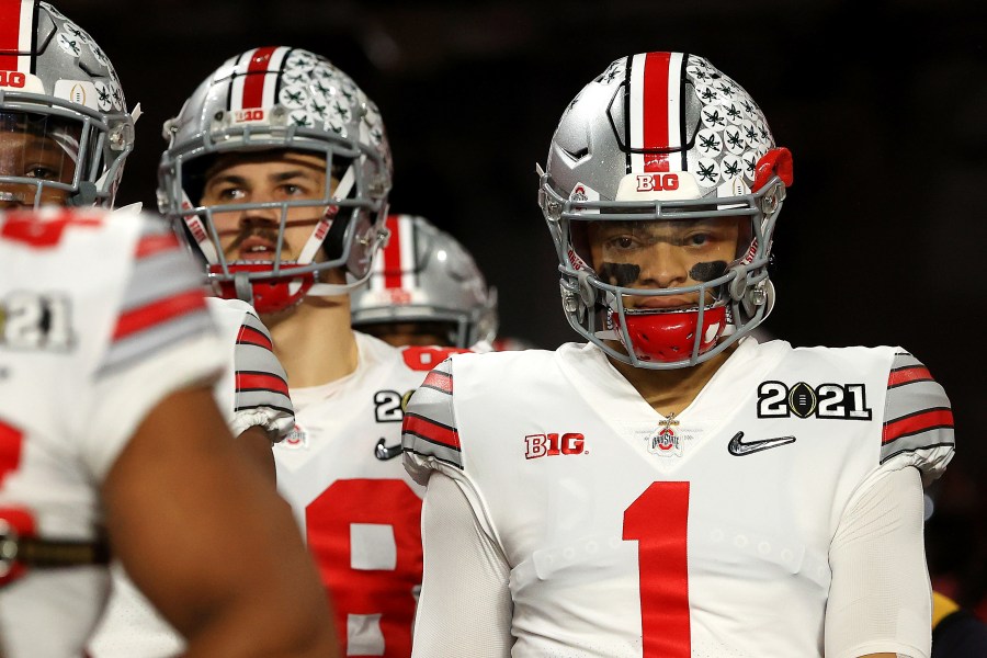 MIAMI GARDENS, FLORIDA – JANUARY 11: DeVonta Smith #6 of the Alabama Crimson Tide rushes for a five yard touchdown during the second quarter of the College Football Playoff National Championship game against the Ohio State Buckeyes at Hard Rock Stadium on January 11, 2021 in Miami Gardens, Florida. (Photo by Mike Ehrmann/Getty Images) MIAMI GARDENS, FLORIDA – JANUARY 11: Master Teague III #33 of the Ohio State Buckeyes rushes for an eight yard touchdown during the first quarter of the College Football Playoff National Championship game against the Alabama Crimson Tide at Hard Rock Stadium on January 11, 2021 in Miami Gardens, Florida. (Photo by Mike Ehrmann/Getty Images) MIAMI GARDENS, FLORIDA – JANUARY 11: The Ohio State Buckeyes take the field prior to the College Football Playoff National Championship game against the Alabama Crimson Tide at Hard Rock Stadium on January 11, 2021 in Miami Gardens, Florida. (Photo by Mike Ehrmann/Getty Images) MIAMI GARDENS, FLORIDA – JANUARY 11: Justin Hilliard #47 of the Ohio State Buckeyes reacts to a tackle during the first quarter of the College Football Playoff National Championship game against the Alabama Crimson Tide at Hard Rock Stadium on January 11, 2021 in Miami Gardens, Florida. (Photo by Sam Greenwood/Getty Images) MIAMI GARDENS, FLORIDA – JANUARY 11: Justin Hilliard #47 of the Ohio State Buckeyes reacts to a tackle during the first quarter of the College Football Playoff National Championship game against the Alabama Crimson Tide at Hard Rock Stadium on January 11, 2021 in Miami Gardens, Florida. (Photo by Michael Reaves/Getty Images) MIAMI GARDENS, FLORIDA – JANUARY 11: Justin Hilliard #47 of the Ohio State Buckeyes tackles Najee Harris #22 of the Alabama Crimson Tide during the first quarter of the College Football Playoff National Championship game at Hard Rock Stadium on January 11, 2021 in Miami Gardens, Florida. (Photo by Michael Reaves/Getty Images) MIAMI GARDENS, FLORIDA – JANUARY 11: Justin Hilliard #47 of the Ohio State Buckeyes tackles Najee Harris #22 of the Alabama Crimson Tide during the first quarter of the College Football Playoff National Championship game at Hard Rock Stadium on January 11, 2021 in Miami Gardens, Florida. (Photo by Mike Ehrmann/Getty Images) MIAMI GARDENS, FLORIDA – JANUARY 11: John Metchie III #8 of the Alabama Crimson Tide rushes during the first quarter of the College Football Playoff National Championship game against the Ohio State Buckeyes at Hard Rock Stadium on January 11, 2021 in Miami Gardens, Florida. (Photo by Mike Ehrmann/Getty Images) MIAMI GARDENS, FLORIDA – JANUARY 11: DeVonta Smith #6 of the Alabama Crimson Tide is wrapped up by Marcus Williamson #21 of the Ohio State Buckeyesduring the first quarter of the College Football Playoff National Championship game at Hard Rock Stadium on January 11, 2021 in Miami Gardens, Florida. (Photo by Sam Greenwood/Getty Images) MIAMI GARDENS, FLORIDA – JANUARY 11: Master Teague III #33 of the Ohio State Buckeyes rushes for an eight yard touchdown during the first quarter of the College Football Playoff National Championship game against the Alabama Crimson Tide at Hard Rock Stadium on January 11, 2021 in Miami Gardens, Florida. (Photo by Sam Greenwood/Getty Images) MIAMI GARDENS, FLORIDA – JANUARY 11: Master Teague III #33 of the Ohio State Buckeyes rushes for an eight yard touchdown during the first quarter of the College Football Playoff National Championship game against the Alabama Crimson Tide at Hard Rock Stadium on January 11, 2021 in Miami Gardens, Florida. (Photo by Sam Greenwood/Getty Images) MIAMI GARDENS, FLORIDA – JANUARY 11: Head coach Ryan Day of the Ohio State Buckeyes reacts with Justin Fields #1 during the first quarter of the College Football Playoff National Championship game against the Alabama Crimson Tide at Hard Rock Stadium on January 11, 2021 in Miami Gardens, Florida. (Photo by Michael Reaves/Getty Images) MIAMI GARDENS, FLORIDA – JANUARY 11: Justin Fields #1 of the Ohio State Buckeyes celebrates a touchdown during the first quarter of the College Football Playoff National Championship game against the Alabama Crimson Tide at Hard Rock Stadium on January 11, 2021 in Miami Gardens, Florida. (Photo by Kevin C. Cox/Getty Images) MIAMI GARDENS, FLORIDA – JANUARY 11: Jeremy Ruckert #88 of the Ohio State Buckeyes reacts during the first quarter of the College Football Playoff National Championship game against the Alabama Crimson Tide at Hard Rock Stadium on January 11, 2021 in Miami Gardens, Florida. (Photo by Sam Greenwood/Getty Images) MIAMI GARDENS, FLORIDA – JANUARY 11: Jeremy Ruckert #88 of the Ohio State Buckeyes reaches for a catch ahead of Christian Harris #8 of the Alabama Crimson Tide during the first quarter of the College Football Playoff National Championship game at Hard Rock Stadium on January 11, 2021 in Miami Gardens, Florida. (Photo by Michael Reaves/Getty Images) MIAMI GARDENS, FLORIDA – JANUARY 11: Jeremy Ruckert #88 of the Ohio State Buckeyes reaches for a catch ahead of Christian Harris #8 of the Alabama Crimson Tide during the first quarter of the College Football Playoff National Championship game at Hard Rock Stadium on January 11, 2021 in Miami Gardens, Florida. (Photo by Michael Reaves/Getty Images) MIAMI GARDENS, FLORIDA – JANUARY 11: Master Teague III #33 of the Ohio State Buckeyes rushes for an eight yard touchdown during the first quarter of the College Football Playoff National Championship game against the Alabama Crimson Tide at Hard Rock Stadium on January 11, 2021 in Miami Gardens, Florida. (Photo by Mike Ehrmann/Getty Images) MIAMI GARDENS, FLORIDA – JANUARY 11: Jeremy Ruckert #88 of the Ohio State Buckeyes reacts during the first quarter of the College Football Playoff National Championship game against the Alabama Crimson Tide at Hard Rock Stadium on January 11, 2021 in Miami Gardens, Florida. (Photo by Mike Ehrmann/Getty Images) MIAMI GARDENS, FLORIDA – 