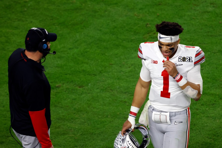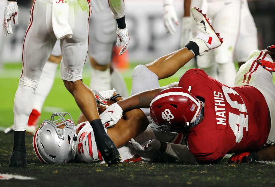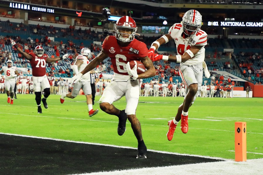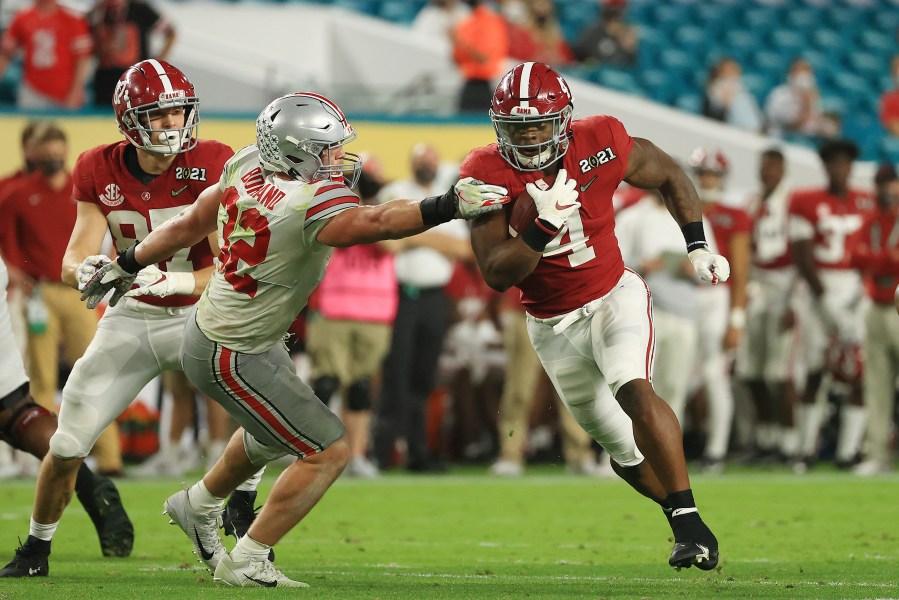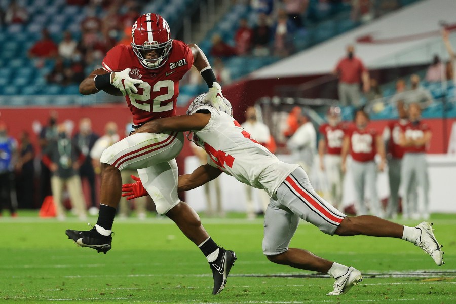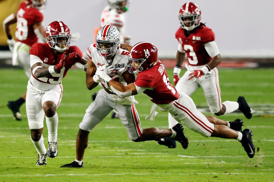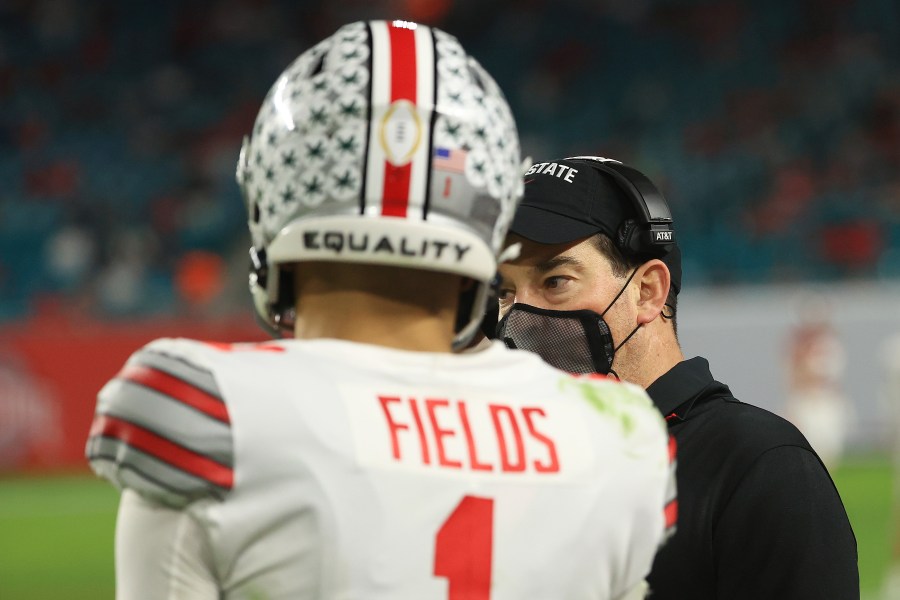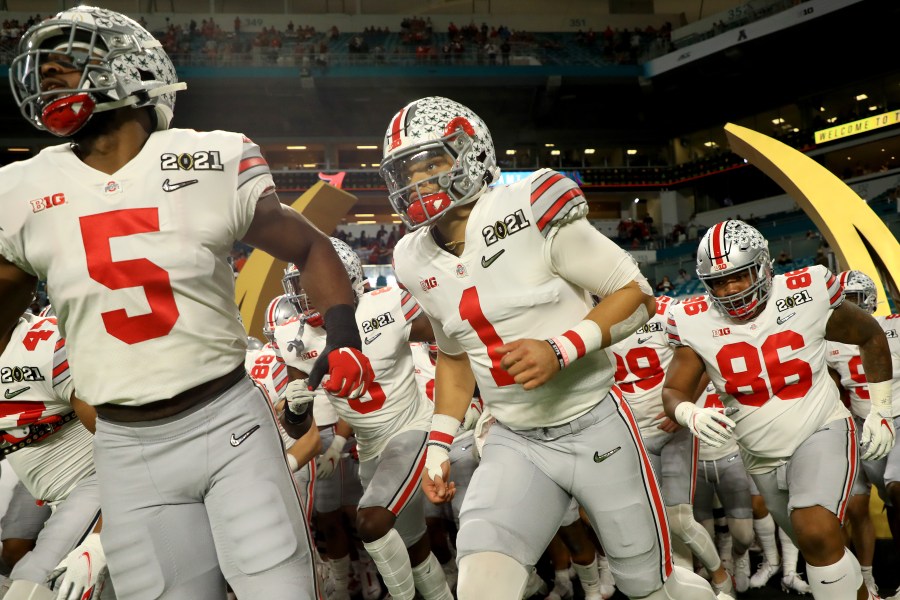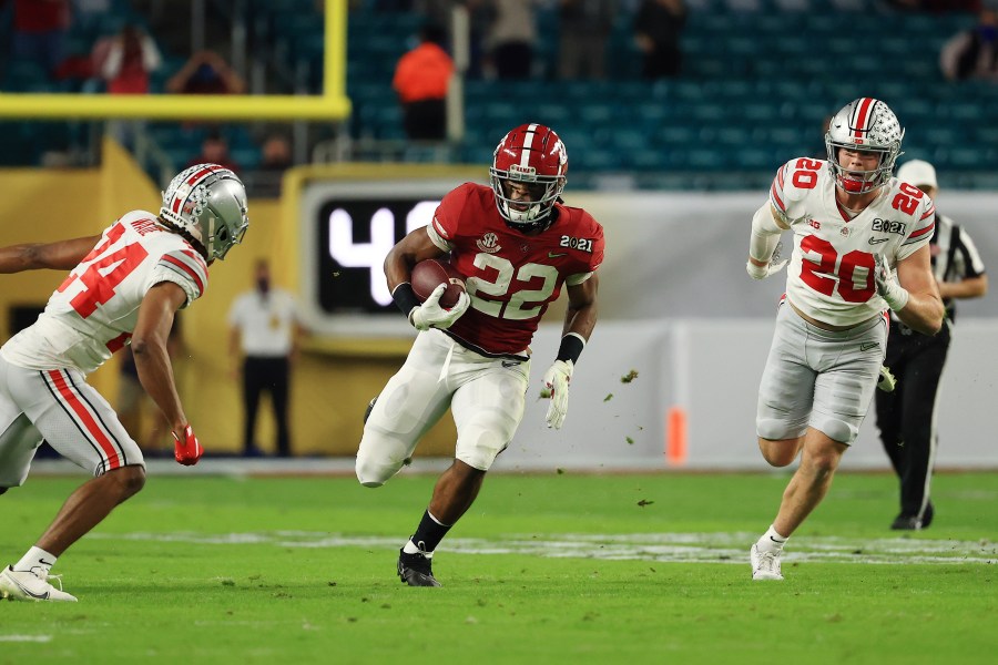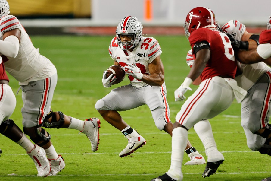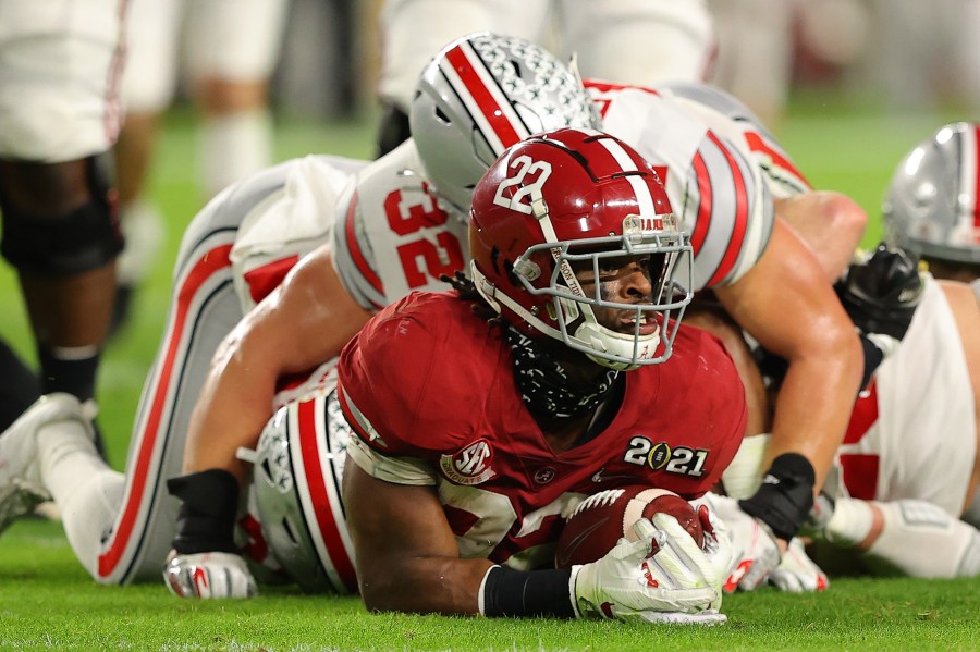 MIAMI GARDENS, FLORIDA – JANUARY 11: DeVonta Smith #6 of the Alabama Crimson Tide rushes for a five yard touchdown during the second quarter of the College Football Playoff National Championship game against the Ohio State Buckeyes at Hard Rock Stadium on January 11, 2021 in Miami Gardens, Florida. (Photo by Mike Ehrmann/Getty Images) MIAMI GARDENS, FLORIDA – JANUARY 11: Master Teague III #33 of the Ohio State Buckeyes rushes for an eight yard touchdown during the first quarter of the College Football Playoff National Championship game against the Alabama Crimson Tide at Hard Rock Stadium on January 11, 2021 in Miami Gardens, Florida. (Photo by Mike Ehrmann/Getty Images) MIAMI GARDENS, FLORIDA – JANUARY 11: The Ohio State Buckeyes take the field prior to the College Football Playoff National Championship game against the Alabama Crimson Tide at Hard Rock Stadium on January 11, 2021 in Miami Gardens, Florida. (Photo by Mike Ehrmann/Getty Images) MIAMI GARDENS, FLORIDA – JANUARY 11: Justin Hilliard #47 of the Ohio State Buckeyes reacts to a tackle during the first quarter of the College Football Playoff National Championship game against the Alabama Crimson Tide at Hard Rock Stadium on January 11, 2021 in Miami Gardens, Florida. (Photo by Sam Greenwood/Getty Images) MIAMI GARDENS, FLORIDA – JANUARY 11: Justin Hilliard #47 of the Ohio State Buckeyes reacts to a tackle during the first quarter of the College Football Playoff National Championship game against the Alabama Crimson Tide at Hard Rock Stadium on January 11, 2021 in Miami Gardens, Florida. (Photo by Michael Reaves/Getty Images) MIAMI GARDENS, FLORIDA – JANUARY 11: Justin Hilliard #47 of the Ohio State Buckeyes tackles Najee Harris #22 of the Alabama Crimson Tide during the first quarter of the College Football Playoff National Championship game at Hard Rock Stadium on January 11, 2021 in Miami Gardens, Florida. (Photo by Michael Reaves/Getty Images) MIAMI GARDENS, FLORIDA – JANUARY 11: Justin Hilliard #47 of the Ohio State Buckeyes tackles Najee Harris #22 of the Alabama Crimson Tide during the first quarter of the College Football Playoff National Championship game at Hard Rock Stadium on January 11, 2021 in Miami Gardens, Florida. (Photo by Mike Ehrmann/Getty Images) MIAMI GARDENS, FLORIDA – JANUARY 11: John Metchie III #8 of the Alabama Crimson Tide rushes during the first quarter of the College Football Playoff National Championship game against the Ohio State Buckeyes at Hard Rock Stadium on January 11, 2021 in Miami Gardens, Florida. (Photo by Mike Ehrmann/Getty Images) MIAMI GARDENS, FLORIDA – JANUARY 11: DeVonta Smith #6 of the Alabama Crimson Tide is wrapped up by Marcus Williamson #21 of the Ohio State Buckeyesduring the first quarter of the College Football Playoff National Championship game at Hard Rock Stadium on January 11, 2021 in Miami Gardens, Florida. (Photo by Sam Greenwood/Getty Images) MIAMI GARDENS, FLORIDA – JANUARY 11: Master Teague III #33 of the Ohio State Buckeyes rushes for an eight yard touchdown during the first quarter of the College Football Playoff National Championship game against the Alabama Crimson Tide at Hard Rock Stadium on January 11, 2021 in Miami Gardens, Florida. (Photo by Sam Greenwood/Getty Images) MIAMI GARDENS, FLORIDA – JANUARY 11: Master Teague III #33 of the Ohio State Buckeyes rushes for an eight yard touchdown during the first quarter of the College Football Playoff National Championship game against the Alabama Crimson Tide at Hard Rock Stadium on January 11, 2021 in Miami Gardens, Florida. (Photo by Sam Greenwood/Getty Images) MIAMI GARDENS, FLORIDA – JANUARY 11: Head coach Ryan Day of the Ohio State Buckeyes reacts with Justin Fields #1 during the first quarter of the College Football Playoff National Championship game against the Alabama Crimson Tide at Hard Rock Stadium on January 11, 2021 in Miami Gardens, Florida. (Photo by Michael Reaves/Getty Images) MIAMI GARDENS, FLORIDA – JANUARY 11: Justin Fields #1 of the Ohio State Buckeyes celebrates a touchdown during the first quarter of the College Football Playoff National Championship game against the Alabama Crimson Tide at Hard Rock Stadium on January 11, 2021 in Miami Gardens, Florida. (Photo by Kevin C. Cox/Getty Images) MIAMI GARDENS, FLORIDA – JANUARY 11: Jeremy Ruckert #88 of the Ohio State Buckeyes reacts during the first quarter of the College Football Playoff National Championship game against the Alabama Crimson Tide at Hard Rock Stadium on January 11, 2021 in Miami Gardens, Florida. (Photo by Sam Greenwood/Getty Images) MIAMI GARDENS, FLORIDA – JANUARY 11: Jeremy Ruckert #88 of the Ohio State Buckeyes reaches for a catch ahead of Christian Harris #8 of the Alabama Crimson Tide during the first quarter of the College Football Playoff National Championship game at Hard Rock Stadium on January 11, 2021 in Miami Gardens, Florida. (Photo by Michael Reaves/Getty Images) MIAMI GARDENS, FLORIDA – JANUARY 11: Jeremy Ruckert #88 of the Ohio State Buckeyes reaches for a catch ahead of Christian Harris #8 of the Alabama Crimson Tide during the first quarter of the College Football Playoff National Championship game at Hard Rock Stadium on January 11, 2021 in Miami Gardens, Florida. (Photo by Michael Reaves/Getty Images) MIAMI GARDENS, FLORIDA – JANUARY 11: Master Teague III #33 of the Ohio State Buckeyes rushes for an eight yard touchdown during the first quarter of the College Football Playoff National Championship game against the Alabama Crimson Tide at Hard Rock Stadium on January 11, 2021 in Miami Gardens, Florida. (Photo by Mike Ehrmann/Getty Images) MIAMI GARDENS, FLORIDA – JANUARY 11: Jeremy Ruckert #88 of the Ohio State Buckeyes reacts during the first quarter of the College Football Playoff National Championship game against the Alabama Crimson Tide at Hard Rock Stadium on January 11, 2021 in Miami Gardens, Florida. (Photo by Mike Ehrmann/Getty Images) MIAMI GARDENS, FLORIDA – 