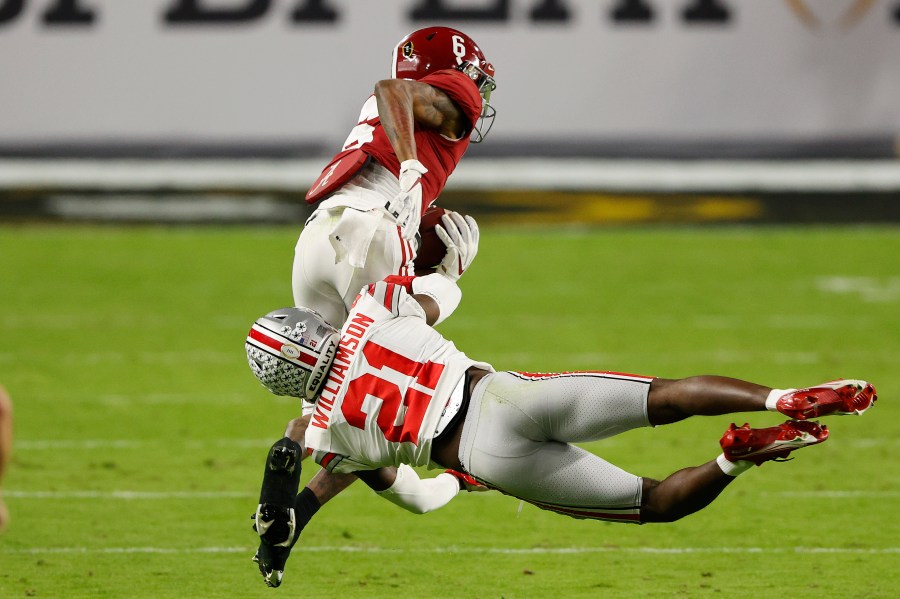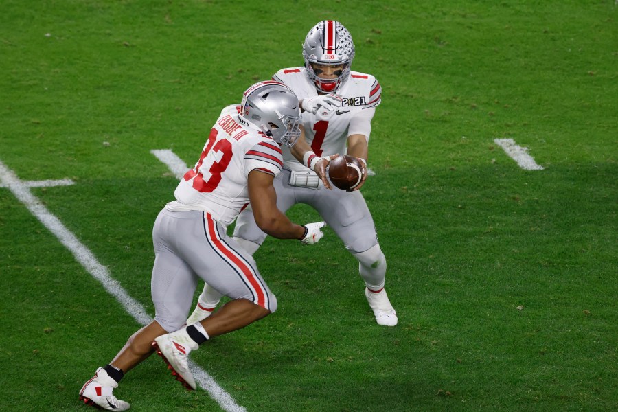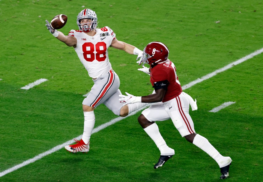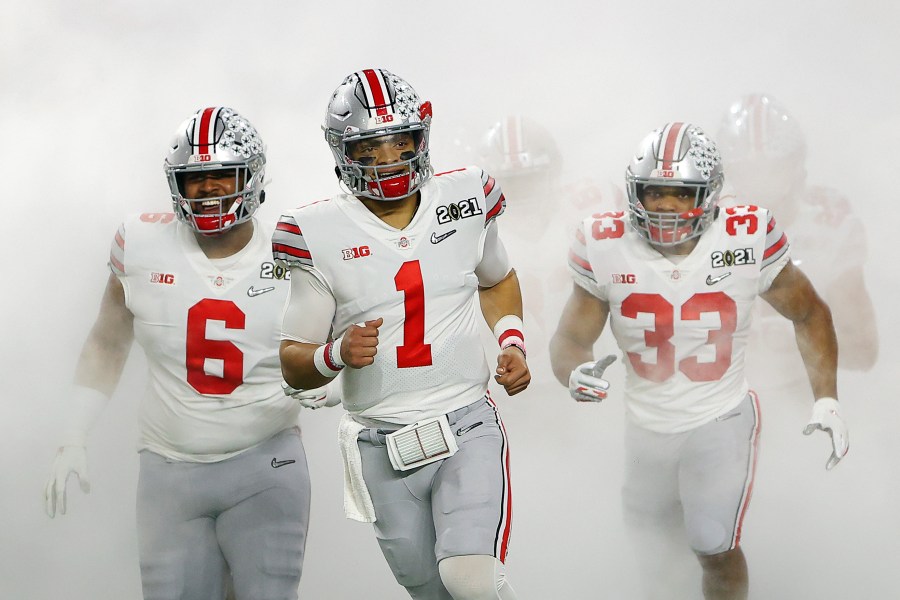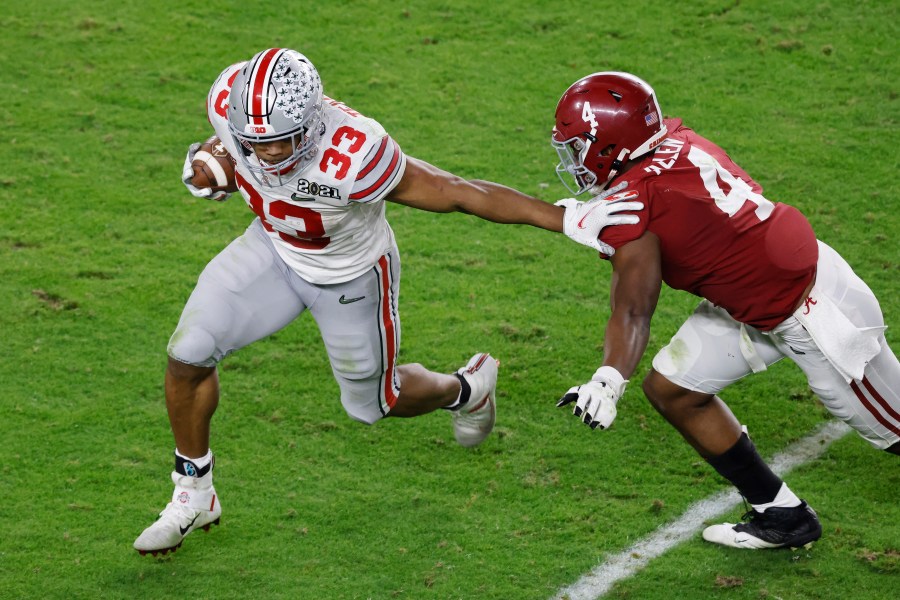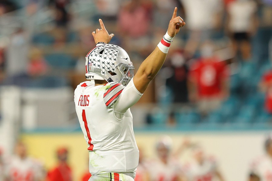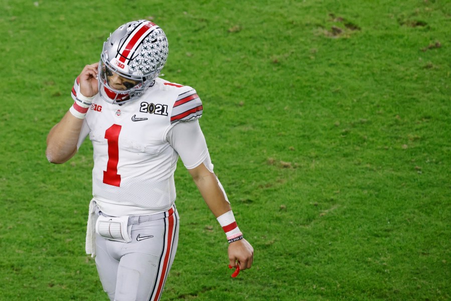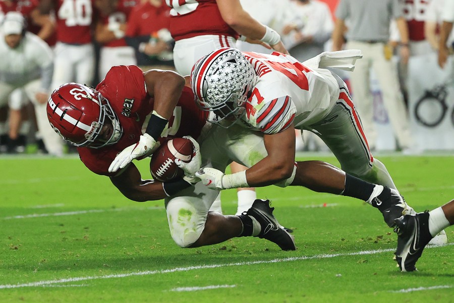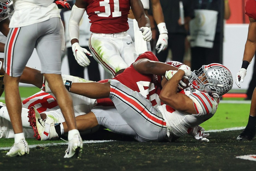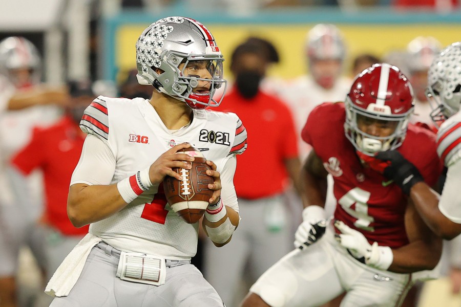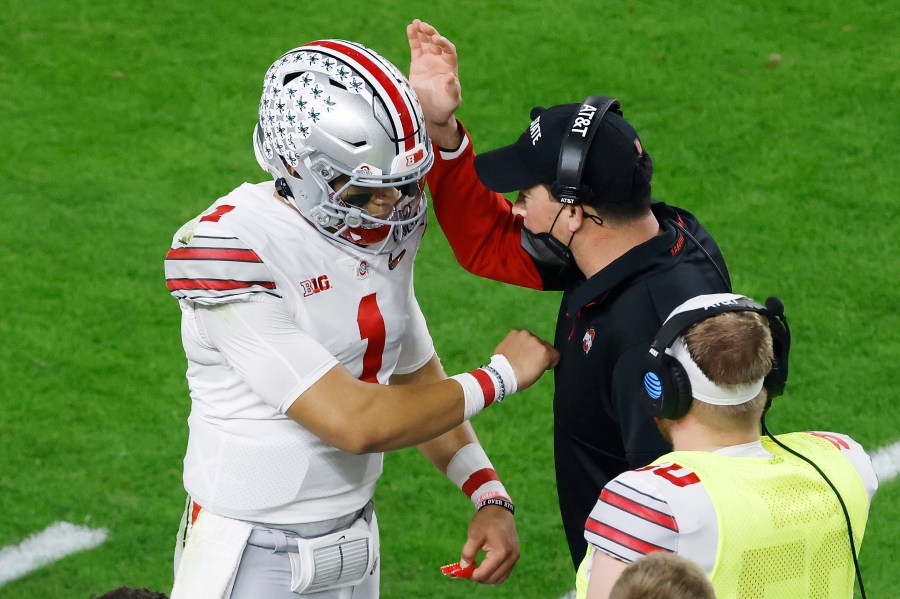 MIAMI GARDENS, FLORIDA – JANUARY 11: DeVonta Smith #6 of the Alabama Crimson Tide rushes for a five yard touchdown during the second quarter of the College Football Playoff National Championship game against the Ohio State Buckeyes at Hard Rock Stadium on January 11, 2021 in Miami Gardens, Florida. (Photo by Mike Ehrmann/Getty Images) MIAMI GARDENS, FLORIDA – JANUARY 11: Master Teague III #33 of the Ohio State Buckeyes rushes for an eight yard touchdown during the first quarter of the College Football Playoff National Championship game against the Alabama Crimson Tide at Hard Rock Stadium on January 11, 2021 in Miami Gardens, Florida. (Photo by Mike Ehrmann/Getty Images) MIAMI GARDENS, FLORIDA – JANUARY 11: The Ohio State Buckeyes take the field prior to the College Football Playoff National Championship game against the Alabama Crimson Tide at Hard Rock Stadium on January 11, 2021 in Miami Gardens, Florida. (Photo by Mike Ehrmann/Getty Images) MIAMI GARDENS, FLORIDA – JANUARY 11: Justin Hilliard #47 of the Ohio State Buckeyes reacts to a tackle during the first quarter of the College Football Playoff National Championship game against the Alabama Crimson Tide at Hard Rock Stadium on January 11, 2021 in Miami Gardens, Florida. (Photo by Sam Greenwood/Getty Images) MIAMI GARDENS, FLORIDA – JANUARY 11: Justin Hilliard #47 of the Ohio State Buckeyes reacts to a tackle during the first quarter of the College Football Playoff National Championship game against the Alabama Crimson Tide at Hard Rock Stadium on January 11, 2021 in Miami Gardens, Florida. (Photo by Michael Reaves/Getty Images) MIAMI GARDENS, FLORIDA – JANUARY 11: Justin Hilliard #47 of the Ohio State Buckeyes tackles Najee Harris #22 of the Alabama Crimson Tide during the first quarter of the College Football Playoff National Championship game at Hard Rock Stadium on January 11, 2021 in Miami Gardens, Florida. (Photo by Michael Reaves/Getty Images) MIAMI GARDENS, FLORIDA – JANUARY 11: Justin Hilliard #47 of the Ohio State Buckeyes tackles Najee Harris #22 of the Alabama Crimson Tide during the first quarter of the College Football Playoff National Championship game at Hard Rock Stadium on January 11, 2021 in Miami Gardens, Florida. (Photo by Mike Ehrmann/Getty Images) MIAMI GARDENS, FLORIDA – JANUARY 11: John Metchie III #8 of the Alabama Crimson Tide rushes during the first quarter of the College Football Playoff National Championship game against the Ohio State Buckeyes at Hard Rock Stadium on January 11, 2021 in Miami Gardens, Florida. (Photo by Mike Ehrmann/Getty Images) MIAMI GARDENS, FLORIDA – JANUARY 11: DeVonta Smith #6 of the Alabama Crimson Tide is wrapped up by Marcus Williamson #21 of the Ohio State Buckeyesduring the first quarter of the College Football Playoff National Championship game at Hard Rock Stadium on January 11, 2021 in Miami Gardens, Florida. (Photo by Sam Greenwood/Getty Images) MIAMI GARDENS, FLORIDA – JANUARY 11: Master Teague III #33 of the Ohio State Buckeyes rushes for an eight yard touchdown during the first quarter of the College Football Playoff National Championship game against the Alabama Crimson Tide at Hard Rock Stadium on January 11, 2021 in Miami Gardens, Florida. (Photo by Sam Greenwood/Getty Images) MIAMI GARDENS, FLORIDA – JANUARY 11: Master Teague III #33 of the Ohio State Buckeyes rushes for an eight yard touchdown during the first quarter of the College Football Playoff National Championship game against the Alabama Crimson Tide at Hard Rock Stadium on January 11, 2021 in Miami Gardens, Florida. (Photo by Sam Greenwood/Getty Images) MIAMI GARDENS, FLORIDA – JANUARY 11: Head coach Ryan Day of the Ohio State Buckeyes reacts with Justin Fields #1 during the first quarter of the College Football Playoff National Championship game against the Alabama Crimson Tide at Hard Rock Stadium on January 11, 2021 in Miami Gardens, Florida. (Photo by Michael Reaves/Getty Images) MIAMI GARDENS, FLORIDA – JANUARY 11: Justin Fields #1 of the Ohio State Buckeyes celebrates a touchdown during the first quarter of the College Football Playoff National Championship game against the Alabama Crimson Tide at Hard Rock Stadium on January 11, 2021 in Miami Gardens, Florida. (Photo by Kevin C. Cox/Getty Images) MIAMI GARDENS, FLORIDA – JANUARY 11: Jeremy Ruckert #88 of the Ohio State Buckeyes reacts during the first quarter of the College Football Playoff National Championship game against the Alabama Crimson Tide at Hard Rock Stadium on January 11, 2021 in Miami Gardens, Florida. (Photo by Sam Greenwood/Getty Images) MIAMI GARDENS, FLORIDA – JANUARY 11: Jeremy Ruckert #88 of the Ohio State Buckeyes reaches for a catch ahead of Christian Harris #8 of the Alabama Crimson Tide during the first quarter of the College Football Playoff National Championship game at Hard Rock Stadium on January 11, 2021 in Miami Gardens, Florida. (Photo by Michael Reaves/Getty Images) MIAMI GARDENS, FLORIDA – JANUARY 11: Jeremy Ruckert #88 of the Ohio State Buckeyes reaches for a catch ahead of Christian Harris #8 of the Alabama Crimson Tide during the first quarter of the College Football Playoff National Championship game at Hard Rock Stadium on January 11, 2021 in Miami Gardens, Florida. (Photo by Michael Reaves/Getty Images) MIAMI GARDENS, FLORIDA – JANUARY 11: Master Teague III #33 of the Ohio State Buckeyes rushes for an eight yard touchdown during the first quarter of the College Football Playoff National Championship game against the Alabama Crimson Tide at Hard Rock Stadium on January 11, 2021 in Miami Gardens, Florida. (Photo by Mike Ehrmann/Getty Images) MIAMI GARDENS, FLORIDA – JANUARY 11: Jeremy Ruckert #88 of the Ohio State Buckeyes reacts during the first quarter of the College Football Playoff National Championship game against the Alabama Crimson Tide at Hard Rock Stadium on January 11, 2021 in Miami Gardens, Florida. (Photo by Mike Ehrmann/Getty Images) MIAMI GARDENS, FLORIDA – 