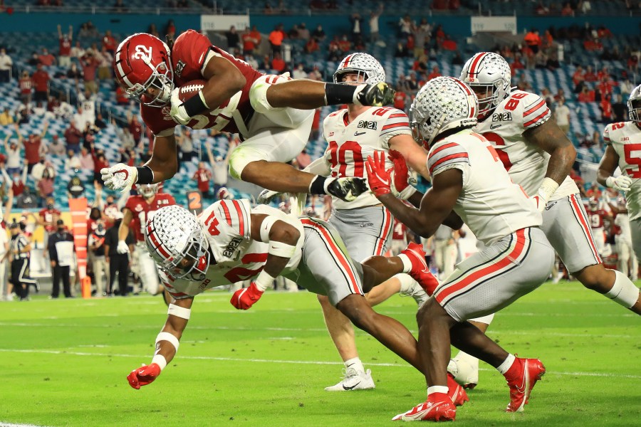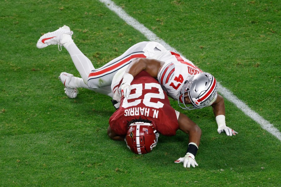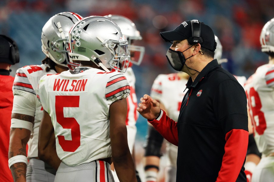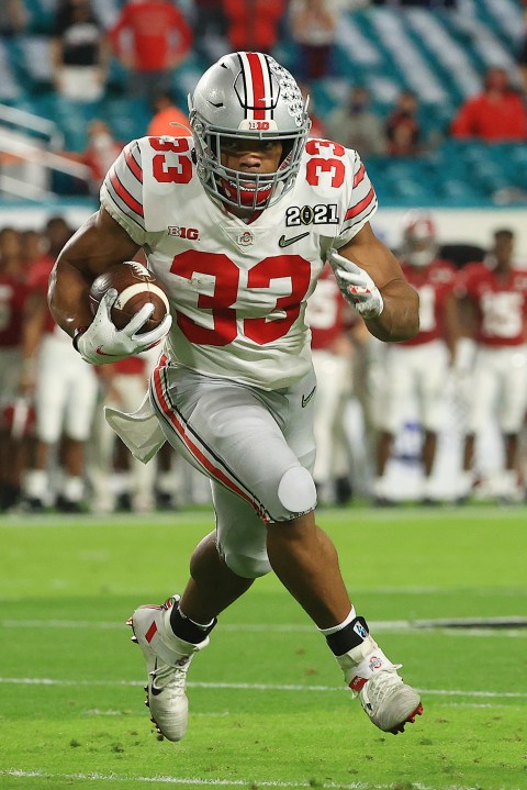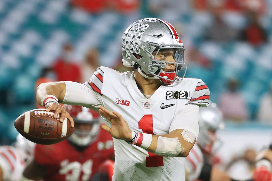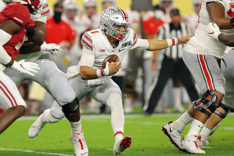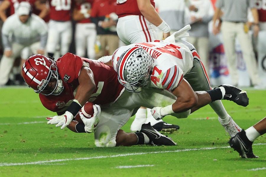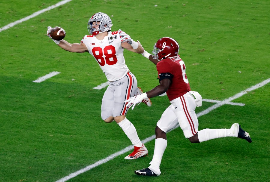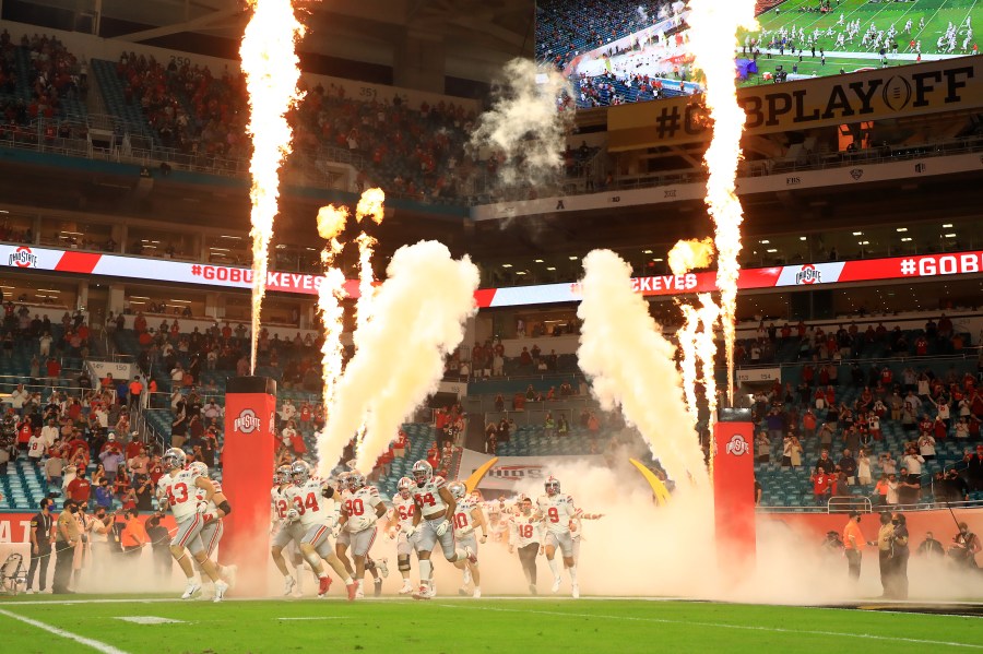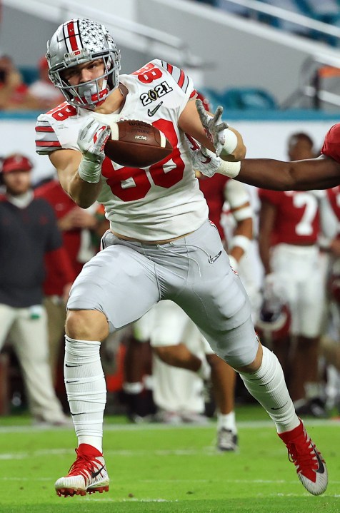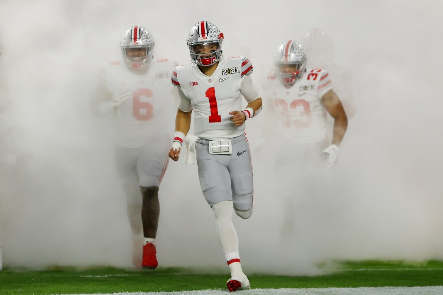 MIAMI GARDENS, FLORIDA – JANUARY 11: DeVonta Smith #6 of the Alabama Crimson Tide rushes for a five yard touchdown during the second quarter of the College Football Playoff National Championship game against the Ohio State Buckeyes at Hard Rock Stadium on January 11, 2021 in Miami Gardens, Florida. (Photo by Mike Ehrmann/Getty Images) MIAMI GARDENS, FLORIDA – JANUARY 11: Master Teague III #33 of the Ohio State Buckeyes rushes for an eight yard touchdown during the first quarter of the College Football Playoff National Championship game against the Alabama Crimson Tide at Hard Rock Stadium on January 11, 2021 in Miami Gardens, Florida. (Photo by Mike Ehrmann/Getty Images) MIAMI GARDENS, FLORIDA – JANUARY 11: The Ohio State Buckeyes take the field prior to the College Football Playoff National Championship game against the Alabama Crimson Tide at Hard Rock Stadium on January 11, 2021 in Miami Gardens, Florida. (Photo by Mike Ehrmann/Getty Images) MIAMI GARDENS, FLORIDA – JANUARY 11: Justin Hilliard #47 of the Ohio State Buckeyes reacts to a tackle during the first quarter of the College Football Playoff National Championship game against the Alabama Crimson Tide at Hard Rock Stadium on January 11, 2021 in Miami Gardens, Florida. (Photo by Sam Greenwood/Getty Images) MIAMI GARDENS, FLORIDA – JANUARY 11: Justin Hilliard #47 of the Ohio State Buckeyes reacts to a tackle during the first quarter of the College Football Playoff National Championship game against the Alabama Crimson Tide at Hard Rock Stadium on January 11, 2021 in Miami Gardens, Florida. (Photo by Michael Reaves/Getty Images) MIAMI GARDENS, FLORIDA – JANUARY 11: Justin Hilliard #47 of the Ohio State Buckeyes tackles Najee Harris #22 of the Alabama Crimson Tide during the first quarter of the College Football Playoff National Championship game at Hard Rock Stadium on January 11, 2021 in Miami Gardens, Florida. (Photo by Michael Reaves/Getty Images) MIAMI GARDENS, FLORIDA – JANUARY 11: Justin Hilliard #47 of the Ohio State Buckeyes tackles Najee Harris #22 of the Alabama Crimson Tide during the first quarter of the College Football Playoff National Championship game at Hard Rock Stadium on January 11, 2021 in Miami Gardens, Florida. (Photo by Mike Ehrmann/Getty Images) MIAMI GARDENS, FLORIDA – JANUARY 11: John Metchie III #8 of the Alabama Crimson Tide rushes during the first quarter of the College Football Playoff National Championship game against the Ohio State Buckeyes at Hard Rock Stadium on January 11, 2021 in Miami Gardens, Florida. (Photo by Mike Ehrmann/Getty Images) MIAMI GARDENS, FLORIDA – JANUARY 11: DeVonta Smith #6 of the Alabama Crimson Tide is wrapped up by Marcus Williamson #21 of the Ohio State Buckeyesduring the first quarter of the College Football Playoff National Championship game at Hard Rock Stadium on January 11, 2021 in Miami Gardens, Florida. (Photo by Sam Greenwood/Getty Images) MIAMI GARDENS, FLORIDA – JANUARY 11: Master Teague III #33 of the Ohio State Buckeyes rushes for an eight yard touchdown during the first quarter of the College Football Playoff National Championship game against the Alabama Crimson Tide at Hard Rock Stadium on January 11, 2021 in Miami Gardens, Florida. (Photo by Sam Greenwood/Getty Images) MIAMI GARDENS, FLORIDA – JANUARY 11: Master Teague III #33 of the Ohio State Buckeyes rushes for an eight yard touchdown during the first quarter of the College Football Playoff National Championship game against the Alabama Crimson Tide at Hard Rock Stadium on January 11, 2021 in Miami Gardens, Florida. (Photo by Sam Greenwood/Getty Images) MIAMI GARDENS, FLORIDA – JANUARY 11: Head coach Ryan Day of the Ohio State Buckeyes reacts with Justin Fields #1 during the first quarter of the College Football Playoff National Championship game against the Alabama Crimson Tide at Hard Rock Stadium on January 11, 2021 in Miami Gardens, Florida. (Photo by Michael Reaves/Getty Images) MIAMI GARDENS, FLORIDA – JANUARY 11: Justin Fields #1 of the Ohio State Buckeyes celebrates a touchdown during the first quarter of the College Football Playoff National Championship game against the Alabama Crimson Tide at Hard Rock Stadium on January 11, 2021 in Miami Gardens, Florida. (Photo by Kevin C. Cox/Getty Images) MIAMI GARDENS, FLORIDA – JANUARY 11: Jeremy Ruckert #88 of the Ohio State Buckeyes reacts during the first quarter of the College Football Playoff National Championship game against the Alabama Crimson Tide at Hard Rock Stadium on January 11, 2021 in Miami Gardens, Florida. (Photo by Sam Greenwood/Getty Images) MIAMI GARDENS, FLORIDA – JANUARY 11: Jeremy Ruckert #88 of the Ohio State Buckeyes reaches for a catch ahead of Christian Harris #8 of the Alabama Crimson Tide during the first quarter of the College Football Playoff National Championship game at Hard Rock Stadium on January 11, 2021 in Miami Gardens, Florida. (Photo by Michael Reaves/Getty Images) MIAMI GARDENS, FLORIDA – JANUARY 11: Jeremy Ruckert #88 of the Ohio State Buckeyes reaches for a catch ahead of Christian Harris #8 of the Alabama Crimson Tide during the first quarter of the College Football Playoff National Championship game at Hard Rock Stadium on January 11, 2021 in Miami Gardens, Florida. (Photo by Michael Reaves/Getty Images) MIAMI GARDENS, FLORIDA – JANUARY 11: Master Teague III #33 of the Ohio State Buckeyes rushes for an eight yard touchdown during the first quarter of the College Football Playoff National Championship game against the Alabama Crimson Tide at Hard Rock Stadium on January 11, 2021 in Miami Gardens, Florida. (Photo by Mike Ehrmann/Getty Images) MIAMI GARDENS, FLORIDA – JANUARY 11: Jeremy Ruckert #88 of the Ohio State Buckeyes reacts during the first quarter of the College Football Playoff National Championship game against the Alabama Crimson Tide at Hard Rock Stadium on January 11, 2021 in Miami Gardens, Florida. (Photo by Mike Ehrmann/Getty Images) MIAMI GARDENS, FLORIDA – 