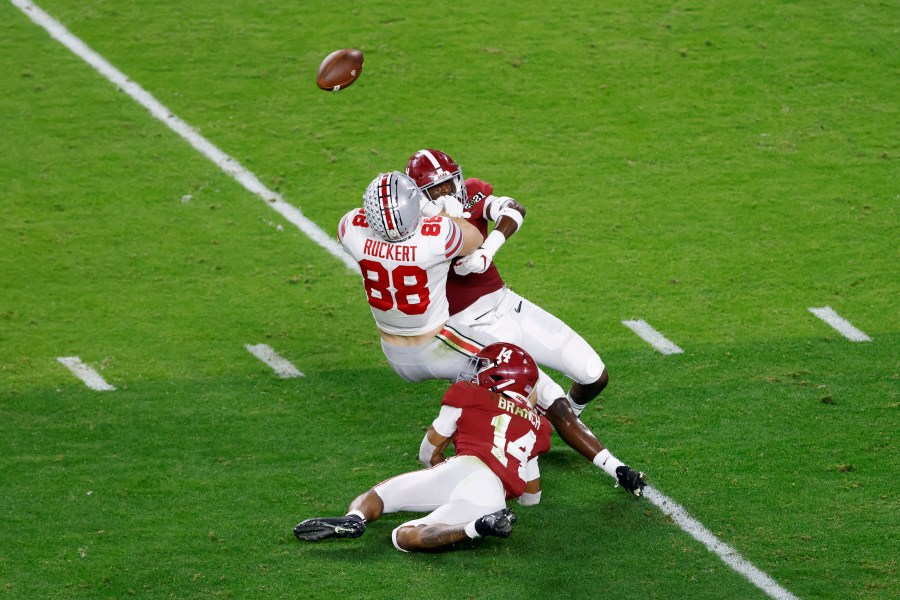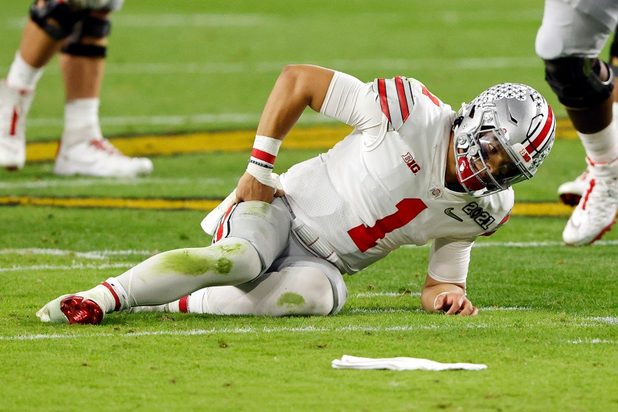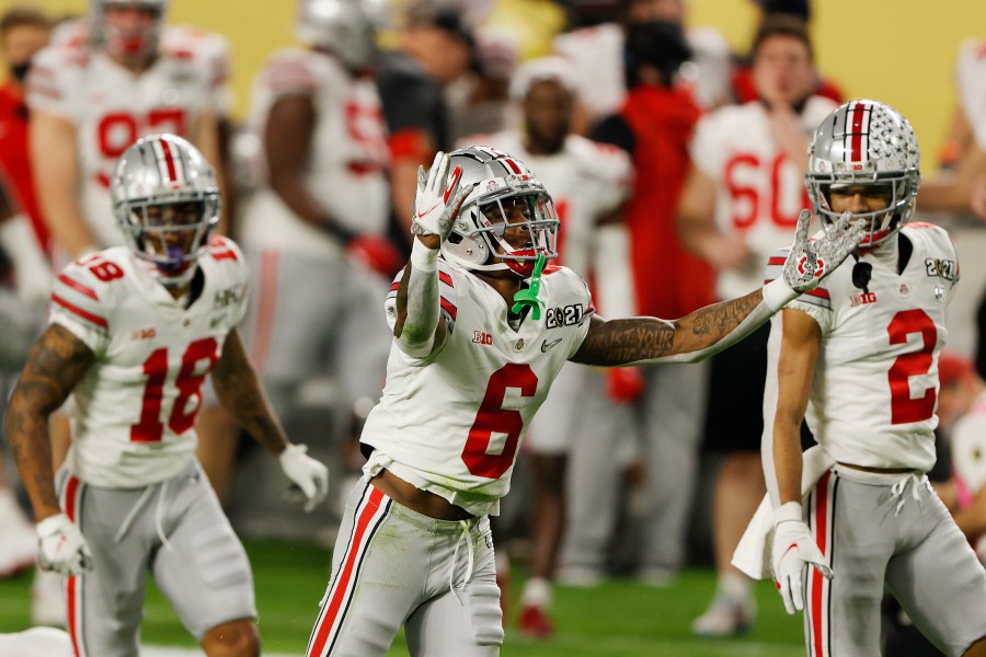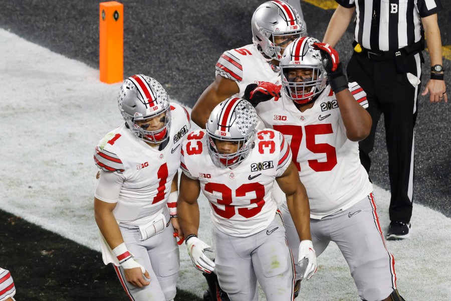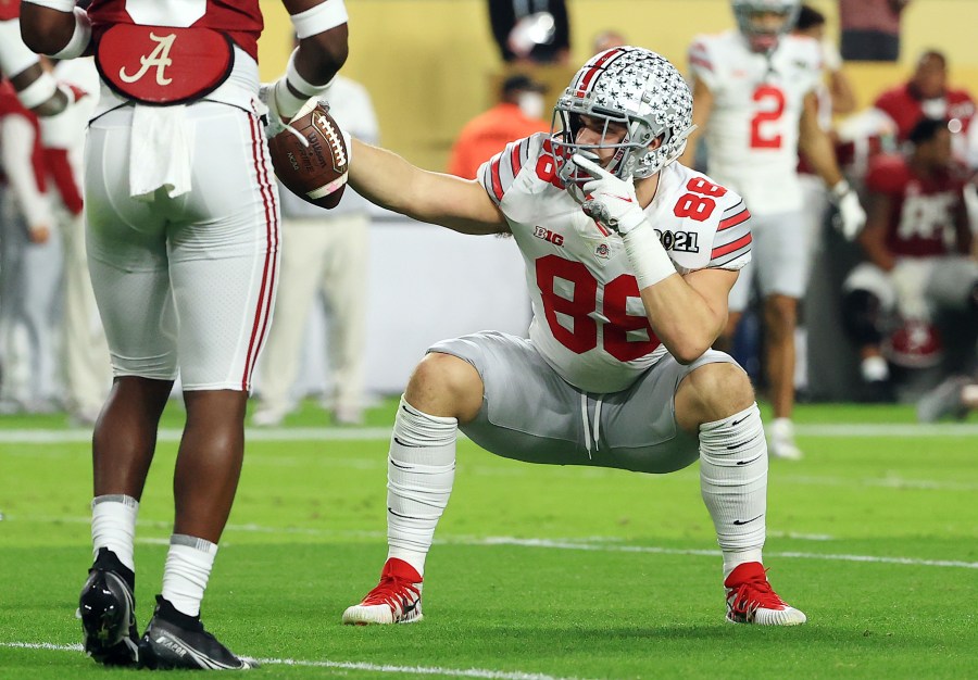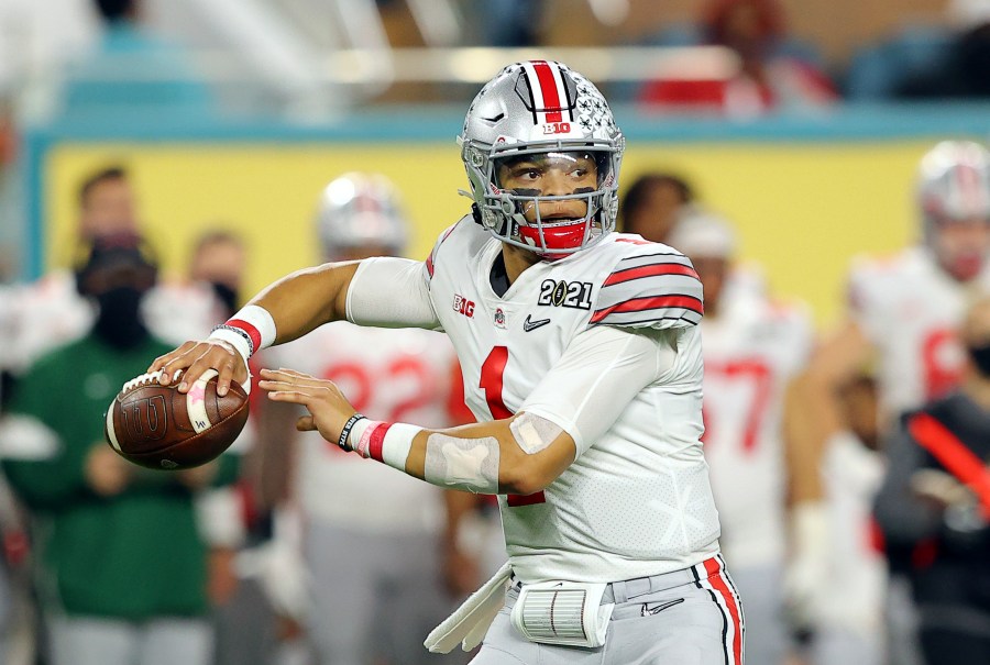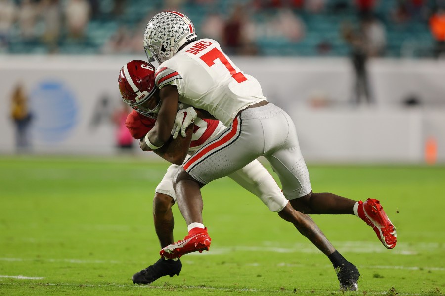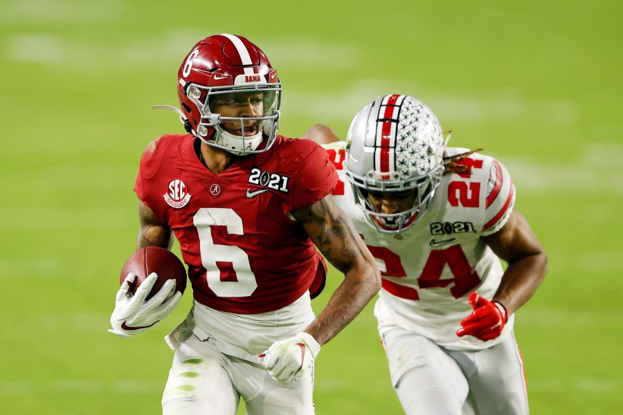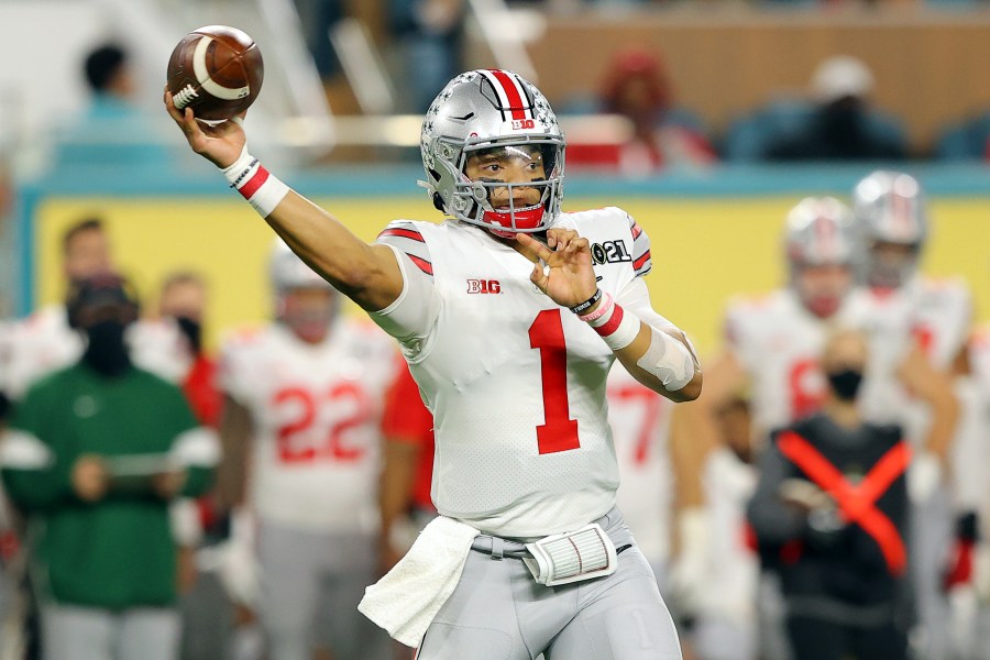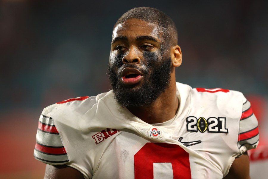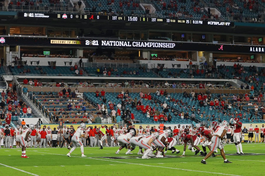 MIAMI GARDENS, FLORIDA – JANUARY 11: DeVonta Smith #6 of the Alabama Crimson Tide rushes for a five yard touchdown during the second quarter of the College Football Playoff National Championship game against the Ohio State Buckeyes at Hard Rock Stadium on January 11, 2021 in Miami Gardens, Florida. (Photo by Mike Ehrmann/Getty Images) MIAMI GARDENS, FLORIDA – JANUARY 11: Master Teague III #33 of the Ohio State Buckeyes rushes for an eight yard touchdown during the first quarter of the College Football Playoff National Championship game against the Alabama Crimson Tide at Hard Rock Stadium on January 11, 2021 in Miami Gardens, Florida. (Photo by Mike Ehrmann/Getty Images) MIAMI GARDENS, FLORIDA – JANUARY 11: The Ohio State Buckeyes take the field prior to the College Football Playoff National Championship game against the Alabama Crimson Tide at Hard Rock Stadium on January 11, 2021 in Miami Gardens, Florida. (Photo by Mike Ehrmann/Getty Images) MIAMI GARDENS, FLORIDA – JANUARY 11: Justin Hilliard #47 of the Ohio State Buckeyes reacts to a tackle during the first quarter of the College Football Playoff National Championship game against the Alabama Crimson Tide at Hard Rock Stadium on January 11, 2021 in Miami Gardens, Florida. (Photo by Sam Greenwood/Getty Images) MIAMI GARDENS, FLORIDA – JANUARY 11: Justin Hilliard #47 of the Ohio State Buckeyes reacts to a tackle during the first quarter of the College Football Playoff National Championship game against the Alabama Crimson Tide at Hard Rock Stadium on January 11, 2021 in Miami Gardens, Florida. (Photo by Michael Reaves/Getty Images) MIAMI GARDENS, FLORIDA – JANUARY 11: Justin Hilliard #47 of the Ohio State Buckeyes tackles Najee Harris #22 of the Alabama Crimson Tide during the first quarter of the College Football Playoff National Championship game at Hard Rock Stadium on January 11, 2021 in Miami Gardens, Florida. (Photo by Michael Reaves/Getty Images) MIAMI GARDENS, FLORIDA – JANUARY 11: Justin Hilliard #47 of the Ohio State Buckeyes tackles Najee Harris #22 of the Alabama Crimson Tide during the first quarter of the College Football Playoff National Championship game at Hard Rock Stadium on January 11, 2021 in Miami Gardens, Florida. (Photo by Mike Ehrmann/Getty Images) MIAMI GARDENS, FLORIDA – JANUARY 11: John Metchie III #8 of the Alabama Crimson Tide rushes during the first quarter of the College Football Playoff National Championship game against the Ohio State Buckeyes at Hard Rock Stadium on January 11, 2021 in Miami Gardens, Florida. (Photo by Mike Ehrmann/Getty Images) MIAMI GARDENS, FLORIDA – JANUARY 11: DeVonta Smith #6 of the Alabama Crimson Tide is wrapped up by Marcus Williamson #21 of the Ohio State Buckeyesduring the first quarter of the College Football Playoff National Championship game at Hard Rock Stadium on January 11, 2021 in Miami Gardens, Florida. (Photo by Sam Greenwood/Getty Images) MIAMI GARDENS, FLORIDA – JANUARY 11: Master Teague III #33 of the Ohio State Buckeyes rushes for an eight yard touchdown during the first quarter of the College Football Playoff National Championship game against the Alabama Crimson Tide at Hard Rock Stadium on January 11, 2021 in Miami Gardens, Florida. (Photo by Sam Greenwood/Getty Images) MIAMI GARDENS, FLORIDA – JANUARY 11: Master Teague III #33 of the Ohio State Buckeyes rushes for an eight yard touchdown during the first quarter of the College Football Playoff National Championship game against the Alabama Crimson Tide at Hard Rock Stadium on January 11, 2021 in Miami Gardens, Florida. (Photo by Sam Greenwood/Getty Images) MIAMI GARDENS, FLORIDA – JANUARY 11: Head coach Ryan Day of the Ohio State Buckeyes reacts with Justin Fields #1 during the first quarter of the College Football Playoff National Championship game against the Alabama Crimson Tide at Hard Rock Stadium on January 11, 2021 in Miami Gardens, Florida. (Photo by Michael Reaves/Getty Images) MIAMI GARDENS, FLORIDA – JANUARY 11: Justin Fields #1 of the Ohio State Buckeyes celebrates a touchdown during the first quarter of the College Football Playoff National Championship game against the Alabama Crimson Tide at Hard Rock Stadium on January 11, 2021 in Miami Gardens, Florida. (Photo by Kevin C. Cox/Getty Images) MIAMI GARDENS, FLORIDA – JANUARY 11: Jeremy Ruckert #88 of the Ohio State Buckeyes reacts during the first quarter of the College Football Playoff National Championship game against the Alabama Crimson Tide at Hard Rock Stadium on January 11, 2021 in Miami Gardens, Florida. (Photo by Sam Greenwood/Getty Images) MIAMI GARDENS, FLORIDA – JANUARY 11: Jeremy Ruckert #88 of the Ohio State Buckeyes reaches for a catch ahead of Christian Harris #8 of the Alabama Crimson Tide during the first quarter of the College Football Playoff National Championship game at Hard Rock Stadium on January 11, 2021 in Miami Gardens, Florida. (Photo by Michael Reaves/Getty Images) MIAMI GARDENS, FLORIDA – JANUARY 11: Jeremy Ruckert #88 of the Ohio State Buckeyes reaches for a catch ahead of Christian Harris #8 of the Alabama Crimson Tide during the first quarter of the College Football Playoff National Championship game at Hard Rock Stadium on January 11, 2021 in Miami Gardens, Florida. (Photo by Michael Reaves/Getty Images) MIAMI GARDENS, FLORIDA – JANUARY 11: Master Teague III #33 of the Ohio State Buckeyes rushes for an eight yard touchdown during the first quarter of the College Football Playoff National Championship game against the Alabama Crimson Tide at Hard Rock Stadium on January 11, 2021 in Miami Gardens, Florida. (Photo by Mike Ehrmann/Getty Images) MIAMI GARDENS, FLORIDA – JANUARY 11: Jeremy Ruckert #88 of the Ohio State Buckeyes reacts during the first quarter of the College Football Playoff National Championship game against the Alabama Crimson Tide at Hard Rock Stadium on January 11, 2021 in Miami Gardens, Florida. (Photo by Mike Ehrmann/Getty Images) MIAMI GARDENS, FLORIDA – 