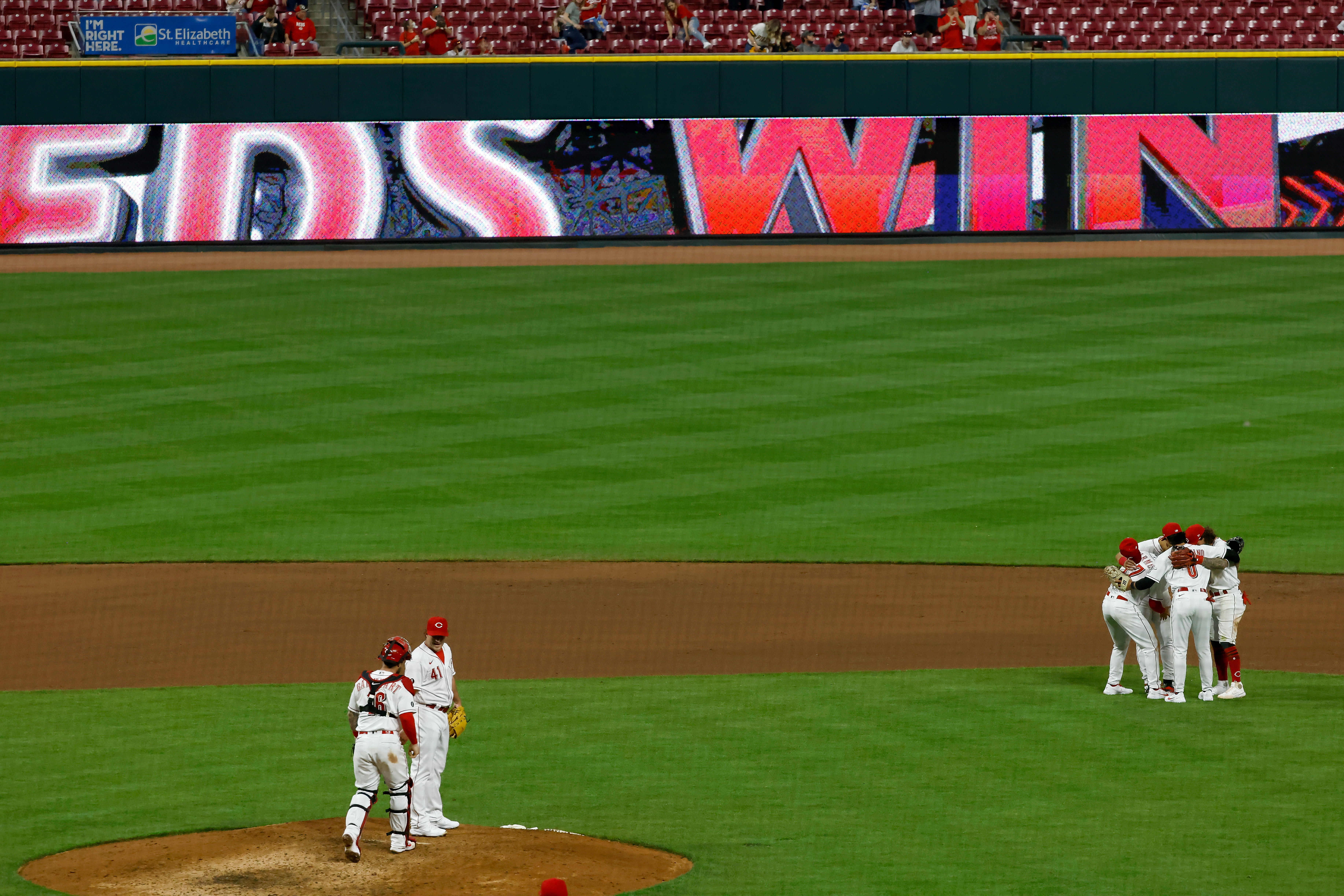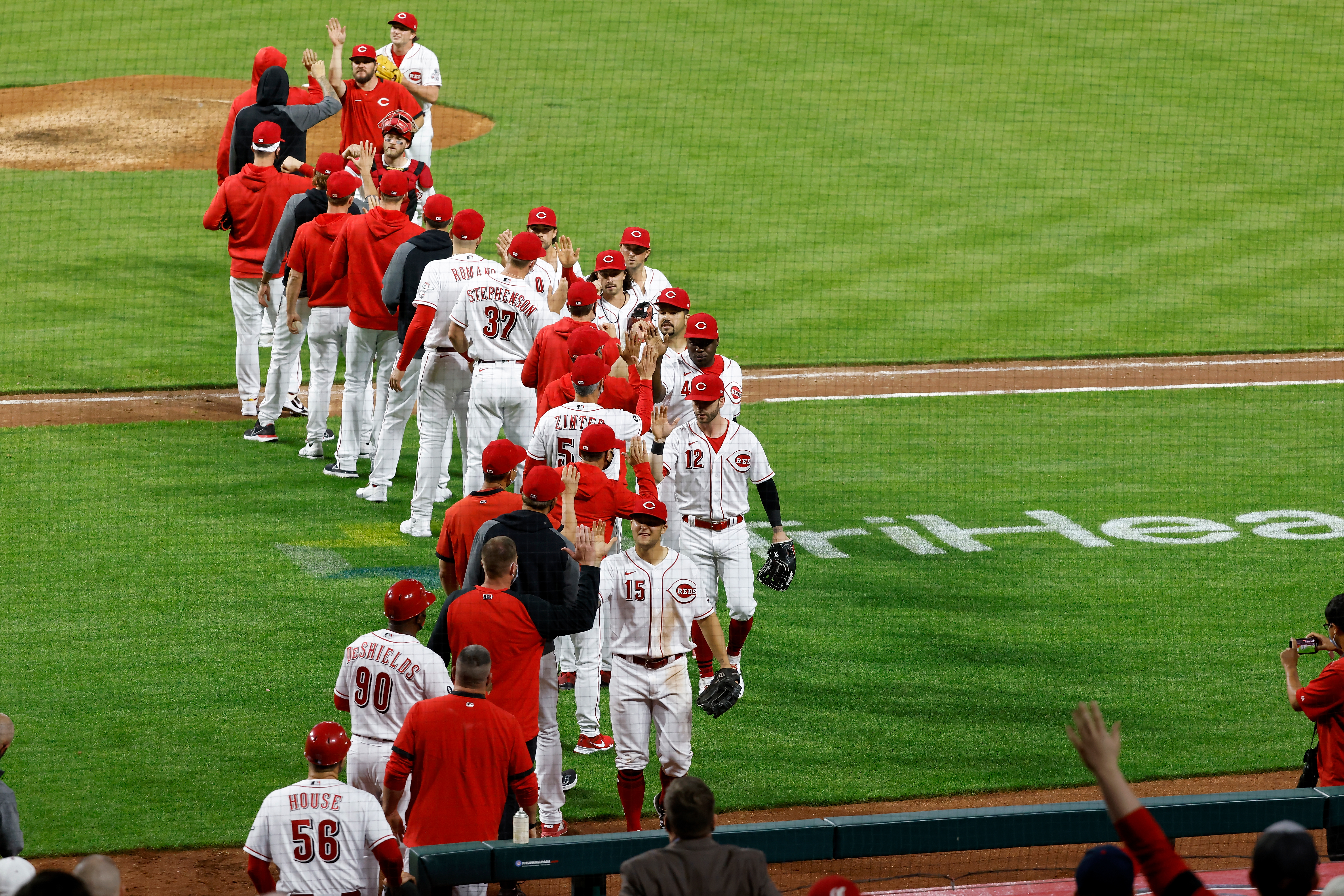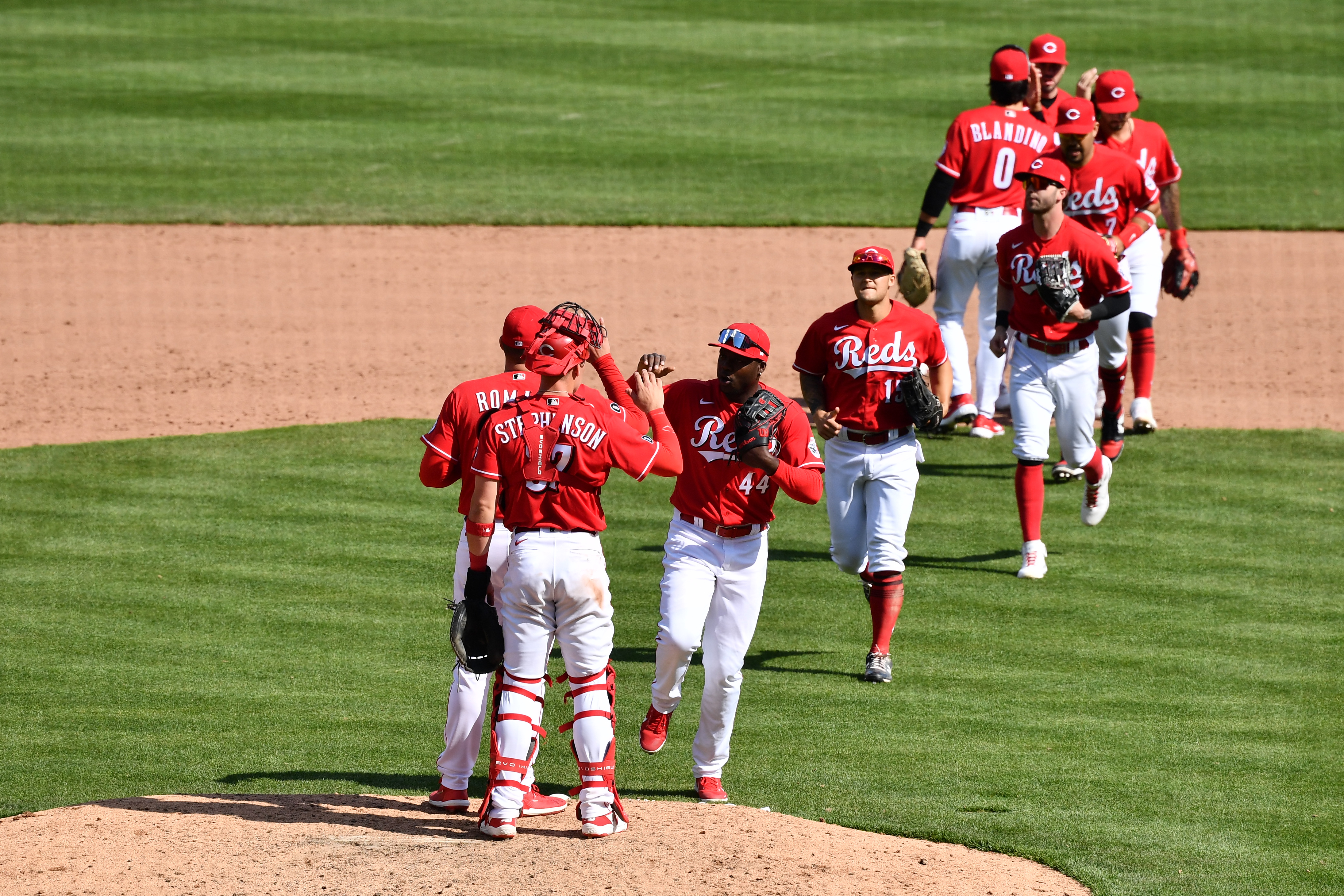 CINCINNATI, OH – APRIL 4: The Cincinnati Reds celebrate after defeating the St. Louis Cardinals 12-1 at Great American Ball Park on April 4, 2021 in Cincinnati, Ohio. (Photo by Jamie Sabau/Getty Images)