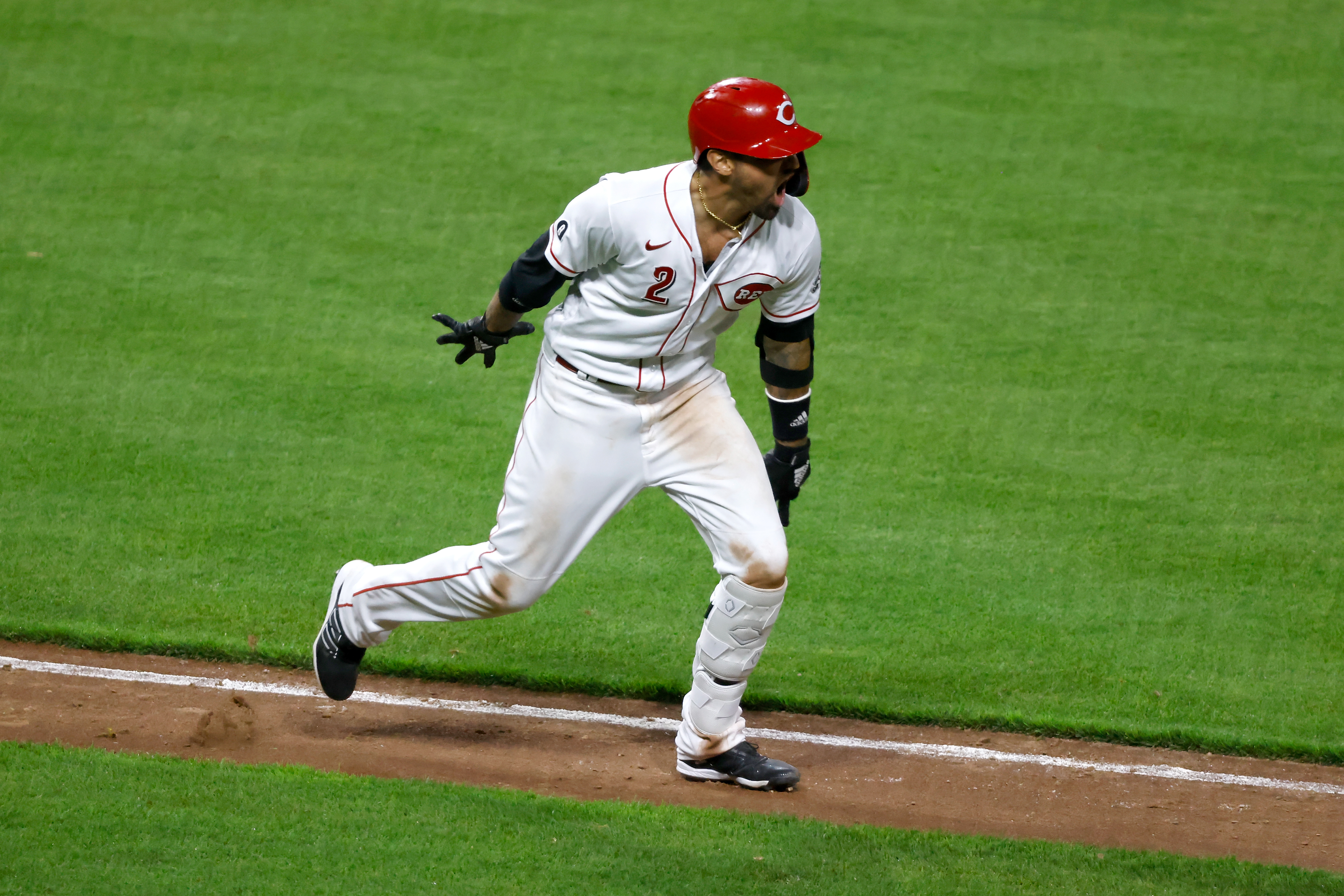 CINCINNATI, OH – APRIL 5: Nick Castellanos #2 of the Cincinnati Reds reacts after his solo home run in the seventh inning against the Pittsburgh Pirates at Great American Ball Park on April 5, 2021 in Cincinnati, Ohio. Cincinnati defeated Pittsburgh 5-3. (Photo by Kirk Irwin/Getty Images)