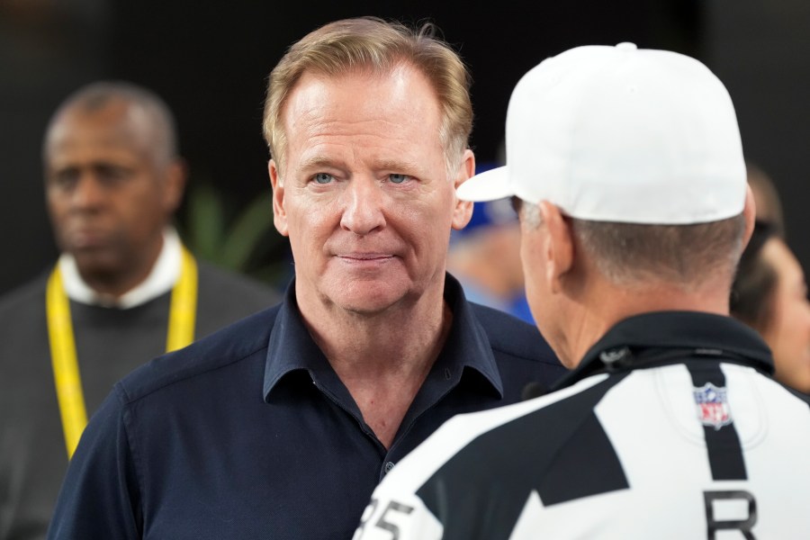 NFL Commissioner Roger Goodell, left, talks with Referee John Hussey before an NFL wild card playoff football game between the Los Angeles Rams and Minnesota Vikings, Monday, Jan. 13, 2025, in Glendale, Ariz. (AP Photo/Ross D. Franklin)