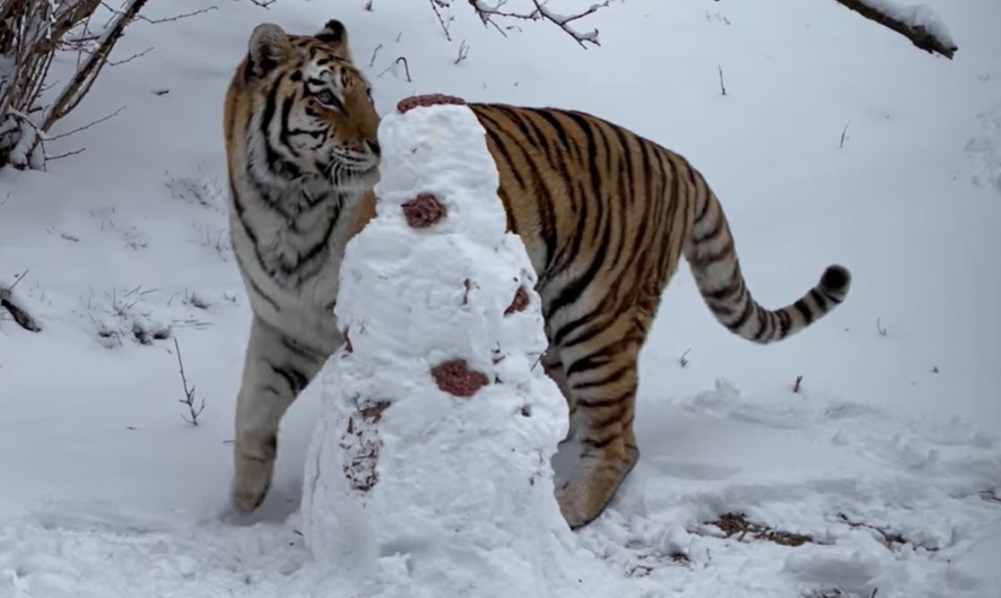 Tiger gets meat-laced snowman to munch