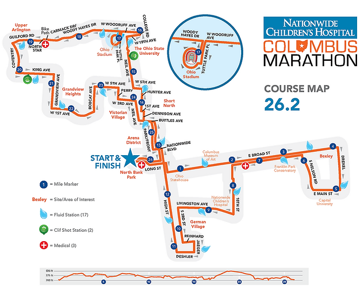Sunday, Oct. 20 – The Columbus Marathon & ½ Marathon — 7:25 a.m. wheelchair division starts; 7:30 a.m. Marathon & ½ Marathon starts