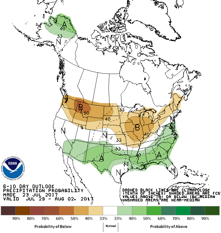 July has been pretty wet so far, but the forecast looks drier ending the month and starting August.  Below is the 6-10 day outlook from the Climate Prediction Center.