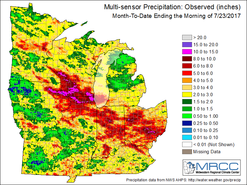 This map shows observed rainfall for the month of July, ending yesterday morning. (not including yesterday’s rainfall).