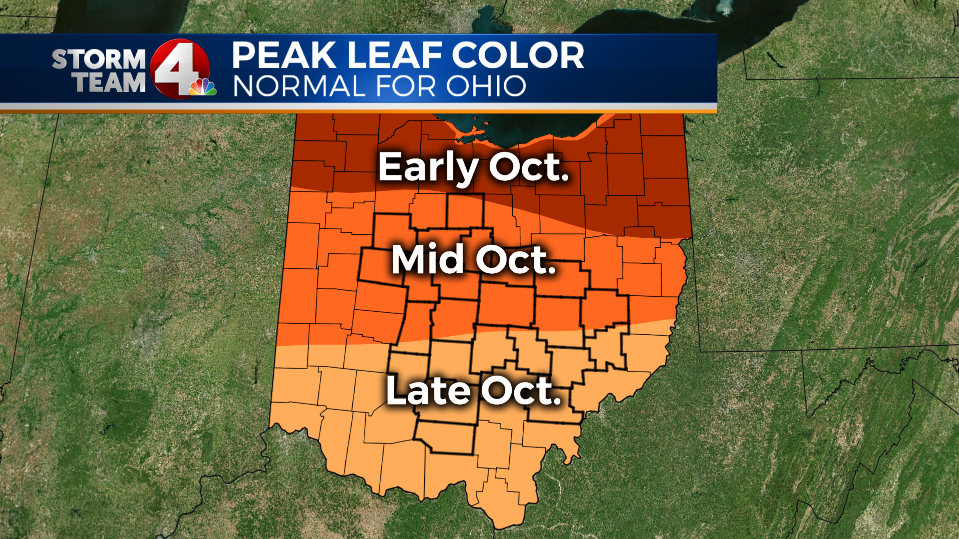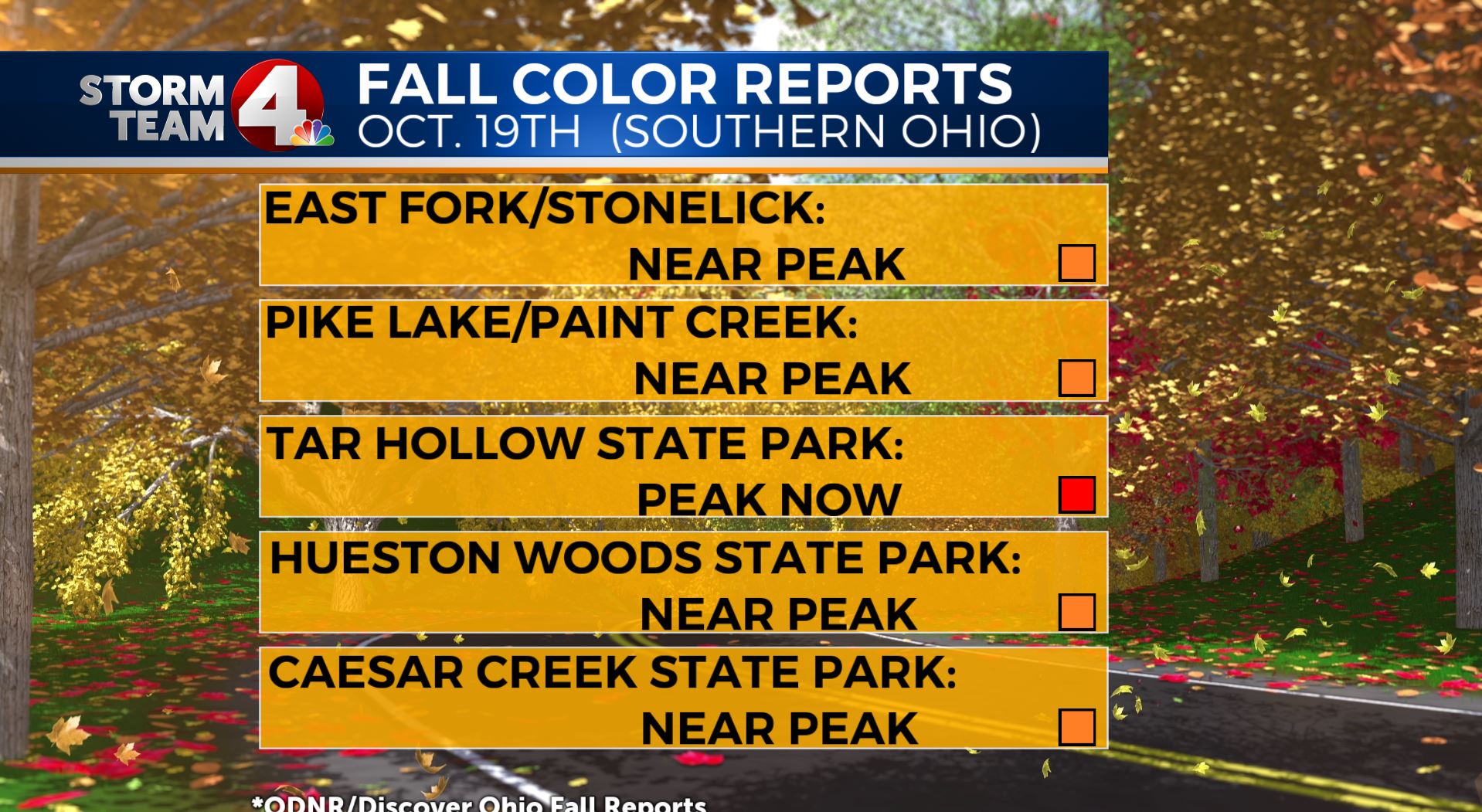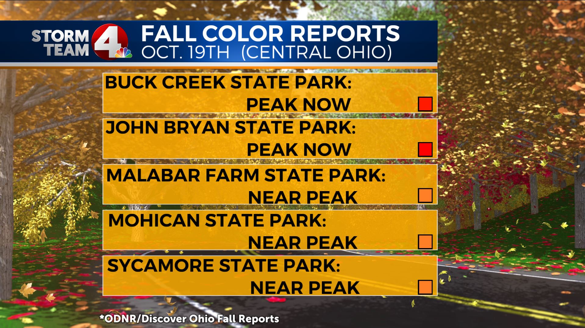 Also, do not forget the warm coat if you are going to be out and about leaf peeping this weekend, as temps will be in the 50s on Saturday, and low/mid 60s on Sunday.In the Northern Ohio peak colors are showing up at some parks, & many will be there after the big chill this weekend: