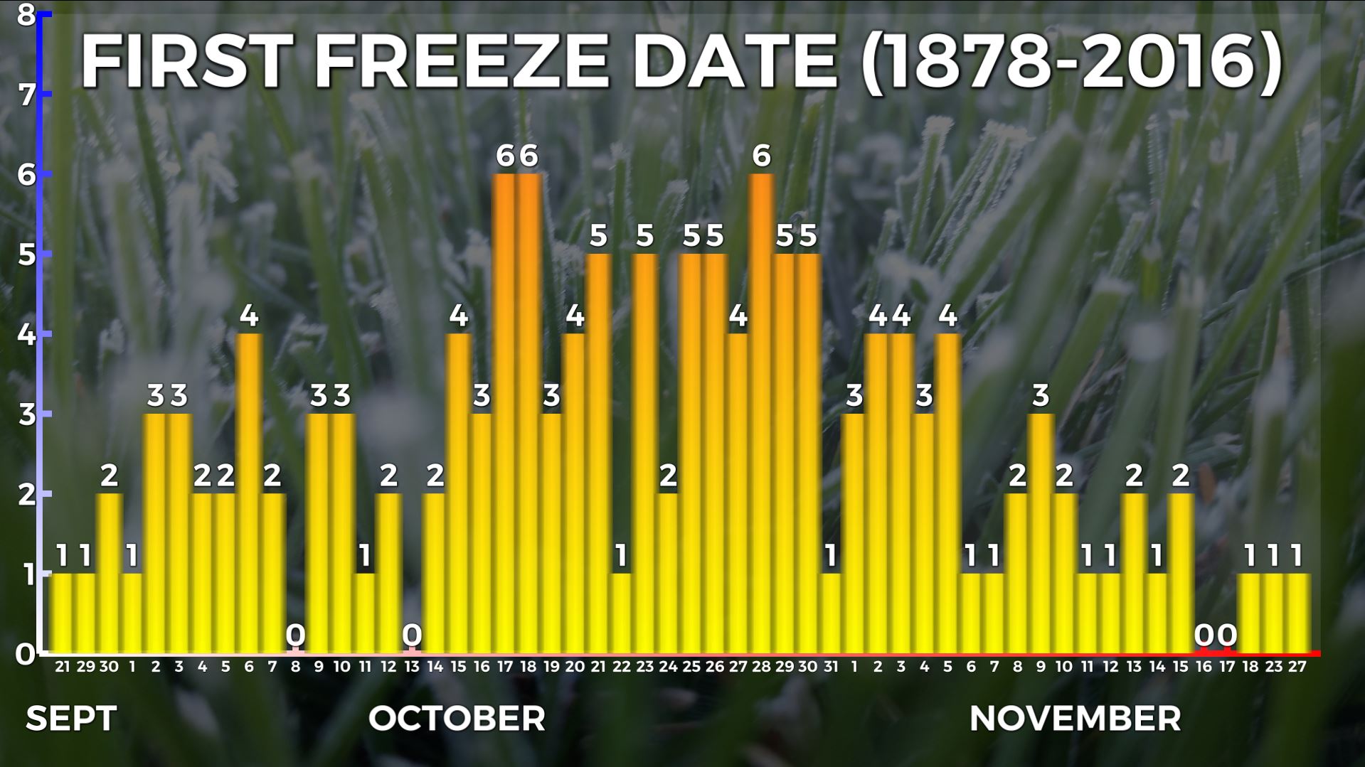 Below is a listing of the average first freeze dates in our area according to the National Weather Service records:
