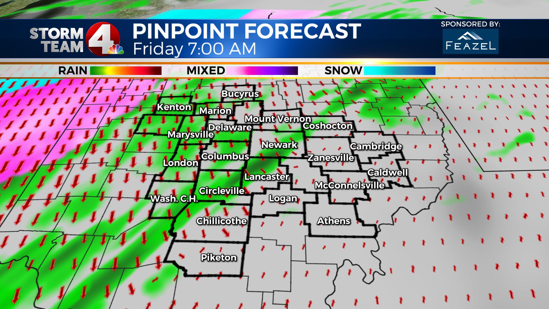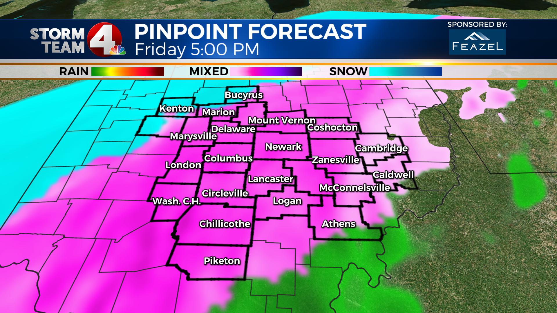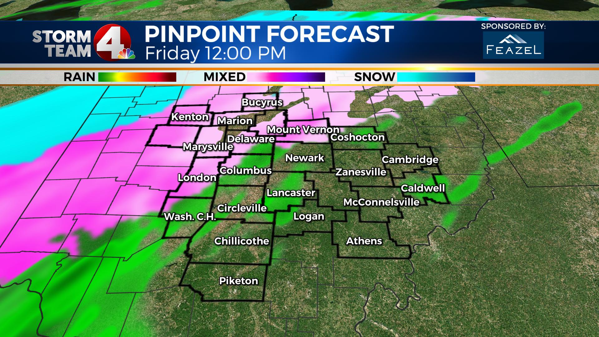 Below you can see the forecast for noon on Friday, and this is when we will start seeing a mix of rain, sleet, and snow to the west of I-71, but still rain showers east of I-71.