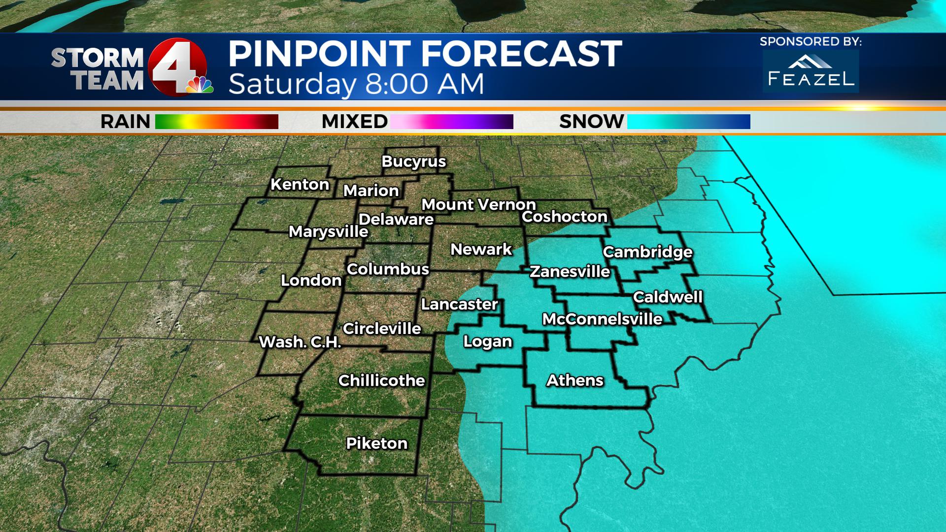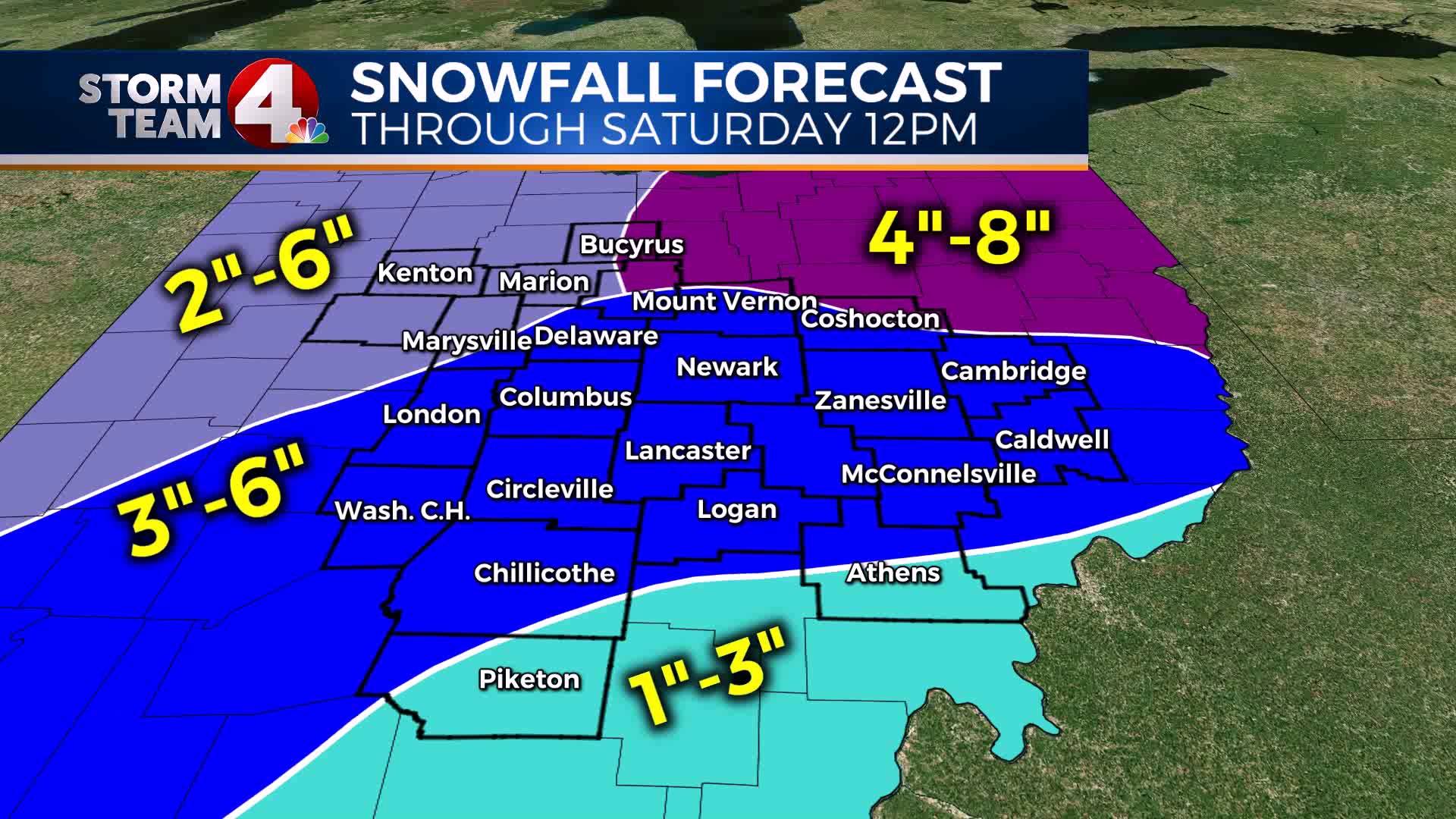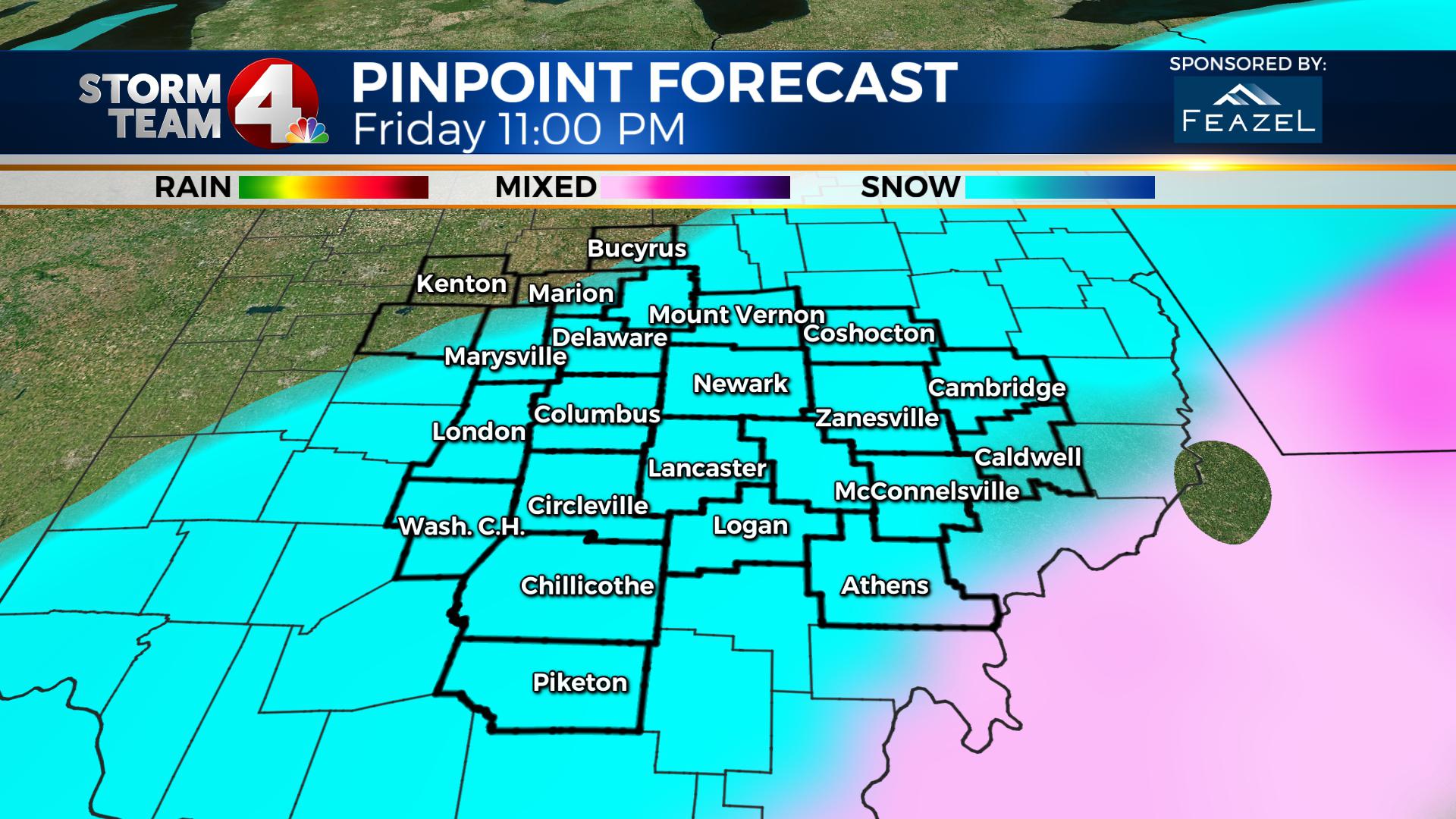 As you notice as we head through Friday night and into Saturday morning, the heaviest band of snow will head up I-71, through northeast Ohio where temperatures will be the coldest and then up into northern Pennsylvania and northern New York. Because the northeast part of the state will see the longest period of cold weather and precipitation, I think that part of the state will see the heaviest snowfall totals as of now.