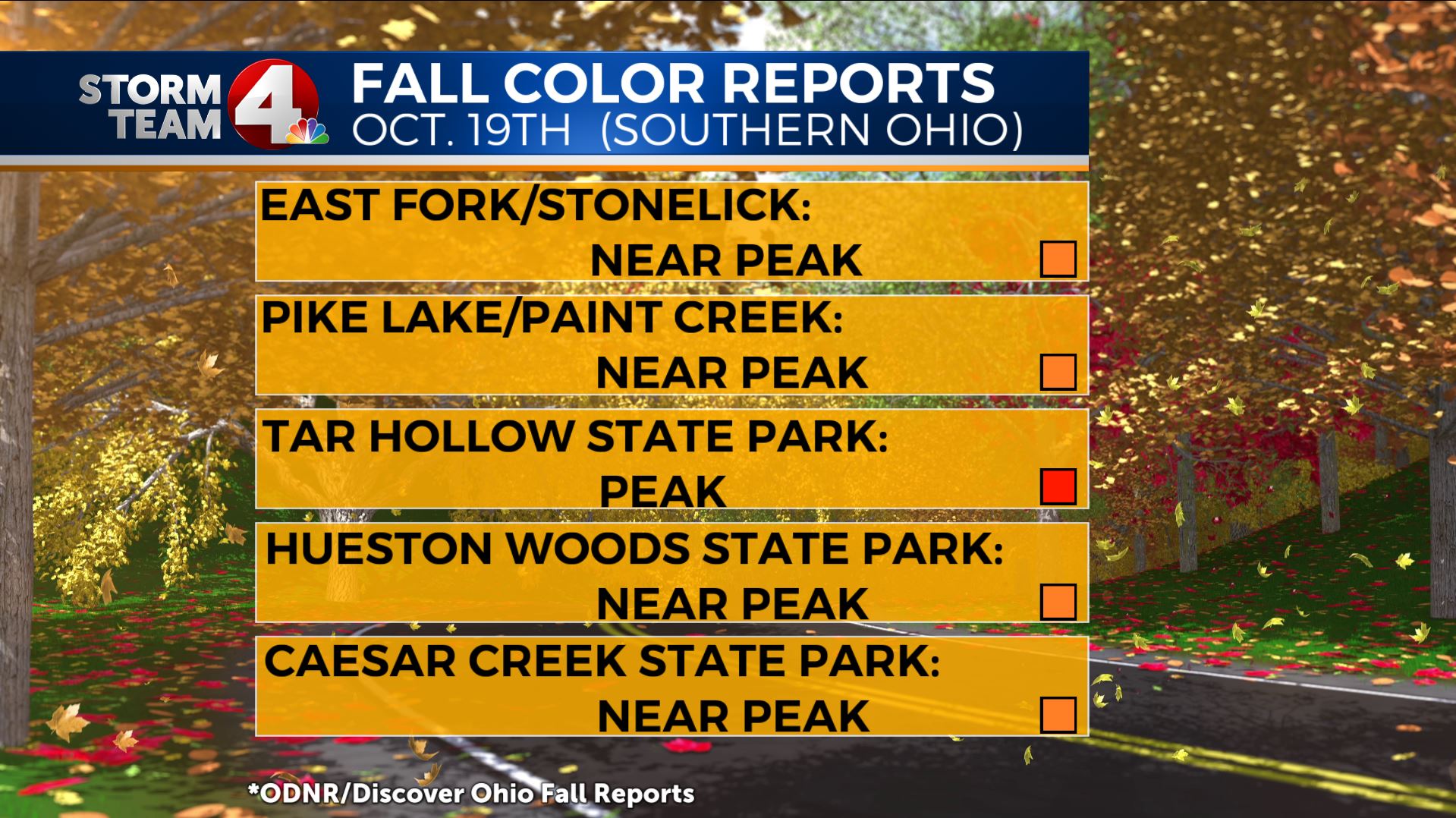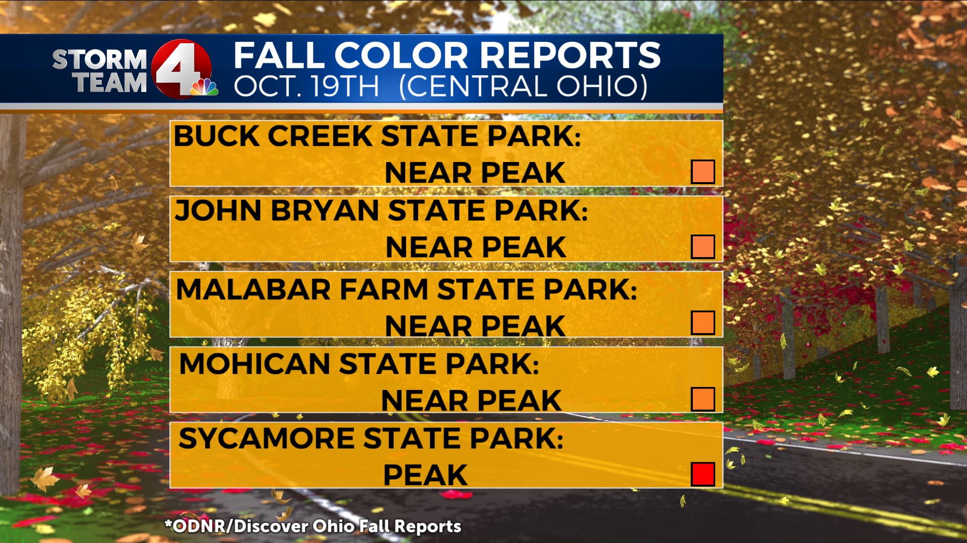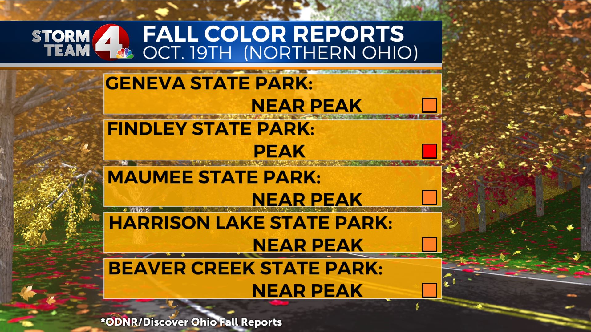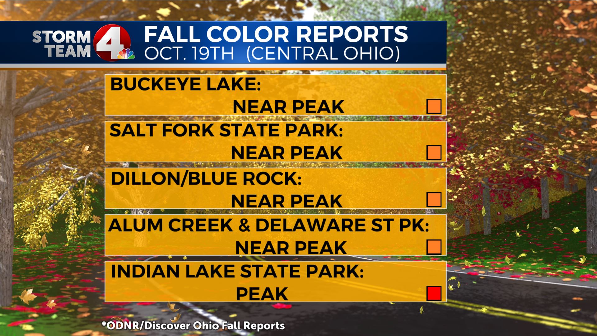 Indian Lake State Park is also reporting peak colors, with all other parks extending the “near peak” period.
