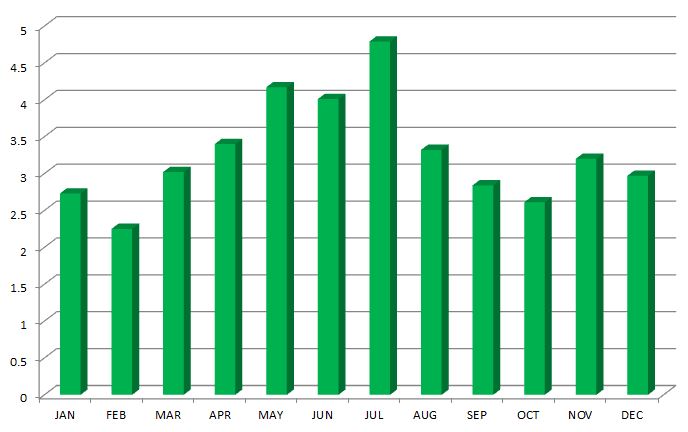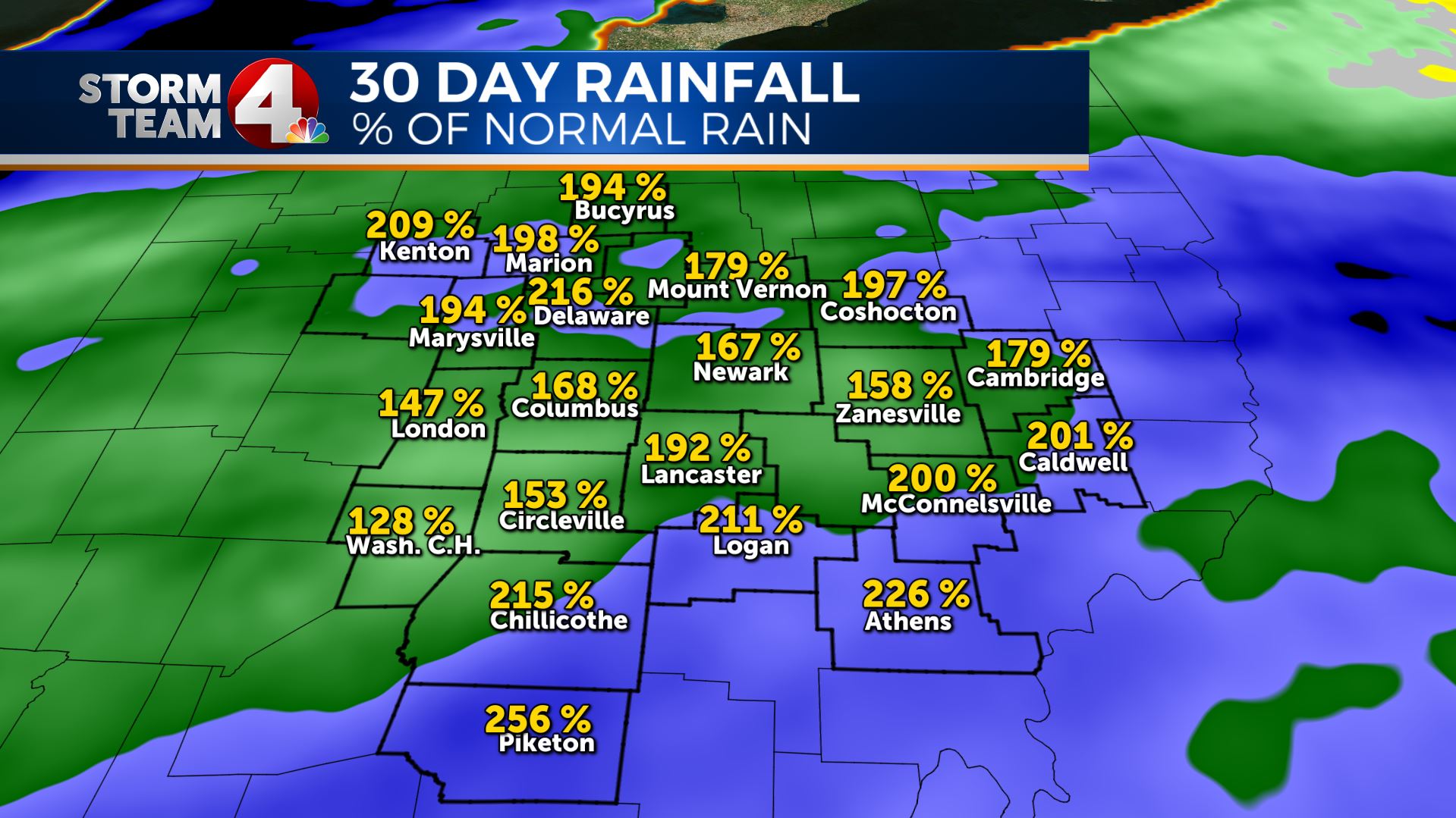 The graphic below shows percentage of normal rainfall for the past month. A number of 100% means we have had exactly normal rainfall, anything above 100% means wetter than normal. Notice the area in green is between normal to twice the normal rainfall. But there are areas to the north that have had double the normal rainfall in the past 30 days. There are areas to the south that have picked up almost 2.5 times the normal rainfall.