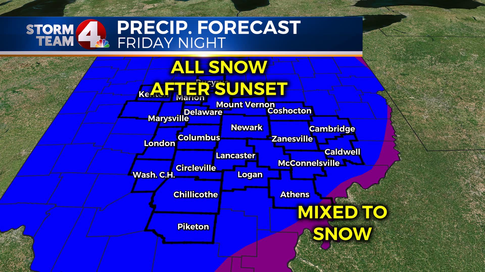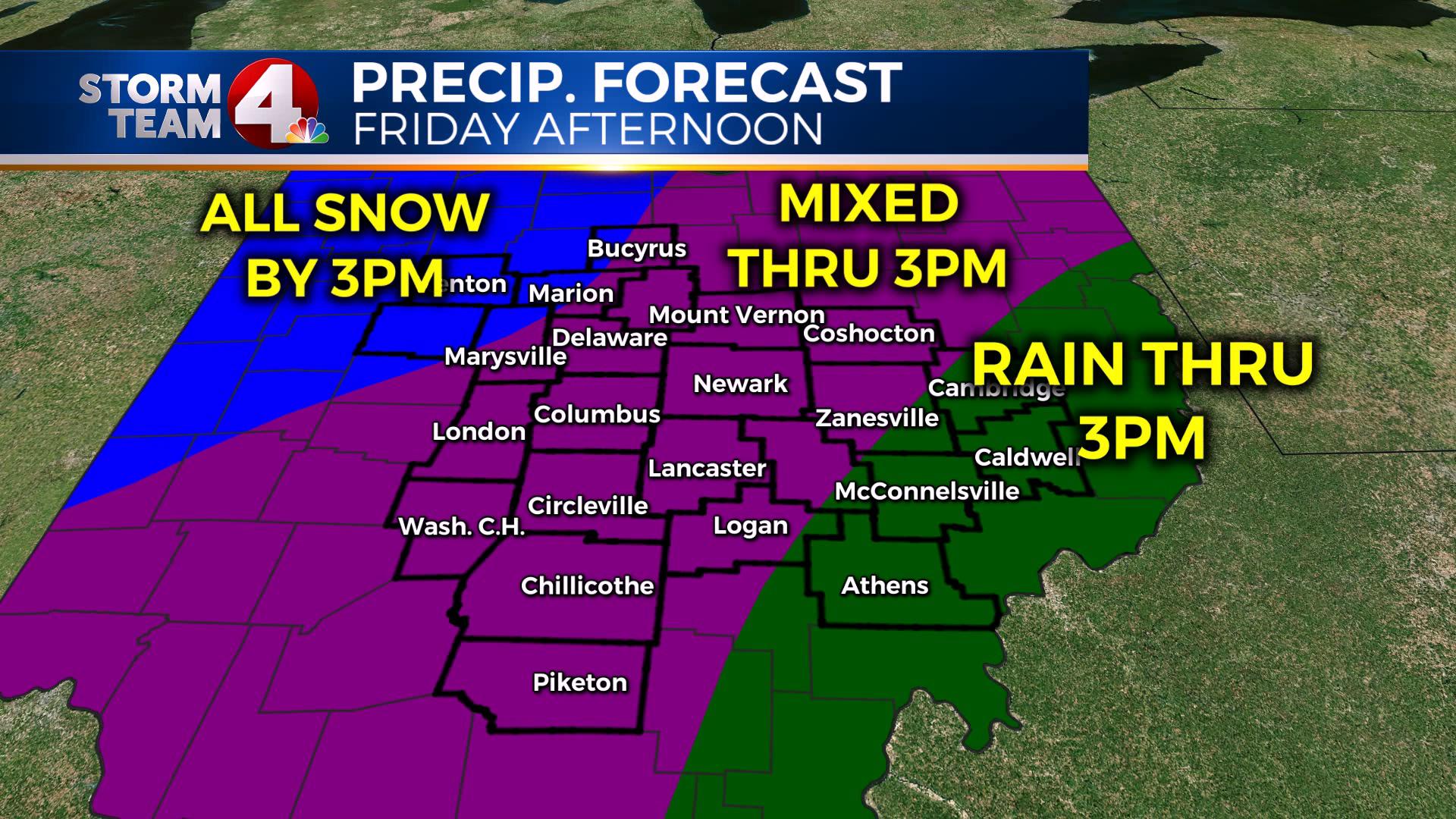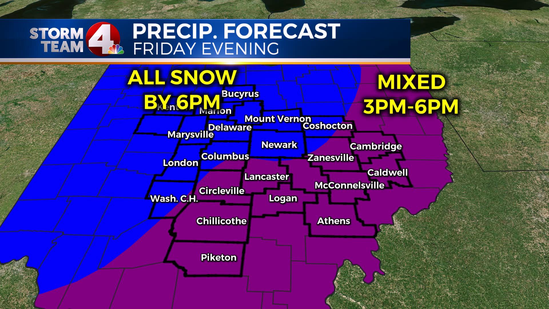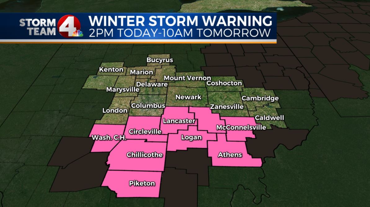 COLUMBUS (WCMH) – We are now just a few hours from this big winter storm coming into our area. For some of us, a MAJOR change will be occurring as soon as Friday morning. A Winter Weather Advisory is in effect starting at 10 a.m. along and north of I-70; a Winter Storm Warning is in effect for the southeastern half of the state through 10 a.m. on Saturday.