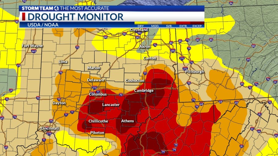 The latest U.S. Drought Monitor shows D4-exceptional drought affecting areas southeast of Columbus, and D3-extreme drought spreading north into the southern two-thirds of Franklin County that extends eastward to the Ohio River into West Virginia.