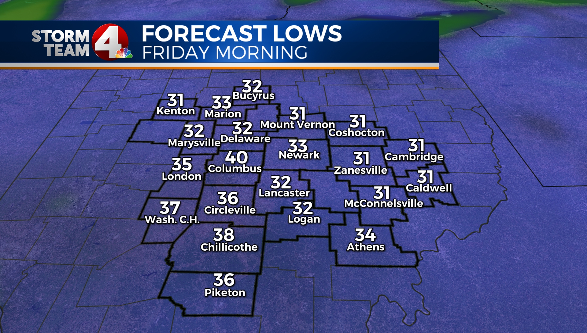 For the record, in 2015, we had our first temps near freezing in Central Ohio on October 15th, with our first Frost Advisory area-wide on the 16th. So we are right on track with last year, and about 2 weeks ahead of 2014.Here is a look at forecast low temps for Friday morning:
