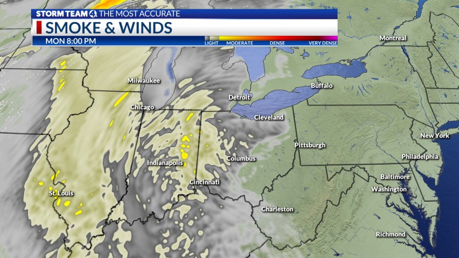 Much warmer conditions arrive by the start of the work week. Highs starting Monday will reach the upper 70s under mostly sunny skies. This will be the warmest day in central Ohio in over two weeks. Another round of Canadian wildfire smoke is forecast to move back into central Ohio by Monday evening.