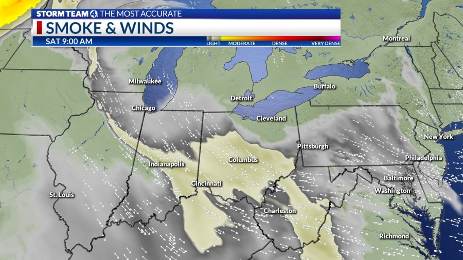 At the moment air quality index numbers within portion of central Ohio are in a range that may be unhealthy for sensitive groups. With a cold front moving through today and other factors, most of the smoke should clear by the evening. Speaking of clearing, skies will as the day progresses. Winds are going to be gusty at times. Expect high temperatures near 70 degrees.