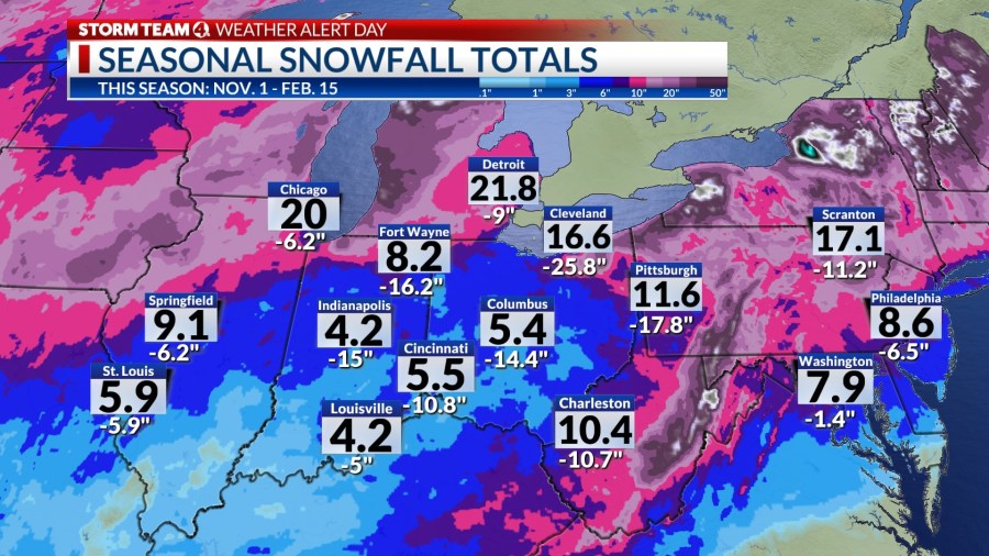 Snow has been mostly absent this winter, with only 5.4 inches in the Columbus area for the season, and no measurable snow since Jan. 20, when we received a little more than 2 inches. The snow drought has been widespread across the Midwest in a very mild winter, running as much as 10 to 25 inches below normal.