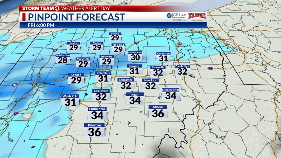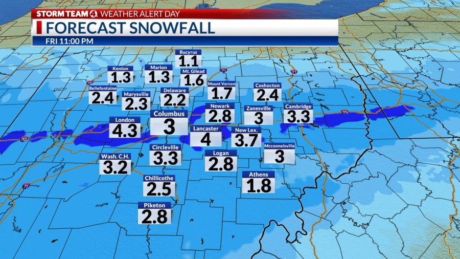 The snowfall in central Ohio will average 2 to 4 inches, with less in far north and south. A narrow band of 3 to 4 inches is most likely a little south of the I-70 corridor, though the exact placement could shift, depending on if the storm strengthens.