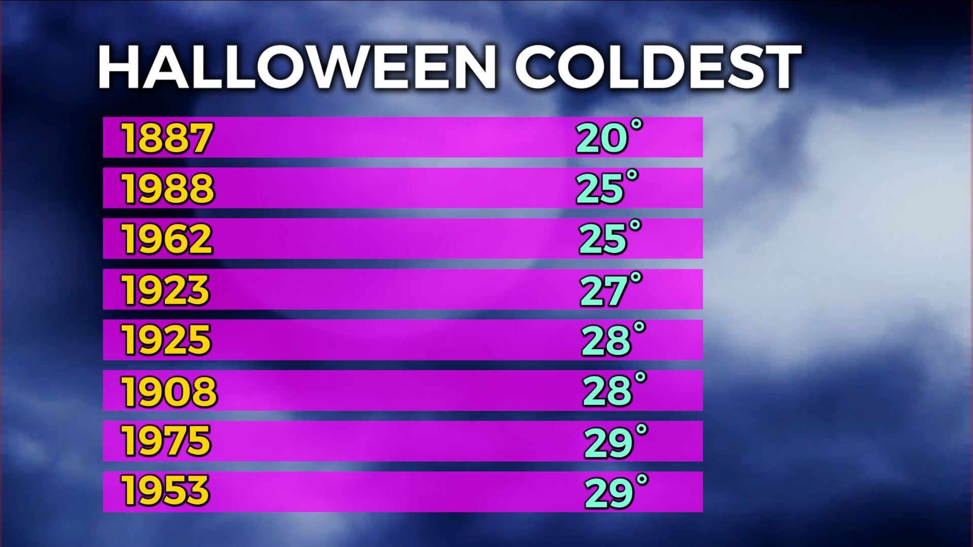 The coldest temp on Halloween was 20, the coldest high temp was only 38 (1906)