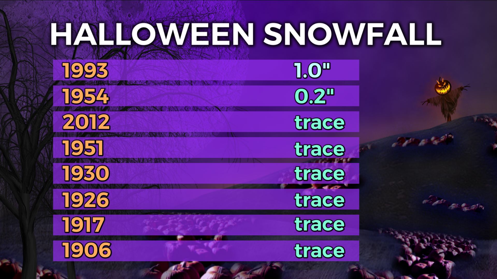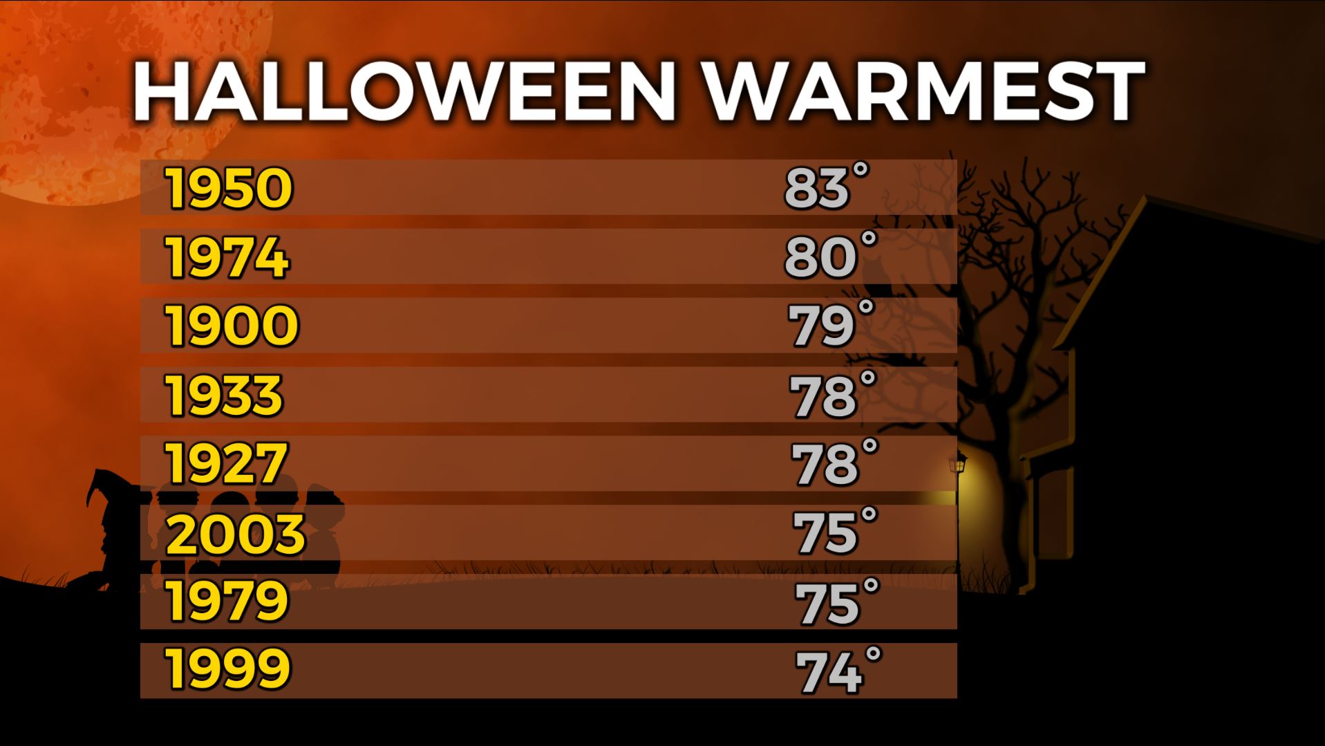 Columbus (WCMH) – Typically at the end of October, temps are starting to get a bit cooler, normal highs are near 60, lows are near 41. Since records began in 1878, we have seen temps as cool as 20 on Halloween, and as warm as 83.We have had snow 8 times on Halloween, 75% of the time it was only a dusting: