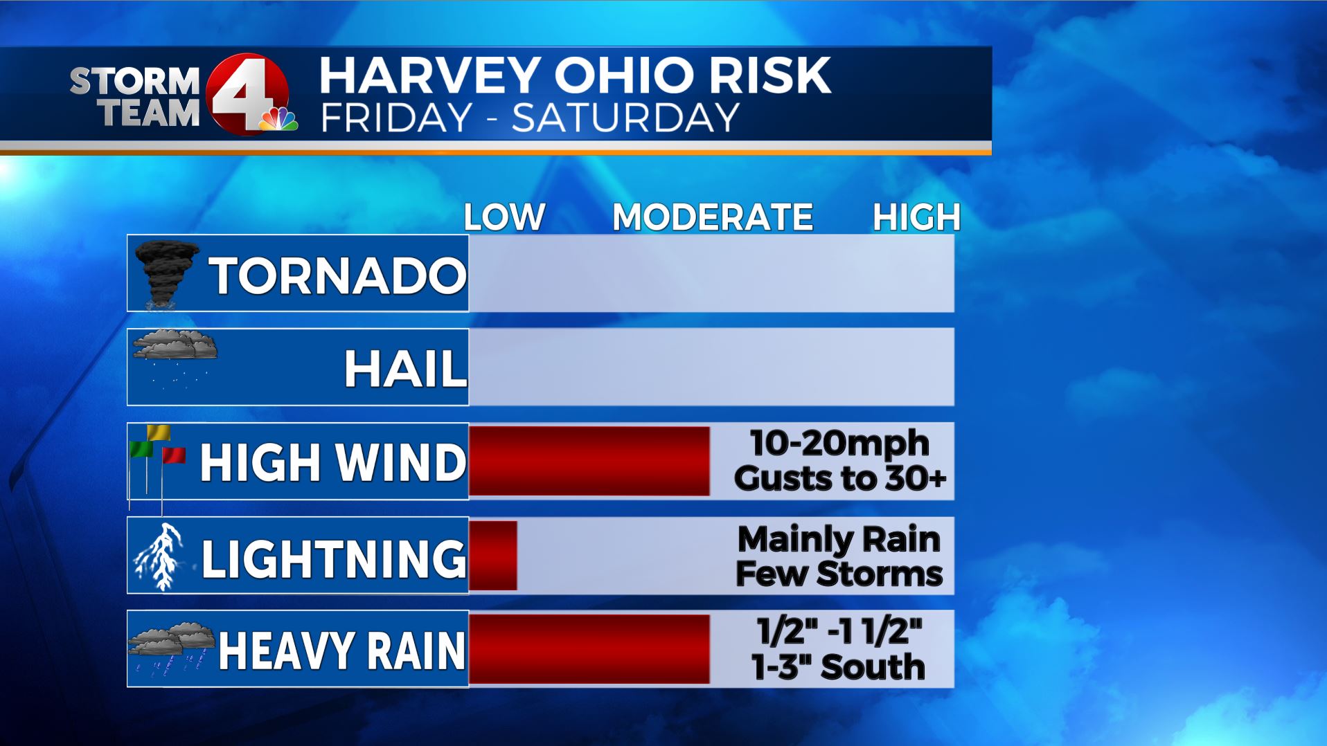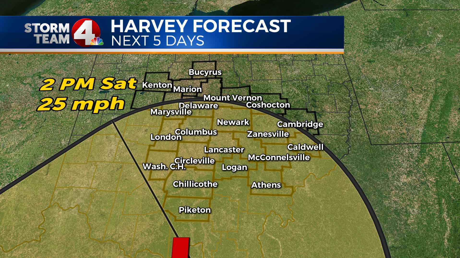 The official forecast for Harvey has it with winds at 25 miles per hour on Saturday when its near our area. At this point, I expect breezy conditions starting on Friday, with winds in the teens, and gusting above 30 miles per hour.