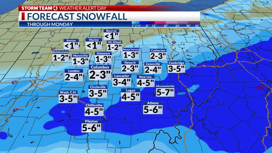 Several inches of snow have already fallen across portion of the metro area. Reports of heavier snow are coming in from counties south of the I-70 corridor. As a reference the NBC4 studios on Olentangy River Rd had already received 3.5 inches as snow as of 5 am.